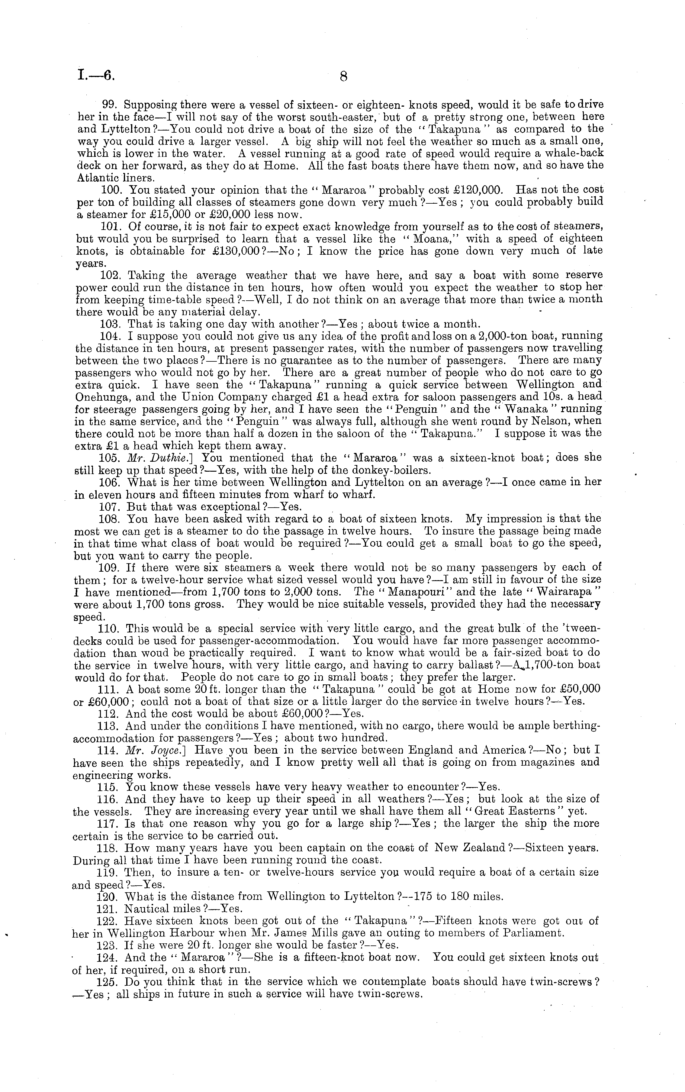99. Supposing there were a vessel of sixteen- or eighteen- knots speed, would it be safe to drive her in the face—l will not say of the worst south-easter, but of a pretty strong one, between here and Lyttelton?—You could not drive a boat of the size of the " Takapuna " as compared to the way you could drive a larger vessel. A big ship will not feel the weather so much as a small one, which is lower in the water. A vessel running at a good rate of speed would require a whale-back deck on her forward, as they do at Home. All the fast boats there have them now, and so have the Atlantic liners. 100. You stated your opinion that the " Mararoa " probably cost £120,000. Has not the cost per ton of building all classes of steamers gone down very much ?—Yes ; you could probably build a steamer for £15,000 or £20,000 less now. 101. Of course, it is not fair to expect exact knowledge from yourself as to the cost of steamers, but would you be surprised to learn that a vessel like the " Moana," with a speed of eighteen knots, is obtainable for £130,000? —No; I know the price has gone down very much of late years. 102. Taking the average weather that we have here, and say a boat with some reserve power could run the distance in ten hours, how often would you expect the weather to stop her from keeping time-table speed ? —Well, I do not think on an average that more than twice a month there would be any material delay. 103. That is taking one day with another?— Yes ; about twice a month. 104. I suppose you could not give us any idea of the profit and loss on a 2,000-ton boat, running the distance in ten hours, at present passenger rates, with the number of passengers now travelling between the two places? —There is no guarantee as to the number of passengers. There are many passengers who would not go by her. There are a great number of people who do not care to go extra quick. I have seen the "Takapuna" running a quick service between Wellington and Onehunga, and the Union Company charged £1 a head extra for saloon passengers and 10s. a head for steerage passengers going by her, and I have seen the "Penguin " and the " Wanaka " running in the same service, and the " Penguin " was always full, although she went round by Nelson, when there could not be more than half a dozen in the saloon of the " Takapuna." I suppose it was the extra £1 a head which kept them away. 105. Mr. Duthie.] You mentioned that the "Mararoa" was a sixteen-knot boat; does she still keep up that speed ?—Yes, with the help of the donkey-boilers. 106. What is her time between Wellington and Lyttelton on an average ?—I once came in her in eleven hours and fifteen minutes from wharf to wharf. 107. But that was exceptional ? —Yes. 108. You have been asked with regard to a boat of sixteen knots. My impression is that the most we can get is a steamer to do the passage in twelve hours. To insure the passage being made in that time what class of boat would be required ?—You could get a small boat to go the speed, but you want to carry the people. 109. If there were six steamers a week there would not be so many passengers by each of them; for a twelve-hour service what sized vessel would you have ?—I am still in favour of the size I have mentioned—from 1,700 tons to 2,000 tons. The " Manapouri" and the late " Wairarapa " were about 1,700 tons gross. They would be nice suitable vessels, provided they had the necessary speed. 110. This would be a special service with very little cargo, and the great bulk of the 'tweendecks could be used for passenger-accommodation. You would have far more passenger accommodation than woud be practically required. I want to know what would be a fair-sized boat to do the service in twelve hours, with very little cargo, and having to carry ballast ? —A..1,700-ton boat would do for that. People do not care to go in small boats ; they prefer the larger. 111. A boat some 20 ft. longer than the " Takapuna " could be got at Home now for £50,000 or £60,000; could not a boat of that size or a little larger do the service -in twelve hours ?—Yes. 112. And the cost would be about £60,000? —Yes. 113. And under the conditions I have mentioned, with no cargo, there would be ample berthingaccommodation for passengers?— Yes ; about two hundred. 114. Mr. Joyce.] Have you been in the service between England and America ?—No ; but I have seen the ships repeatedly, and I know pretty well all that is going on from magazines and engineering works. 115. You know these vessels have very heavy weather to encounter? —Yes. 116. And they have to keep up their speed in all weathers ? —Yes; but look at the size of the vessels. They are increasing every year until we shall have them all " Great Easterns " yet. 117. Is that one reason why you go for a large ship ?—Yes; the larger the ship the more certain is the service to be carried out. 118. How many years have you been captain on the coast of New Zealand ? —Sixteen years. During all that time I have been running round the coast. 119. Then, to insure a ten- or twelve-hours service you would require a boat of a certain size and speed?— Yes. 120. What is the distance from Wellington to Lyttelton ?—175 to 180 miles. 121. Nautical miles ?—Yes. 122. Have sixteen knots been got out of the "Takapuna"?—Fifteen knots were got ouo of her in Wellington Harbour when Mr. James Mills gave an outing to members of Parliament. 123. If she were 20 ft. longer she would be faster ?—Yes. 124. And the " Mararoa" ?—She is a fifteen-knot boat now. You could get sixteen knots out of her, if required, on a short run. 125. Do you think that in the service which we contemplate boats should have twin-screws ? —Yes ; all ships in future in such a service will have twin-screws,