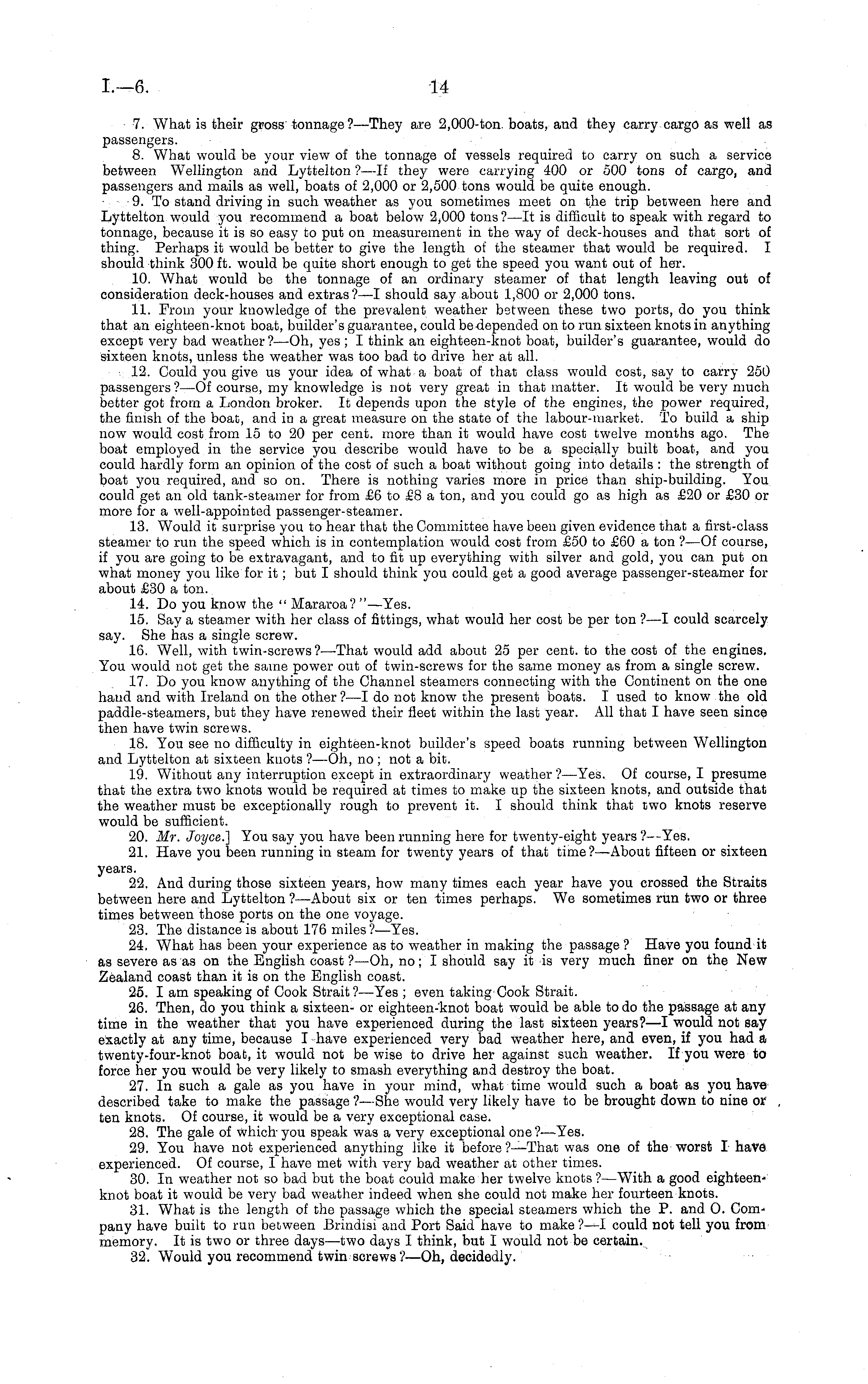 7. What is their guoss' tonnage?— They are 2,000-ton, boats, and they carry cargo as well as passengers. 8. What would be your view of the tonnage of vessels required to carry on such a service between Wellington and Lytteiton ?—lf they were carrying 400 or 500 tons of cargo, and passengers and mails as well, boats of 2,000 or 2,500 tons would be quite enough. 9. To stand driving in such weather as you sometimes meet on the trip between here and Lytteiton would you recommend a boat below 2,000 tons ?—lt is difficult to speak with regard to tonnage, because it is so easy to put on measurement in the way of deck-houses and that sort of thing. Perhaps it would be better to give the length of the steamer that would be required. I should think 300 ft. would be quite short enough to get the speed you want out of her. 10. What would be the tonnage of an ordinary steamer of that length leaving out of consideration deck-houses and extras?—l should say about 1,800 or 2,000 tons. 11. Prom your knowledge of the prevalent weather bstween these two ports, do you think that an eighteen-knot boat, builder's guarautee, could be depended on to run sixteen knots in anything except very bad weather?—Oh, yes ; I think an eighteen-knot boat, builder's guarantee, would do sixteen knots, unless the weather was too bad to drive her at all. 12. Could you give us your idea of what a boat of that class would cost, say to carry 250 passengers ?—Of course, my knowledge is not very great in that matter. It would be very much better got from a London broker. It depends upon the style of the engines, the power required, the finish of the boat, and in a great measure on the state of the labour-market. To build a ship now would cost from 15 to 20 per cent, more than it would have cost twelve months ago. The boat employed in the service you describe would have to be a specially built boat, and you could hardly form an opinion of the cost of such a boat without going into details : the strength of boat you required, and so on. There is nothing varies more in price than ship-building. You could get an old tank-steamer for from £6 to £8 a ton, and you could go as high as £20 or £30 or more for a well-appointed passenger-steamer. 13. Would it surprise you to hear that the Committee have been given evidence that a first-class steamer to run the speed which is in contemplation would cost from £50 to £60 a ton ?—Of course, if you are going to be extravagant, and to fit up everything with silver and gold, you can put on what money you like for it; but I should think you could get a good average passenger-steamer for about £30 a ton. 14. Do you know the " Mararoa? " —Yes. 15. Say a steamer with her class of fittings, what would her cost be per ton ? —I could scarcely say. She has a single screw. 16. Well, with twin-screws ?—-That would add about 25 per cent, to the cost of the engines. You would not get the same power out of twin-screws for the same money as from a single screw. 17. Do you know anything of the Channel steamers connecting with the Continent on the one hand and with Ireland on the other ?—I do not know the present boats. I used to know the old paddle-steamers, but they have renewed their fleet within the last year. All that I have seen since then have twin screws. 18. You see no difficulty in eighteen-knot builder's speed boats running between Wellington and Lytteiton at sixteen knots ?—Oh, no ; not a bit. 19. Without any interruption except in extraordinary weather ? —Yes. Of course, I presume that the extra two knots would be required at times to make up the sixteen knots, and outside that the weather must be exceptionally rough to prevent it. I should think that two knots reserve would be sufficient. 20. Mr. Joyce.] You say you have been running here for twenty-eight years ?—Yes. 21. Have you been running in steam for twenty years of that time?— About fifteen or sixteen years. 22. And during those sixteen years, how many times each year have you crossed the Straits between here and Lytteiton ? —About six or ten times perhaps. We sometimes run two or three times between those ports on the one voyage. 23. The distance is about 176 miles ?—Yes. 24. What has been your experience as to weather in making the passage ? Have you found it as severe as as on the English coast ?—Oh, no; I should say it is very much finer on the New Zealand coast than it is on the English coast. 25. I am speaking of Cook Strait?— Yes ; even taking Cook Strait. 26. Then, do you think a sixteen- or eighteen-'knot boat would be able to do the passage at any time in the weather that you have experienced during the last sixteen years? —I would not say exactly at any time, because I have experienced very bad weather here, and even, if you had a twenty-four-knot boat, it would not be wise to drive her against such weather. If you were to force her you would be very likely to smash everything and destroy the boat. 27. In such a gale as you have in your mind, what time would such a boat as you have described take to make the passage ? —She would very likely have to be brought down to nine or ten knots. Of course, it would be a very exceptional case. 28. The gale of which' you speak was a very exceptional one ?■—Yes. 29. You have not experienced anything like it before ?—That was one of the worst I have experienced. Of course, I have met with very bad weather at other times. 30. In weather not so bad but the boat could make her twelve knots ? —With a good eighteenknot boat it would be very bad weather indeed when she could not make her fourteen knots. 31. What is the length of the passage which the special steamers which the P. and O. Company have built to run between Brindisi and Port Said have to make ? —I could not tell you from memory. It is two or three days—two days I think, but I would not be certain. 32. Would you recommend twin screws?—Oh, decidedly.