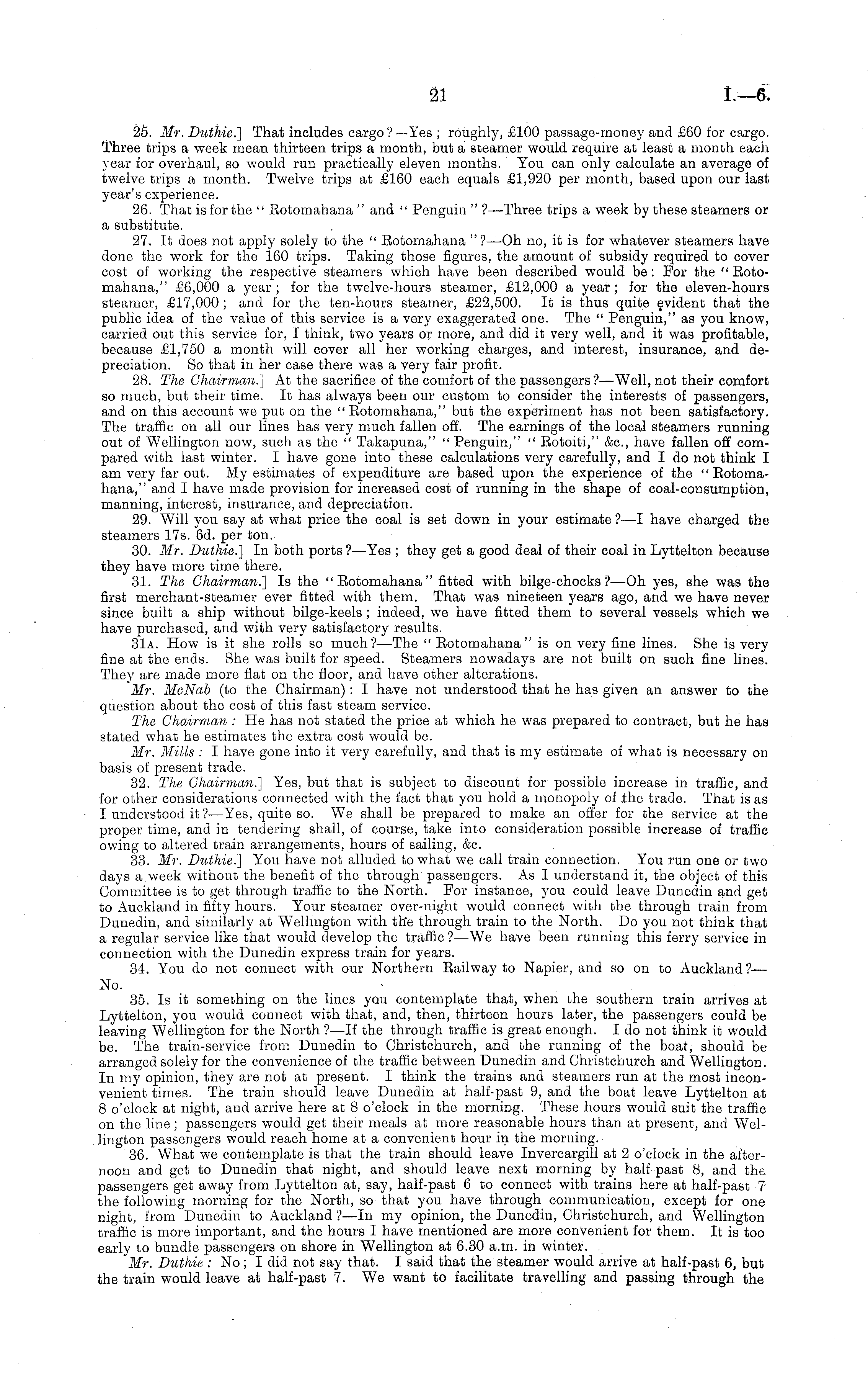 25. Mr. Duthie.] That includes cargo?— Yes ; roughly, £100 passage-money and £60 for cargo. Three trips a week mean thirteen trips a month, but a steamer would require at least a month eacli year for overhaul, so would run practically eleven months. You can only calculate an average of twelve trips a month. Twelve trips at £160 each equals £1,920 per month, based upon our last year's experience. 26. That is for the " Botomahana " and " Penguin " ? —Three trips a week by these steamers or a substitute. 27. It does not apply solely to the " Rotomahana "? —Oh no, it is for whatever steamers have done the work for the 160 trips. Taking those figures, the amount of subsidy required to cover cost of working the respective steamers which have been described would be : For the " Rotomahana," £6,000 a year ; for the twelve-hours steamer, £12,000 a year ; for the eleven-hours steamer, £17,000 ; and for the ten-hours steamer, £22,500. It is thus quite evident that the public idea of the value of this service is a very exaggerated one. The " Penguin," as you know, carried out this service for, I think, two years or more, and did it very well, and it was profitable, because £1,750 a month will cover all her working charges, and interest, insurance, and depreciation. So that in her case there was a very fair profit. 28. The Chairman.] At the sacrifice of the comfort of the passengers ?—Well, not their comfort so much, but their time. It has always been our custom to consider the interests of passengers, and on this account we put on the "Rotomahana," but the experiment has not been satisfactory. The traffic on all our lines has very much fallen off. The earnings of the local steamers running out of Wellington now, such as the " Takapuna," " Penguin," " Rotoiti," &c, have fallen off compared with last winter. I have gone into these calculations very carefully, and I do not think I am very far out. My estimates of expenditure are based upon the experience of the "Rotomahana," and I have made provision for increased cost of running in the shape of coal-consumption, manning, interest, insurance, and depreciation. 29. Will you say at what price the coal is set down in your estimate ?—I have charged the steamers 17s. 6d. per ton. 30. Mr. Duthie.] In both ports ?—Yes ; they get a good deal of their coal in Lyttelton because they have more time there. 31. The Chairman.] Is the "Rotomahana" fitted with bilge-chocks?—Oh yes, she was the first merchant-steamer ever fitted with them. That was nineteen years ago, and we have never since built a ship without bilge-keels; indeed, we have fitted them to several vessels which we have purchased, and with very satisfactory results. 31a. How is it she rolls so much? —The " Rotomahana" is on very fine lines. She is very fine at the ends. She was built for speed. Steamers nowadays are not built on such fine lines. They are made more flat on the floor, and have other alterations. Mr. McNab (to the Chairman) : I have not understood that he has given an answer to the question about the cost of this fast steam service. The Chairman : He has not stated the price at which he was prepared to contract, but he has stated what he estimates the extra cost would be. Mr. Mills : I have gone into it very carefully, and that is my estimate of what is necessary on basis of present trade. 32. The Chairman.] Yes, but that is subject to discount for possible increase in traffic, and for other considerations connected with the fact that you hold a monopoly of the trade. That is as I understood it ?—Yes, quite so. We shall be prepared to make an offer for the service at the proper time, and in tendering shall, of course, take into consideration possible increase of traffic owing to altered train arrangements, hours of sailing, &c. 33. Mr. Duthie.] You have not alluded to what we call train connection. You run one or two days a week without the benefit of the through passengers. As I understand it, the object of this Committee is to get through traffic to the North. For instance, you could leave Dunedin and get to Auckland in fifty hours. Your steamer over-night would connect with the through train from Dunedin, and similarly at Wellington with the through train to the North. Do you not think that a regular service like that would develop the traffic?—We have been running this ferry service in connection with the Dunedin express train for years. 34. You do not connect with our Northern Railway to Napier, and so on to Auckland?— No. 35. Is it something on the lines you contemplate that, when ohe southern train arrives at Lyttelton, you would connect with that, and, then, thirteen hours later, the passengers could be leaving Wellington for the North ?—lf the through traffic is great enough. Ido not think it would be. The train-service from Dunedin to Christchurch, and the running of the boat, should be arranged solely for the convenience of the traffic between Dunedin and Christchurch and Wellington. In my opinion, they are not at present. I think the trains and steamers run at the most inconvenient times. The train should leave Dunedin at half-past 9, and the boat leave Lyttelton at 8 o'clock at night, and arrive here at 8 o'clock in the morning. These hours would suit the traffic on the line; passengers would get their meals at more reasonable hours than at present, and Wellington passengers would reach home at a convenient hour in the morning. 36. What we contemplate is that the train should leave Invercargill at 2 o'clock in the afternoon and get to Dunedin that night, and should leave next morning by half-past 8, and the passengers get away from Lyttelton at, say, half-past 6 to connect with trains here at half-past 7 the following morning for the North, so that you have through communication, except for one night, from Dunedin to Auckland ?—ln my opinion, the Dunedin, Christchurch, and Wellington traffic is more important, and the hours I have mentioned ar