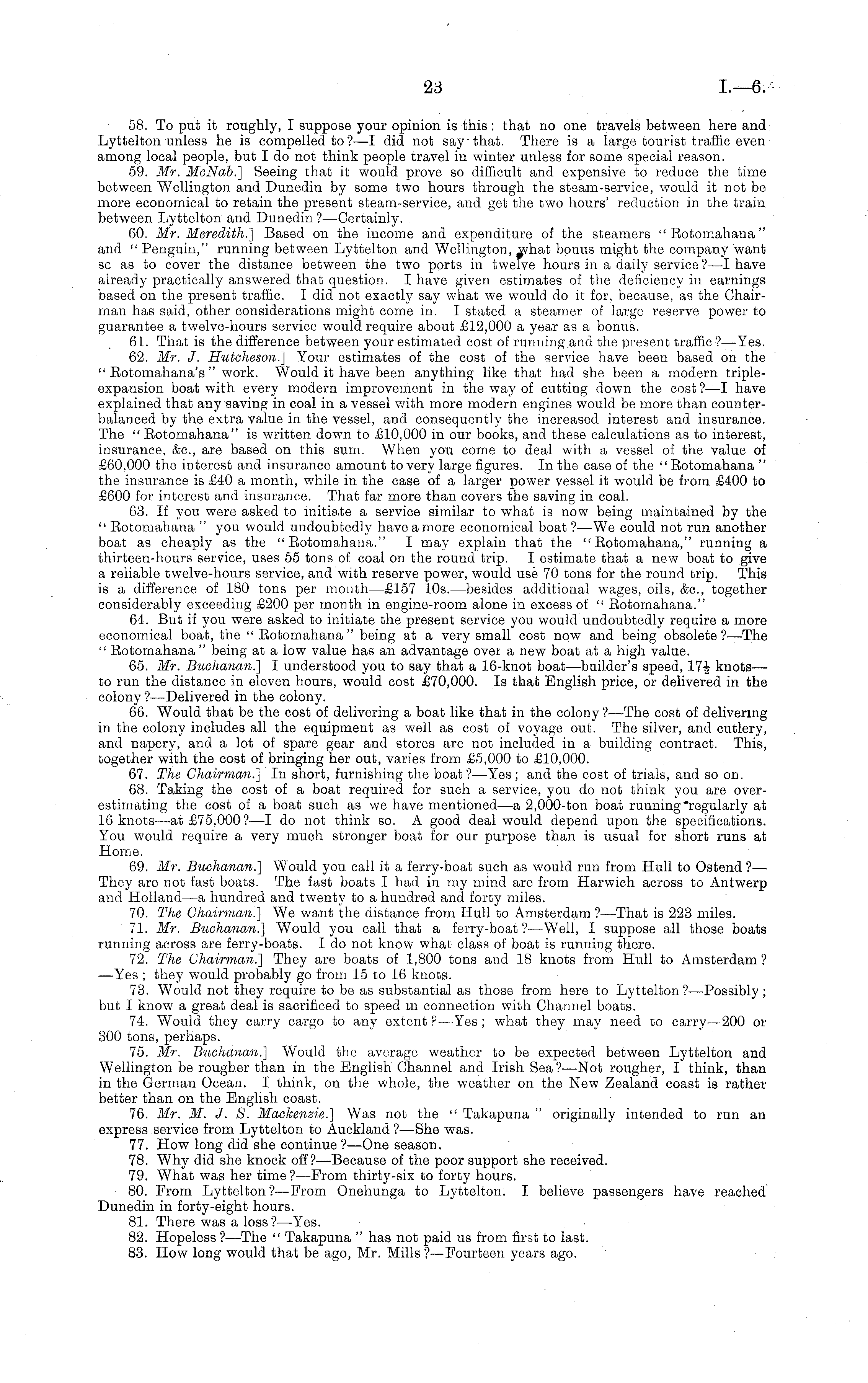 58. To put it roughly, I suppose your opinion is this : that no one travels between here and Lyttelton unless he is compelled to ?—I did not say" that. There is a large tourist traffic even among local people, but I do not think people travel in winter unless for some special reason. 59. Mr. McNab.] Seeing that it would prove so difficult and expensive to reduce the time between Wellington and Dunedin by some two hours through the steam-service, would it not be more economical to retain the present steam-service, and get the two hours' reduction in the train between Lyttelton and Dunedin ?—Certainly. 60. Mr. Meredith.] Based on the income and expenditure of the steamers " Rotomahana" and " Penguin," running between Lyttelton and Wellington, what bonus might the company want so as to cover the distance between the two ports in twelve hours in a daily service ?—I have already practically answered that question. I have given estimates of the deficiency in earnings based on the present traffic. I did not exactly say what we would do it for, because, as the Chairman has said, other considerations might come in. I stated a steamer of large reserve power to guarantee a twelve-hours service would require about £12,000 a year as a bonus. 61. That is the difference between your estimated cost of running.and the present traffic?— Yes. 62. Mr. J. Hutcheson.] Your estimates of the cost of the service have been based on the " Rotomahana's " work. Would it have been anything like that had she been a modern tripleexpansion boat with every modern improvement in the way of cutting down the cost ?—I have explained that any saving in coal in a vessel with more modern engines would be more than counterbalanced by the extra value in the vessel, and consequently the increased interest and insurance. The " Eotomahana" is written down to £10,000 in our books, and these calculations as to interest, insurance, &c, are based on this sum. When you come to deal with a vessel of the value of £60,000 the interest and insurance amount to very large figures. In the case of the " Botomahana " the insurance is £40 a month, while in the case of a larger power vessel it would be from £400 to £600 for interest and insurance. That far more than covers the saving in coal. 63. If you were asked to initiate a service similar to what is now being maintained by the " Eotomahana " you would undoubtedly have a more economical boat ?—We could not run another boat as cheaply as the "Eotomahana." I may explain that the "Eotomahana," running a thirteen-hours service, uses 55 tons of coal on the round trip. I estimate that a new boat to give a reliable twelve-hours service, and with reserve power, would use 70 tons for the round trip. This is a difference of 180 tons per month —£157 10s. —besides additional wages, oils, &c, together considerably exceeding £200 per month in engine-room alone in excess of " Rotomahana." 64. But if you were asked to initiate the present service you would undoubtedly require a more economical boat, the " Eotomahana " being at a very small cost now and being obsolete ?—The " Rotomahana " being at a low value has an advantage over a new boat at a high value. 65. Mr. Buchanan.] I understood you to say that a 16-knot boat —builder's speed, 17f knots— to run the distance in eleven hours, would cost £70,000. Is that English price, or delivered in the colony ?—Delivered in the colony. 66. Would that be the cost of delivering a boat like that in the colony? —The cost of delivering in the colony includes all the equipment as well as cost of voyage out. The silver, and cutlery, and napery, and a lot of spare gear and stores are not included in a building contract. This, together with the cost of bringing her out, varies from £5,000 to £10,000. 67. The Chairman.] In short, furnishing the boat ?—Yes; and the cost of trials, and so on. 68. Taking the cost of a boat required for such a service, you do not think you are overestimating the cost of a boat such as we have mentioned—a 2,000-ton boat running "regularly at 16 knots—at £75,000? —I do not think so. A good deal would depend upon the specifications. You would require a very much stronger boat for our purpose than is usual for short runs at Home. 69. Mr, Buchanan.] Would you call it a ferry-boat such as would run from Hull to Ostend ?— They are not fast boats. The fast boats I had in my mind are from Harwich across to Antwerp and Holland—a hundred and twenty to a hundred and forty miles. 70. The Chairman.] We want the distance from Hull to Amsterdam ?—That is 223 miles. 71. Mr. Buchanan.] Would you call that a ferry-boat ?—Well, I suppose all those boats running across are ferry-boats. Ido not know what class of boat is running there. 72. The Chairman.] They are boats of 1,800 tons and 18 knots from Hull to Amsterdam? —Yes ; they would probably go from 15 to 16 knots. 73. Would not they require to be as substantial as those from here to Lyttelton?—Possibly; but I know a great deal is sacrificed to speed m connection with Channel boats. 74. Would they carry cargo to any extent ?—-Yes ; what they may need to carry —200 or 300 tons, perhaps. 75. Mr. Buchanan.] Would the average weather to be expected between Lyttelton and Wellington be rougher than in the English Channel and Irish Sea ?—Not rougher, I think, than in the German Ocean. I think, on the whole, the weather on the New Zealand coast is rather better than on the English coast. 76. Mr. M. J. S. Mackenzie.] Was not the " Takapuna " originally intended to run an express service from Lyttelton to Auckland ?—She was. 77. How long did she continue ?—One season. 78. Why did she knock off?— Because of the poor support she received. 79. What was her time ?—From thirty r -six to forty hours. 80. Erom Lyttelton ?—From Onehunga to Lyttelton. I believe passengers have reached Dunedin in forty-eight hours. 81. There was a loss? —Yes. 82. Hopeless?— 