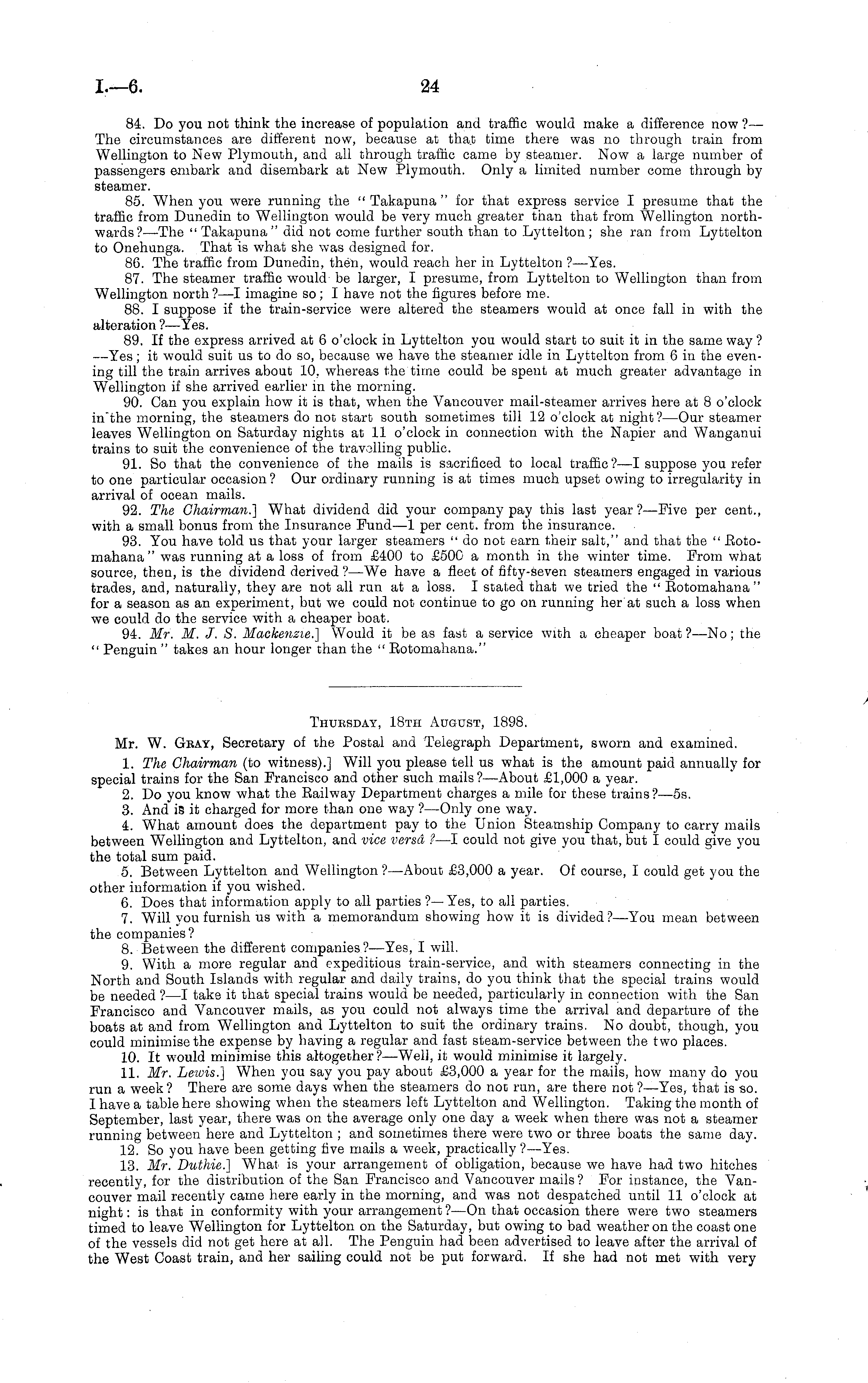 Thubsday, 18th August, 1898. Mr. W. Gbay, Secretary of the Postal and Telegraph Department, sworn and examined. 1. The Chairman (to witness).] Will you please tell us what is the amount paid annually for special trains for the San Francisco and other such mails ?—About £1,000 a year. 2. Do you know what the Eailway Department charges a mile for these trains?—ss. 3. And is it charged for more than one way ?—Only one way. 4. "What amount does the department pay to the Union Steamship Company to carry mails between Wellington and Lyttelton, and vice versa ? —I could not give you that, but I could give you the total sum paid. 5. Between Lyttelton and Wellington ?—About £3,000 a year. Of course, I could get you the other information if you wished. 6. Does that information apply to all parties ?—Yes, to all parties. 7. Will you furnish us with a memorandum showing how it is divided?— You mean between the companies? 8. Between the different companies? —Yes, I will. 9. With a more regular and expeditious train-service, and with steamers connecting in the North and South Islands with regular and daily trains, do you think that the special trains would be needed ?—I take it that special trains would be needed, particularly in connection with the San Francisco and Vancouver mails, as you could not always time the arrival and departure of the boats at and from Wellington and Lyttelton to suit the ordinary trains. No doubt, though, you could minimise the expense by having a regular and fast steam-service between the two places. 10. It would minimise this altogether?— Well, it would minimise it largely. 11. Mr. Lewis.'] When you say you pay about £3,000 a year for the mails, how many do you run a week? There are some days when the steamers do not run, are there not ?—Yes, that is so. I have a table here showing when the steamers left Lyttelton and Wellington. Taking the month of September, last year, there was on the average only one day a week when there was not a steamer running between here and Lyttelton ; and sometimes there were two or three boats the same day. 12. So you have been getting five mails a week, practically ?—Yes. 13. Mr. Duthie.] What is your arrangement of obligation, because we have had two hitches recently, for the distribution of the San Francisco and Vancouver mails? For instance, the Vancouver mail recently came here early in the morning, and was not despatched until 11 o'clock at night: is that in conformity with your arrangement ? —On that occasion there were two steamers timed to leave Wellington for Lyttelton on the Saturday, but owing to bad weather on the coast one of the vessels did not get here at all. The Penguin had been advertised to leave after the arrival of the West Coast train, and her sailing could not be put forward. If she had not met with very