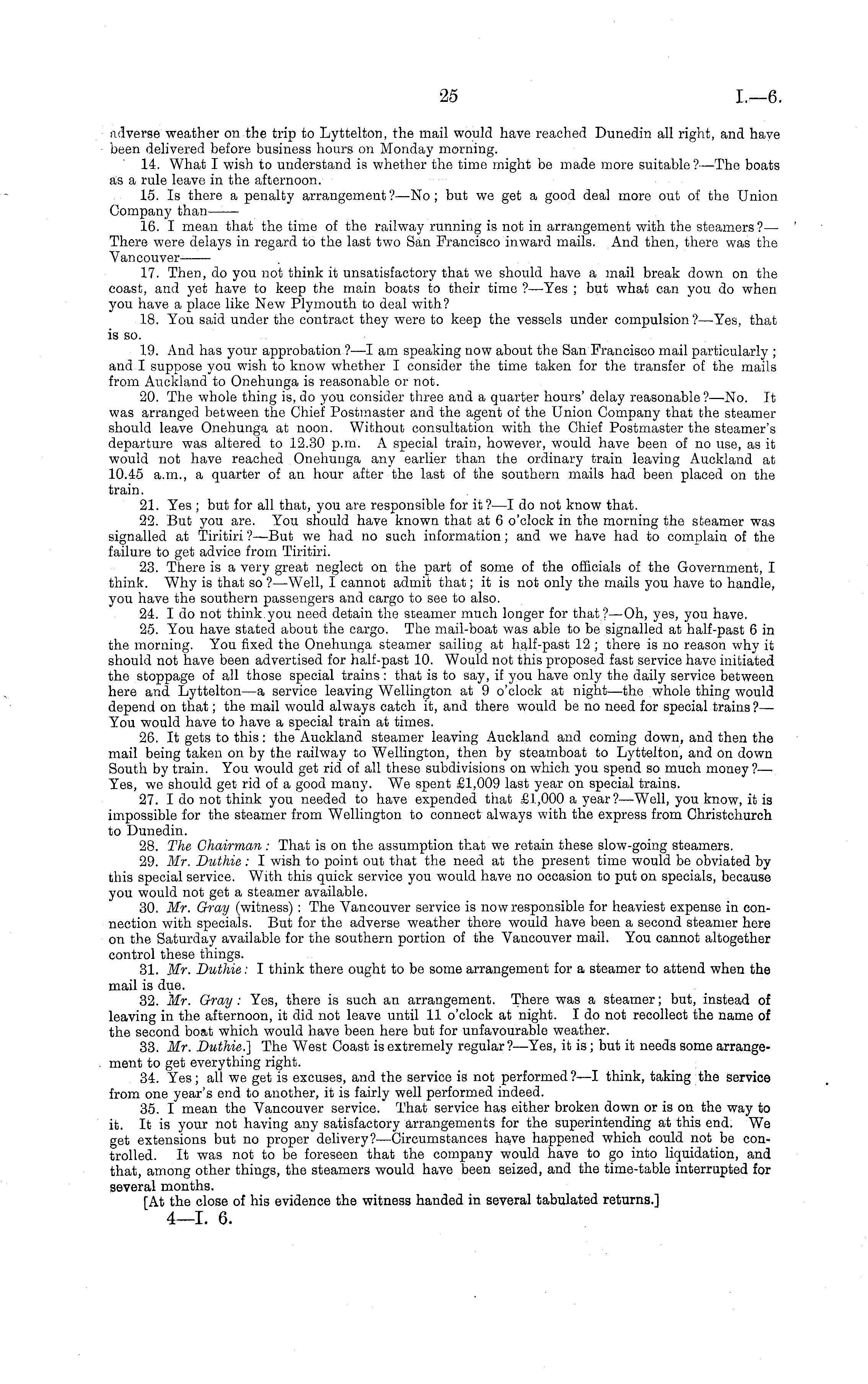adverse weather on the trip to Lyttelton, the mail would have reached Dunedin all right, and have been delivered before business hours on Monday morning. 14. What I wish to understand is whether the time might be made more suitable?— The boats as a rule leave in the afternoon. 15. Is there a penalty arrangement ?—No ; but we get a good deal more out of the Union Company than 16. I mean that the time of the railway running is not in arrangement with the steamers?— There were delays in regard to the last two San Francisco inward mails. And then, there was the Vancouver 17. Then, do you not think it unsatisfactory that we should have a mail break down on the coast, and yet have to keep the main boats to their time ? —Yes ; but what can you do when you have a place like New Plymouth to deal with? 18. You said under the contract they were to keep the vessels under compulsion?— Yes, that is so. 19. And has your approbation ? —I am speaking now about the San Francisco mail particularly ; and I suppose you wish to know whether I consider the time taken for the transfer of the mails from Auckland to Onehunga is reasonable or not. 20. The whole thing is, do you consider three and a quarter hours' delay reasonable ?—-No. It was arranged between the Chief Postmaster and the agent of the Union Company that the steamer should leave Onehunga at noon. Without consultation with the Chief Postmaster the steamer's departure was altered to 12.30 p.m. A special train, however, would have been of no use, as it would not have reached Onehunga any earlier than the ordinary train leaving Auckland at 10.45 a.m., a quarter of an hour after the last of the southern mails had been placed on the train. 21. Yes ; but for all that, you are responsible for it? —I do not know that. 22. But you are. You should have known that at 6 o'clock in the morning the steamer was signalled at Tiritiri ? —But we had no such information; and we have had to complain of the failure to get advice from Tiritiri. 23. There is a very great neglect on the part of some of the officials of the Government, I think. Why is that so ? —Well, I cannot admit that; it is not only the mails you have to handle, you have the southern passengers and cargo to see to also. 24. I do not think.you need detain the steamer much longer for that?—Oh, yes, you have. 25. You have stated about the cargo. The mail-boat was able to be signalled at half-past 6in the morning. You fixed the Onehunga steamer sailing at half-past 12 ; there is no reason why it should not have been advertised for half-past 10. Would not this proposed fast service have initiated the stoppage of all those special trains : that is to say, if you have only the daily service between here and Lyttelton—a service leaving Wellington at 9 o'clock at night—the whole thing would depend on that; the mail would always catch it, and there would be no need for special trains ? — You would have to have a special train at times. 26. It gets to this: the Auckland steamer leaving Auckland and coming down, and then the mail being taken on by the railway to Wellington, then by steamboat to Lyttelton, and on down South by train. You would get rid of all these subdivisions on which you spend so much money ?— Yes, we should get rid of a good many. We spent £1,009 last year on special trains. 27. I do not think you needed to have expended that £1,000 a year?— Well, you know, it is impossible for the steamer from Wellington to connect always with the express from Christchurch to Dunedin. 28. The Chairman: That is on the assumption that we retain these slow-going steamers. 29. Mr. Duthie : I wish to point out that the need at the present time would be obviated by this special service. With this quick service you would have no occasion to put on specials, because you would not get a steamer available. 30. Mr. Gray (witness) : The Vancouver service is now responsible for heaviest expense in connection with specials. But for the adverse weather there would have been a second steamer here on the Saturday available for the southern portion of the Vancouver mail. You cannot altogether control these things. 31. Mr. Duthie: I think there ought to be some arrangement for a steamer to attend when the mail is due. 32. Mr. Gray: Yes, there is such an arrangement. There was a steamer; but, instead of leaving in the afternoon, it did not leave until 11 o'clock at night. Ido not recollect the name of the second boat which would have been here but for unfavourable weather. 33. Mr. Duthie.] The West Coast is extremely regular ?—Yes, it is; but it needs some arrangement to get everything right. 34. Yes; all we get is excuses, and the service is not performed?—l think, taking the service from one year's end to another, it is fairly well performed indeed. 35. I mean the Vancouver service. That service has either broken down or is on the way to it. It is your not having any satisfactory arrangements for the superintending at this end. We get extensions but no proper delivery?— Circumstances have happened which could not be controlled. It was not to be foreseen that the company would nave to go into liquidation, and that, among other things, the steamers would have been seized, and the time-table interrupted for several months. [At the close of his evidence the witness handed in several tabulated returns.] 4—l. 6.