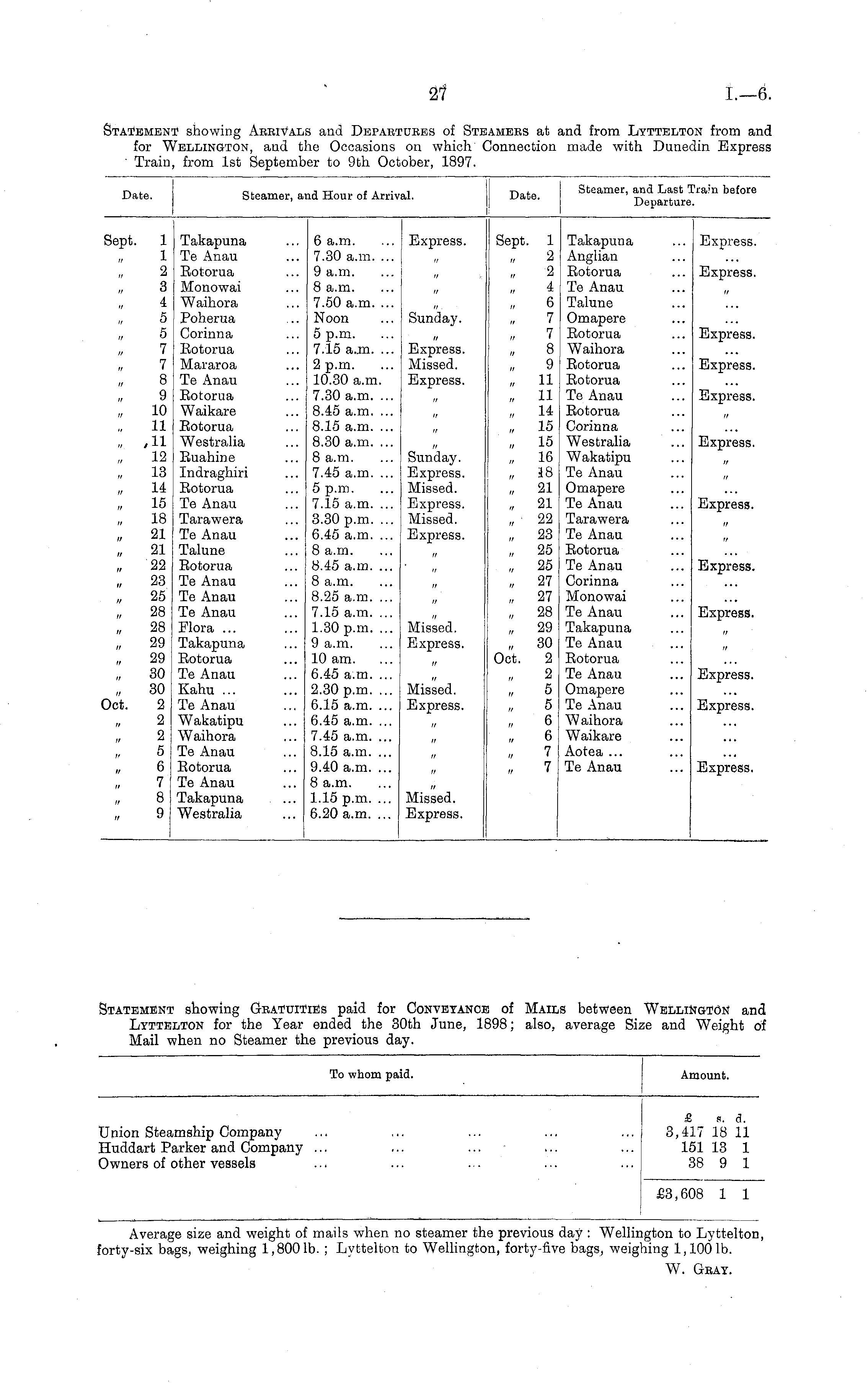 Statement showing Arrivals and Departures of Steamers at and from Lyttelton from and for Wellington, and the Occasions on which Connection made with Dunedin Express Train, from 1st September to 9th October, 1897.