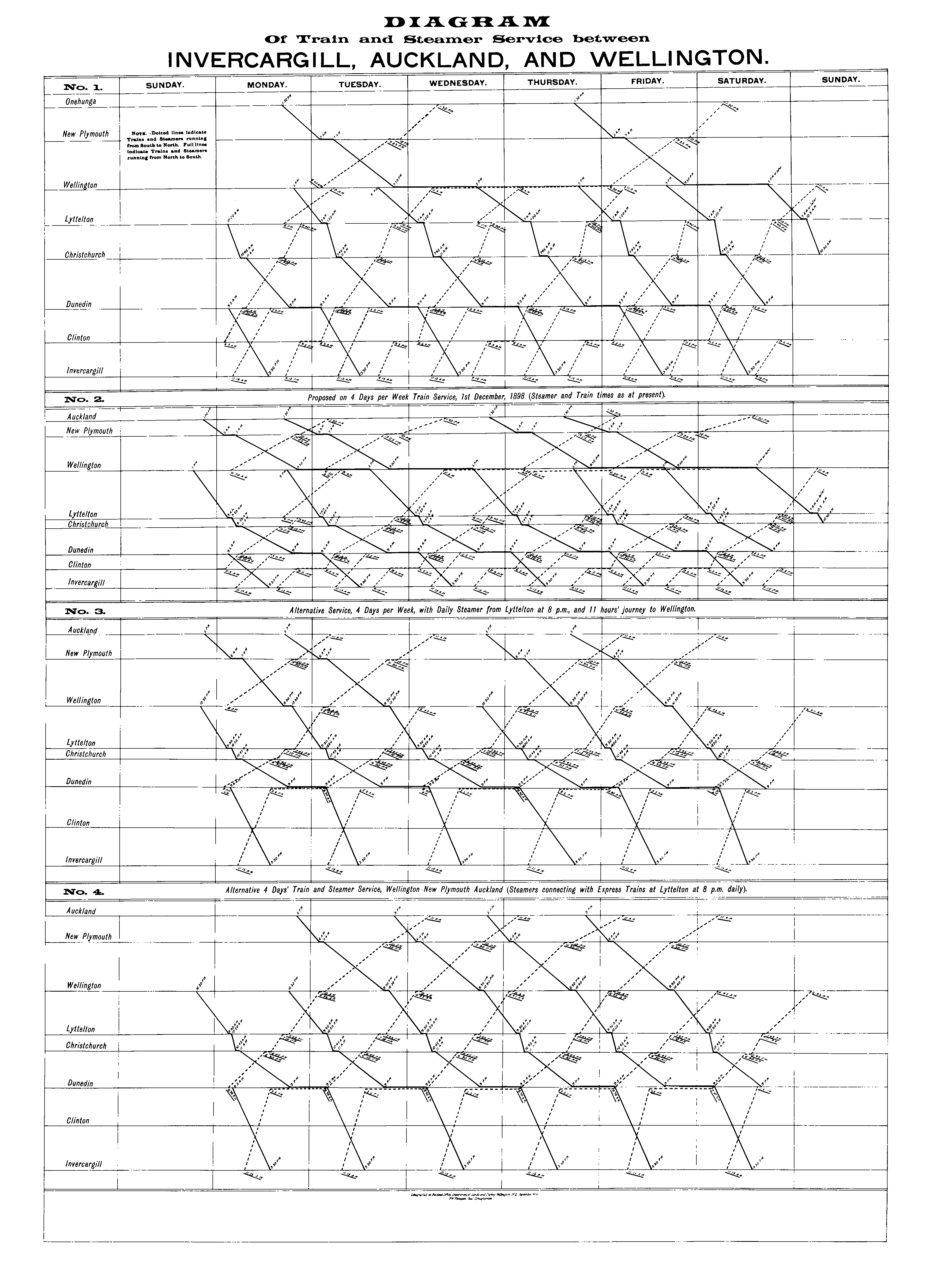 DIAGRAM Of Train and Steamer Service between INVERCARGILL, AUCKLAND, AND WELLINGTON.