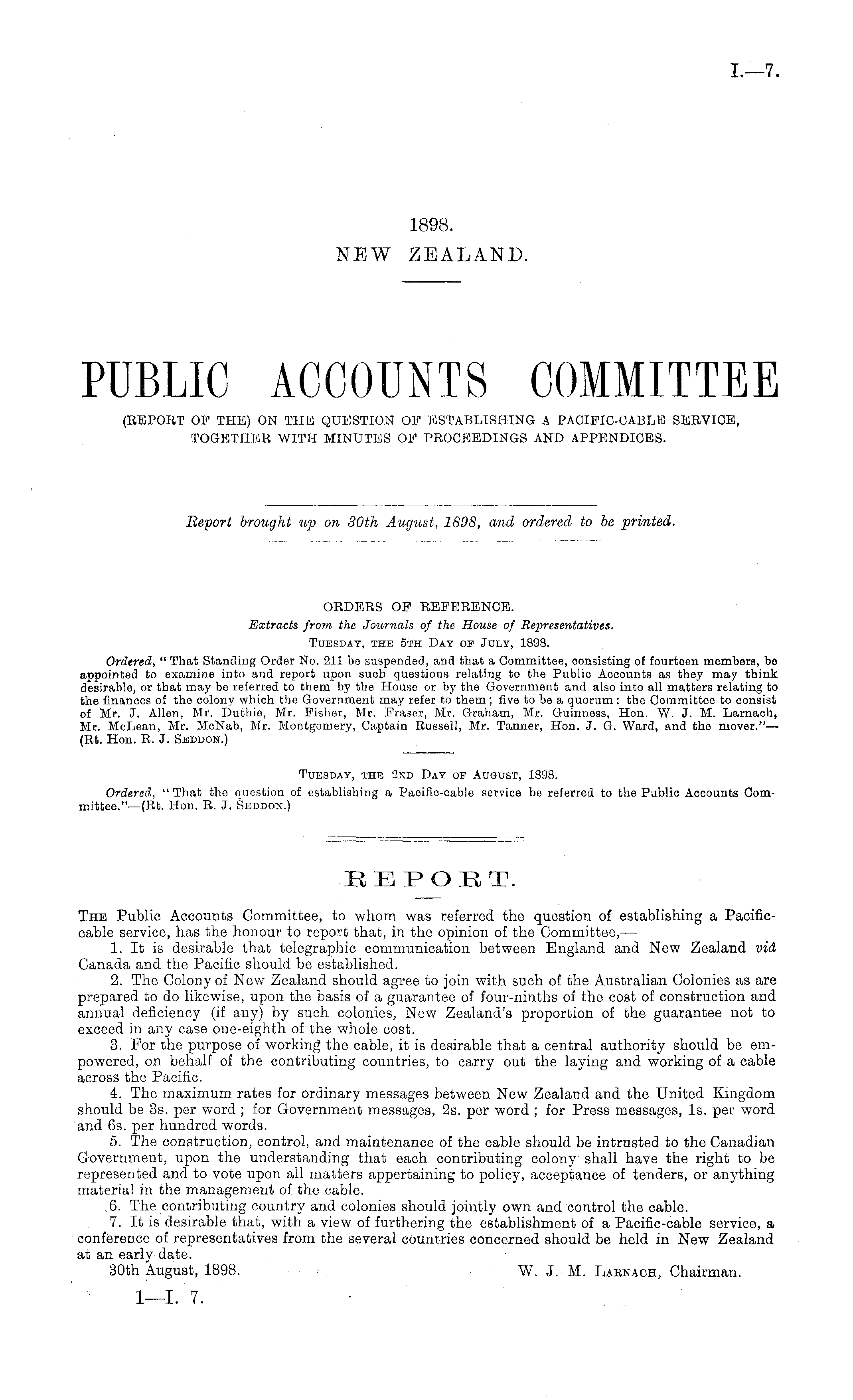 Tuesday, the 2nd Day op August, 1898. Ordered, " That the question of establishing a Paoifio-oable service be referred to the Pablio Accounts Committee." —(Rt. Hon. R. J. Seddon.)
