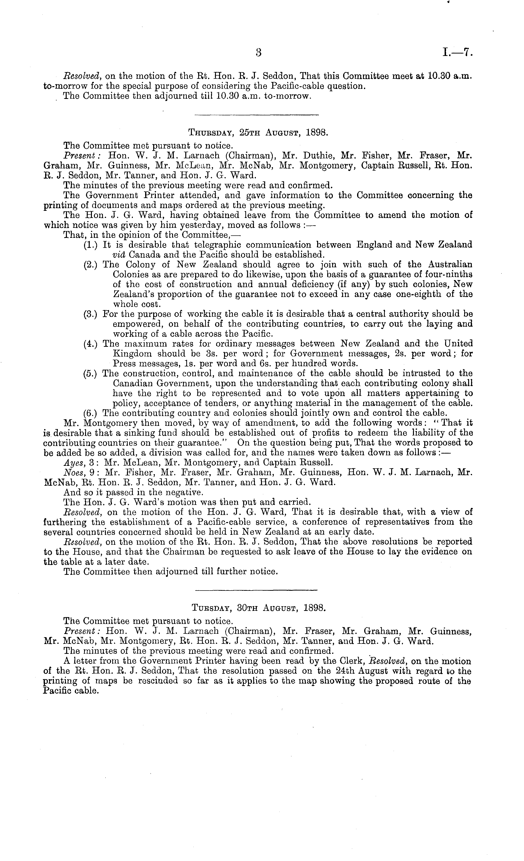 Tuesday, 30th August, 1898. The Committee met pursuant to notice. Present: Hon. W. J. M. Larnach (Chairman), Mr. Fraser, Mr. Graham, Mr. Guinness, Mr. McNab, Mr. Montgomery, Et. Hon. E. J. Seddon, Mr. Tanner, and Hon. J. G. Ward. The minutes of the previous meeting were read and confirmed. A letter from the Government Printer having been read by the Clerk, Resolved, on the motion of the Et. Hon. E. J. Seddon, That the resolution passed on the 24th August with regard to the printing of maps be rescinded so far as it applies to the map showing the proposed route of the Pacific cable.