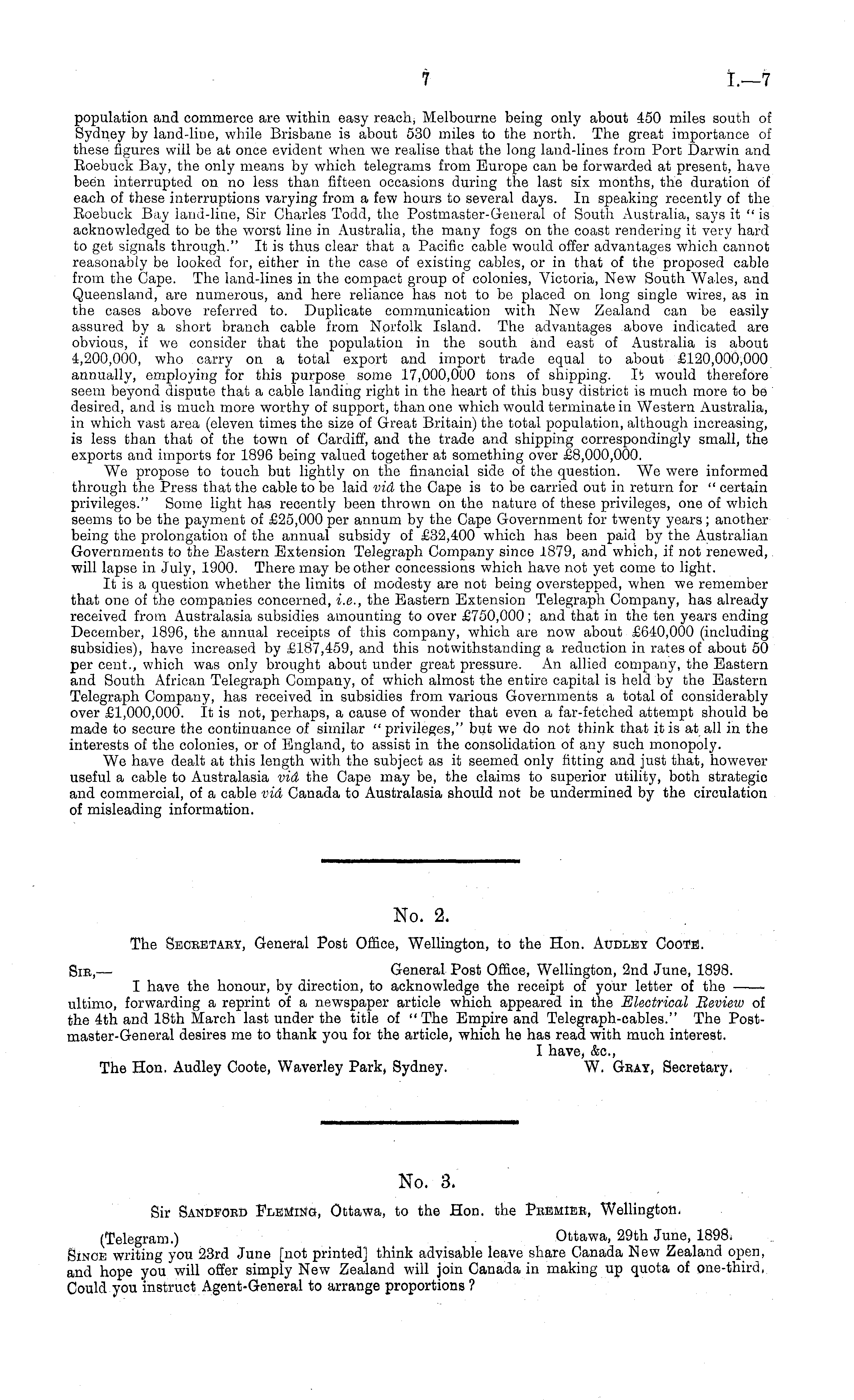 No. 2. The Secretary, General Post Office, Wellington, to the Hon. Audlet Coots. Sic, — General Post Office, Wellington, 2nd June, 1898. I have the honour, by direction, to acknowledge the receipt of your letter of the ultimo, forwarding a reprint of a newspaper article which appeared in the Electrical Beview of the 4th and 18th March last under the title of "The Empire and Telegraph-cables." The Post-master-General desires me to thank you for the article, which he has read with much interest. I have, &c, The Hon. Audley Coote, Waverley Park, Sydney. W. Gray, Secretary.