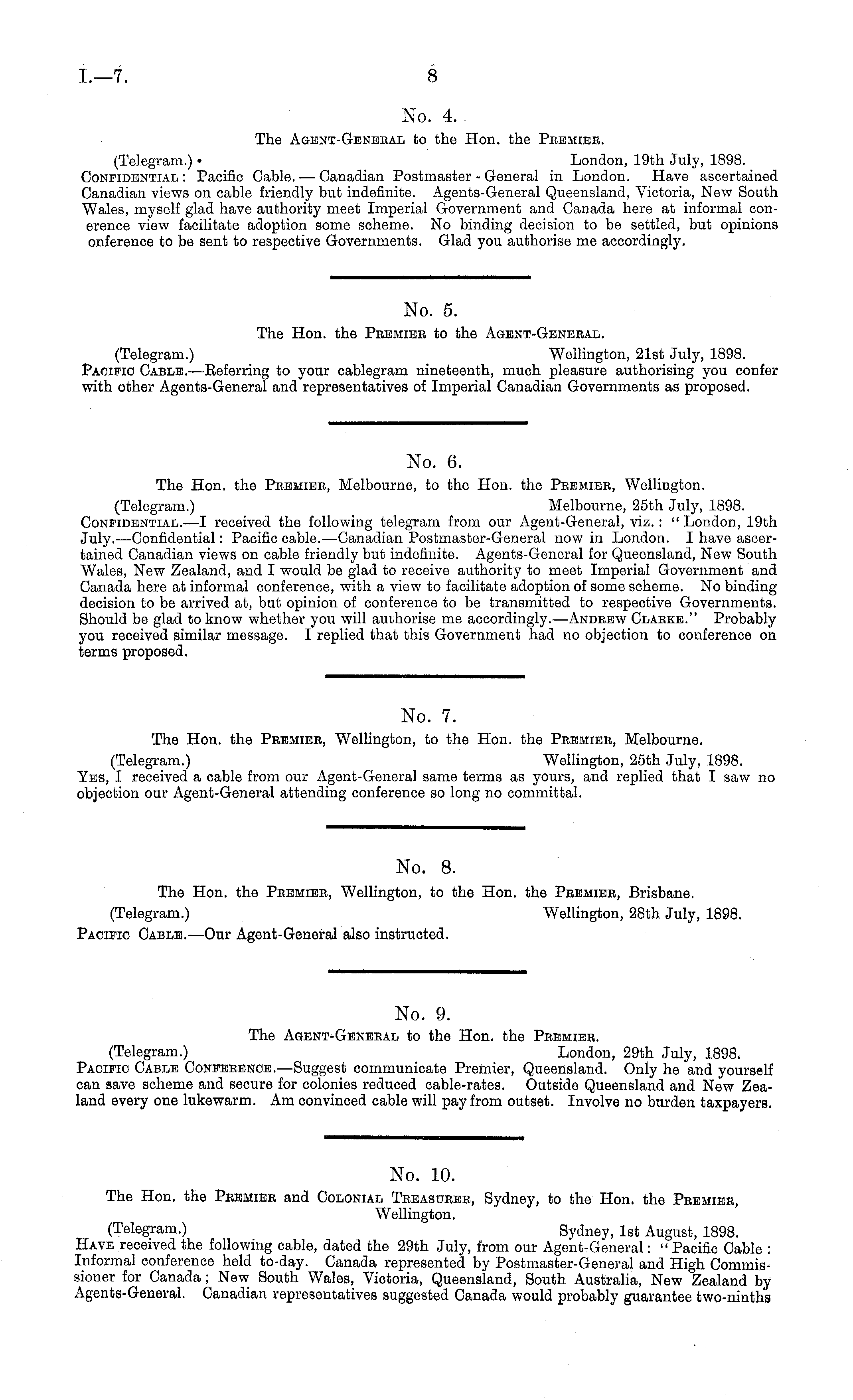 No. 5. The Hon. the Peemiee to the Agent-Geneeal. (Telegram.) Wellington, 21st July, 1898. Pacific Cable.—Referring to your cablegram nineteenth, much pleasure authorising you confer with other Agents-General and representatives of Imperial Canadian Governments as proposed.