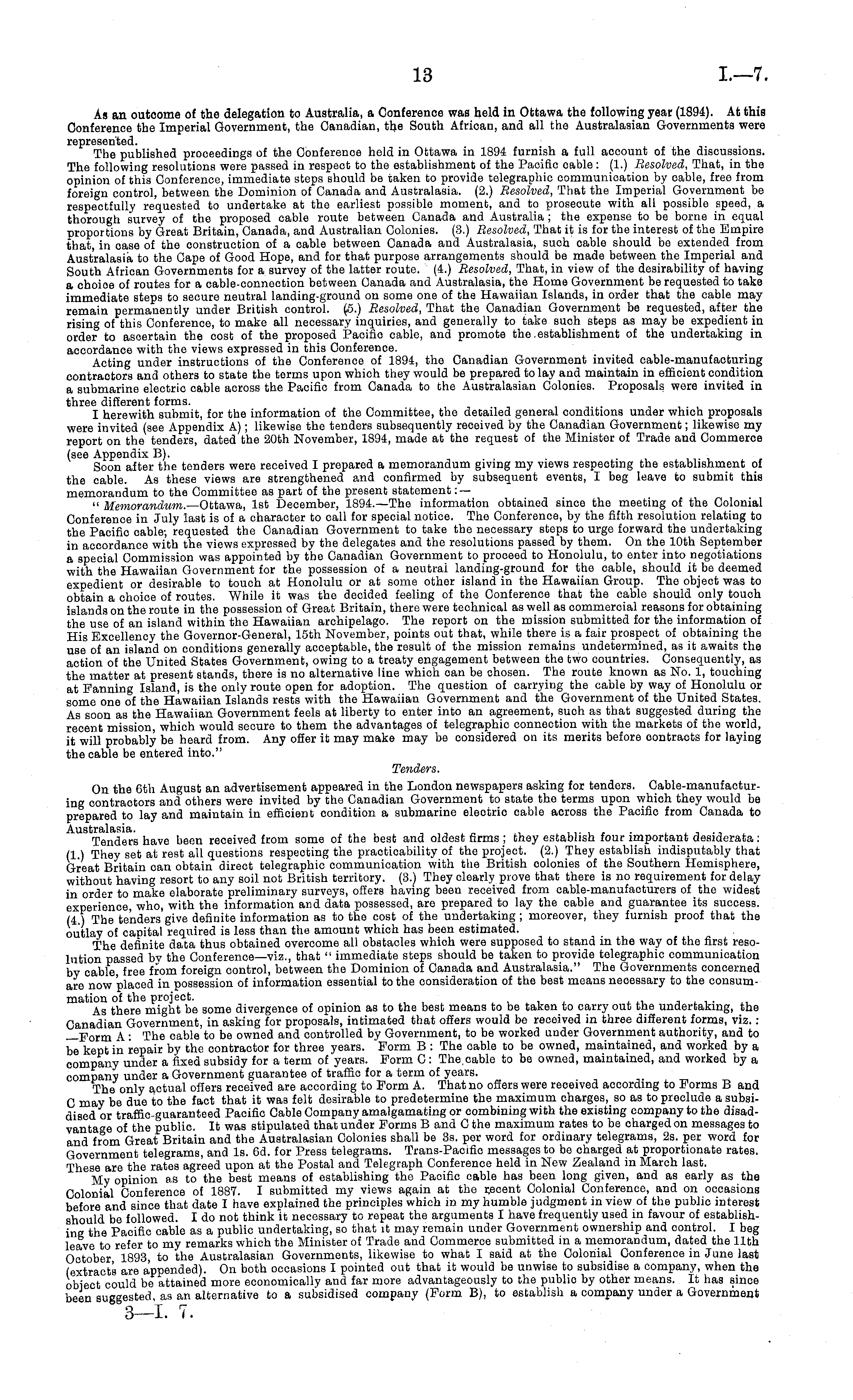 As an outcome of the delegation to Australia, a Conference was held in Ottawa the following year (1894). At this Conference the Imperial Government, the Canadian, the South African, and all the Australasian Governments were represented. The published proceedings of the Conference held in Ottawa in 1894 furnish a full account of the discussions. The following resolutions were passed in respect to the establishment of the Pacific cable : (1.) Resolved, That, in the opinion of this Conference, immediate steps should be taken to provide telegraphic communication by cable, free from foreign control, between the Dominion of Canada and Australasia. (2.) Resolved, That the Imperial Government be respectfully requested to undertake at the earliest possible moment, and to prosecute with all possible speed, a thorough survey of the proposed cable route between Canada and Australia ; the expense to be borne in equal proportions by Great Britain, Canada, and Australian Colonies. (3.) Resolved, That it is for the interest of the Empire that, in case of the construction of a cable between Canada and Australasia, such cable should be extended from Australasia to the Cape of Good Hope, and for that purpose arrangements should be made between the Imperial and South African Governments for a survey of the latter route. (4.) Resolved, That, in view of the desirability of having a choioe of routes for a cable-connection between Canada and Australasia, the Home Government be requested to take immediate steps to secure neutral landing-ground on some one of the Hawaiian Islands, in order that the cable may remain permanently under British control. (5.) Resolved, That the Canadian Government be requested, after the rising of this Conference, to make all necessary inquiries, and generally to take such steps as may be expedient in order to ascertain the cost of the proposed Paciflo cable, and promote the establishment of the undertaking in accordance with the views expressed in this Conference. Acting under instructions of the Conference of 1894, the Canadian Government invited cable-manufacturing contractors and others to state the terms upon which they would be prepared to lay and maintain in efficient condition a submarine electric cable across the Pacific from Canada to the Australasian Colonies. Proposals were invited in three different forms. I herewith submit, for the information of the Committee, the detailed general conditions under which proposals were invited (see Appendix A); likewise the tenders subsequently received by the Canadian Government; likewise my report on the tenders, dated the 20th November, 1894, made at the request of the Minister of Trade and Commerce (see Appendix B). Soon after the tenders were received I prepared a memorandum giving my views respecting the establishment of the cable. As these views are strengthened and confirmed by subsequent events, I beg leave to submit this memorandum to the Committee as part of the present statement : — " Memorandmn.-Otta.via:, Ist December, 1894.—The information obtained since the meeting of the Colonial Conference in July last is of a character to call for special notice. The Conference, by the fifth resolution relating to the Pacific cable; requested the Canadian Government to take the necessary steps to urge forward the undertaking in accordance with the views expressed by the delegates and the resolutions passed by them. On the 10th September a special Commission was appointed by the Canadian Government to proceed to Honolulu, to enter into negotiations with the Hawaiian Government for the possession of a neutral landing-ground for the cable, should it be deemed expedient or desirable to touch at Honolulu or at some other island in the Hawaiian Group. The object was to obtain a choice of routes. While it was the decided feeling of the Conference that the cable should only touch islands on the route in the possession of Great Britain, there were technical as well as commercial reasons for obtaining the use of an island within the Hawaiian archipelago. The report on the mission submitted for the information of His Excellency the Governor-General, 15th November, points out that, while there is a fair prospect of obtaining the use of an island on conditions generally acceptable, the result of the mission remains undetermined, as it awaits the action of the United States Government, owing to a treaty engagement between the two countries. Consequently, as the matter at present stands, there is no alternative line which oan be chosen. The route known as No. 1, touching at Fanning Island, is the only route open for adoption. The question of carrying the cable by way of Honolulu or some one of the Hawaiian Islands rests with the Hawaiian Government and the Government of the United States. As soon as the Hawaiian Government feels at liberty to enter into an agreement, such as that suggested during the recent mission, which would secure to them the advantages of telegraphic connection with the markets of the world, it will probably be heard from. Any offer it may make may be considered oa its merits before contracts for laying the cable be entered into." Tenders. On the 6th August an advertisement appeared in the London newspapers asking for tenders. Cable-manufactur-ing contractors and others were invited by the Canadian Government to state the terms upon which they would be prepared to lay and maintain in efficient condition a submarine electric cable aoross the Pacific from Canada to Tender's have been received from some of the best and oldest firms _; they establish four important desiderata: (1.) They set at rest all questions respecting the practicability of the project. (2.) They establish indisputably that Great Britain can obtain direct telegraphic communication with the British colonies of the Southern Hemisphere, without having resort to any soil not British territory. (3.) They clearly prove that there is no requirement for delay in ord