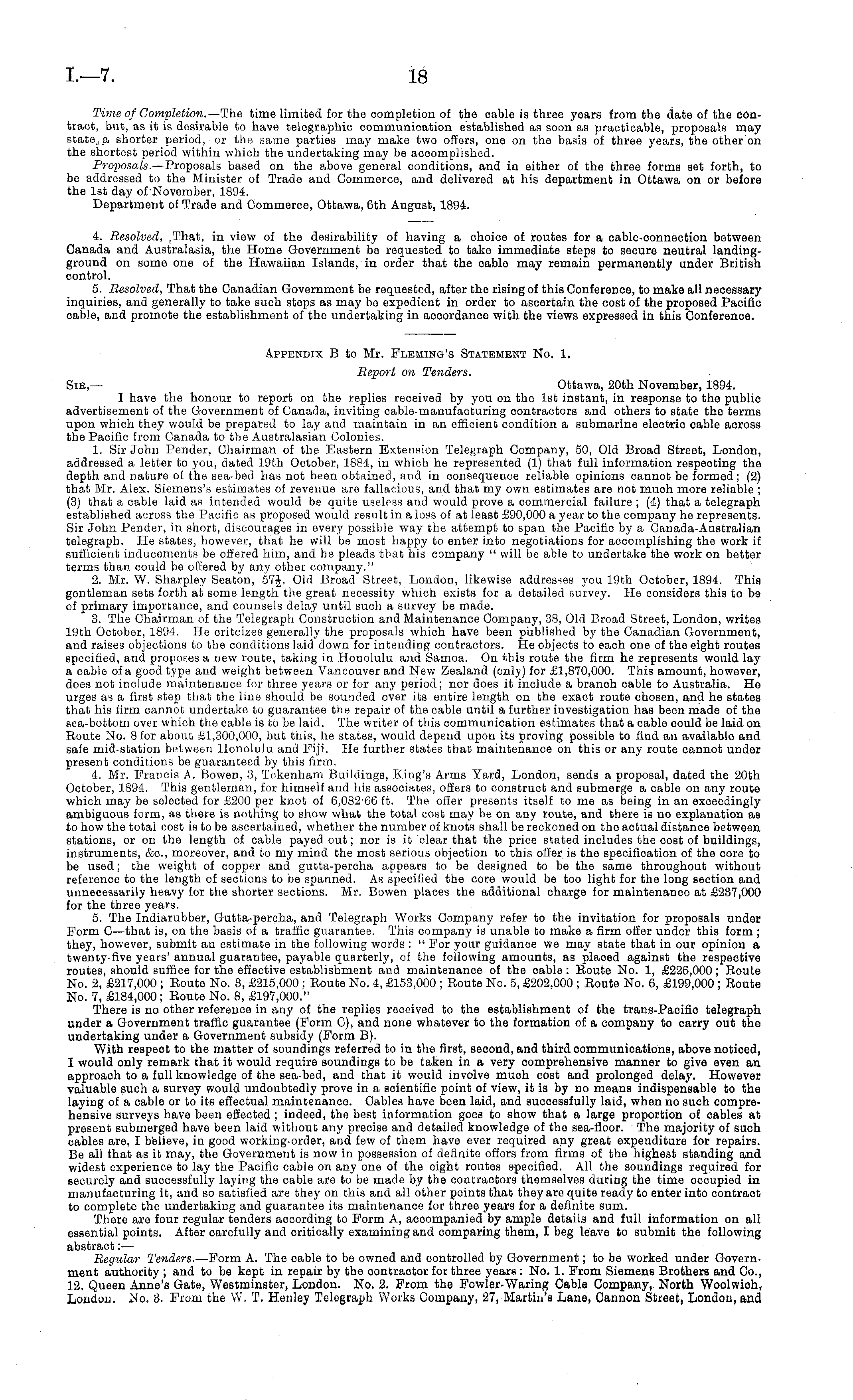 Time of Completion.— The time limited for the completion of the cable is three years from the date of the contract, but, as it is desirable to have telegraphic communication established as soon as practicable, proposals may state,, a shorter period, or the same parties may make two offers, one on the basis of three years, the other on the shortest period within which the undertaking may be accomplished. Proposals. —Proposals based on the above general conditions, and in either of the three forms set forth, to be addressed to the Minister of Trade and Commerce, and delivered at his department in Ottawa on or before the Ist day of November, 1894. Department of Trade and Commerce, Ottawa, 6th August, 1894. 4. Resolved, ,That, in view of the desirability of having a choice of routes for a cable-connection between Canada and Australasia, the Home Government ba requested to take immediate steps to secure neutral landingground on some one of the Hawaiian Islands, in order that the cable may remain permanently under British control. 5. Resolved, That the Canadian Government be requested, after the rising of this Conference, to make all necessary inquiries, and generally to take such steps as may be expedient in order to ascertain the cost of the proposed Pacific cable, and promote the establishment of the undertaking in accordance with the views expressed in this Conference. Appendix B to Mr. Fleming's Statement No. 1. Report on Tenders. Sib,— Ottawa, 20th November, 1894. I have the honour to report on the replies received by you on the Ist instant, in response to the public advertisement of the Government of Canada, inviting cable-manufacturing contractors and others to state the terms upon which they would be prepared to lay and maintain in an efficient condition a submarine electric oable across the Pacific from Canada to the Australasian Colonies. 1. Sir John Pender, Chairman of the Eastern Extension Telegraph Company, 50, Old Broad Street, London, addressed a letter to you, dated 19th October, 1884, in which he represented (1) that full information respecting the depth and nature of the sea-bed has not been obtained, and in consequence reliable opinions cannot be formed; (2) that Mr. Alex. Siemens's estimates of revenue are fallacious, and that my own estimates are not much more reliable ; (3) that a cable laid as intended would be quite useless and would prove a commercial failure ; (4) that a telegraph established across the Pacific as proposed would result in a loss of at least £90,000 a year to the company he represents. Sir John Pender, in short, discourages in every possible way the attempt to span the Pacific by a Canada-Australian telegraph. He states, however, that he will be most happy to enter into negotiations for accomplishing the work if sufficient inducements be offered him, and he pleads that his company " will be able to undertake the work on better terms than could be offered by any other company." 2. Mr. W. Sharpley Seaton, 57£, Old Broad Street, London, likewise addresses you 19th October, 1894. This gentleman sets forth at some length the great necessity which exists for a detailed survey. Hβ considers this to be of primary importance, and counsels delay until such a survey be made. 3. The Chairman of the Telegraph Construction and Maintenance Company, 38, Old Broad Street, London, writes 19th October, 1894. He critcizes generally the proposals which have been published by the Canadian Government, and raises objections to the conditions laid down for intending contractors. He objects to each one of the eight routes specified, and proposes a new route, taking in Honolulu and Samoa. On this route the firm he represents would lay a cable of a good type and weight between Vancouver and New Zealand (onlj) for £1,870,000. This amount, however, does not include maintenance for three years or for any period; nor does it include a branch cable to Australia. He urges as a first step that the line should be sounded over its entire length on the exact route chosen, and he states that his firm cannot undertake to guarantee the repair of the cable until a further investigation has been made of the sea-bottom over which the cable is to be laid. The writer of this communication estimates that a cable could be laid on Route No. 8 for about £1,300,000, but this, he states, would depend upon its proving possible to find an available and safe mid-station between Honolulu and Fiji. He further states that maintenance on this or any route cannot under present conditions be guaranteed by this firm. 4. Mr. Francis A. Bowen, 8, Tokenham Buildings, King's Arms Yard, London, sends a proposal, dated the 20th October, 1894. This gentleman, for himself and his associates, offers to construct and submerge a cable on any route which may be selected for £200 per knot of 6,08266 ft. The offer presents itself to me as being in an exceedingly ambiguous form, as there is nothing to show what the total cost may be on any route, and there is no explanation as to how the total cost is to be ascertained, whether the number of knots shall be reckoned on the actual distance between stations, or on the length of cable payed out; nor is it clear that the price stated includes the cost of buildings, instruments, &c, moreover, and to my mind the most serious objection to this offer is the specification of the core to be used; the weight of copper and gutta-percha appears to be designed to be the same throughout without reference to the length of sections to be spanned. As specified the core would be too light for the long section and unnecessarily heavy for the shorter sections. Mr. Bowen places the additional charge for maintenance at £237,000 for the three years. 5. The Indiarubber, Gutta-percha, and Telegraph Works Company refer to the invitation for proposals under Form C—that is, on the basis of a traffic guarantee. This company is unable to make a firm offer under this form ; they, however, submi