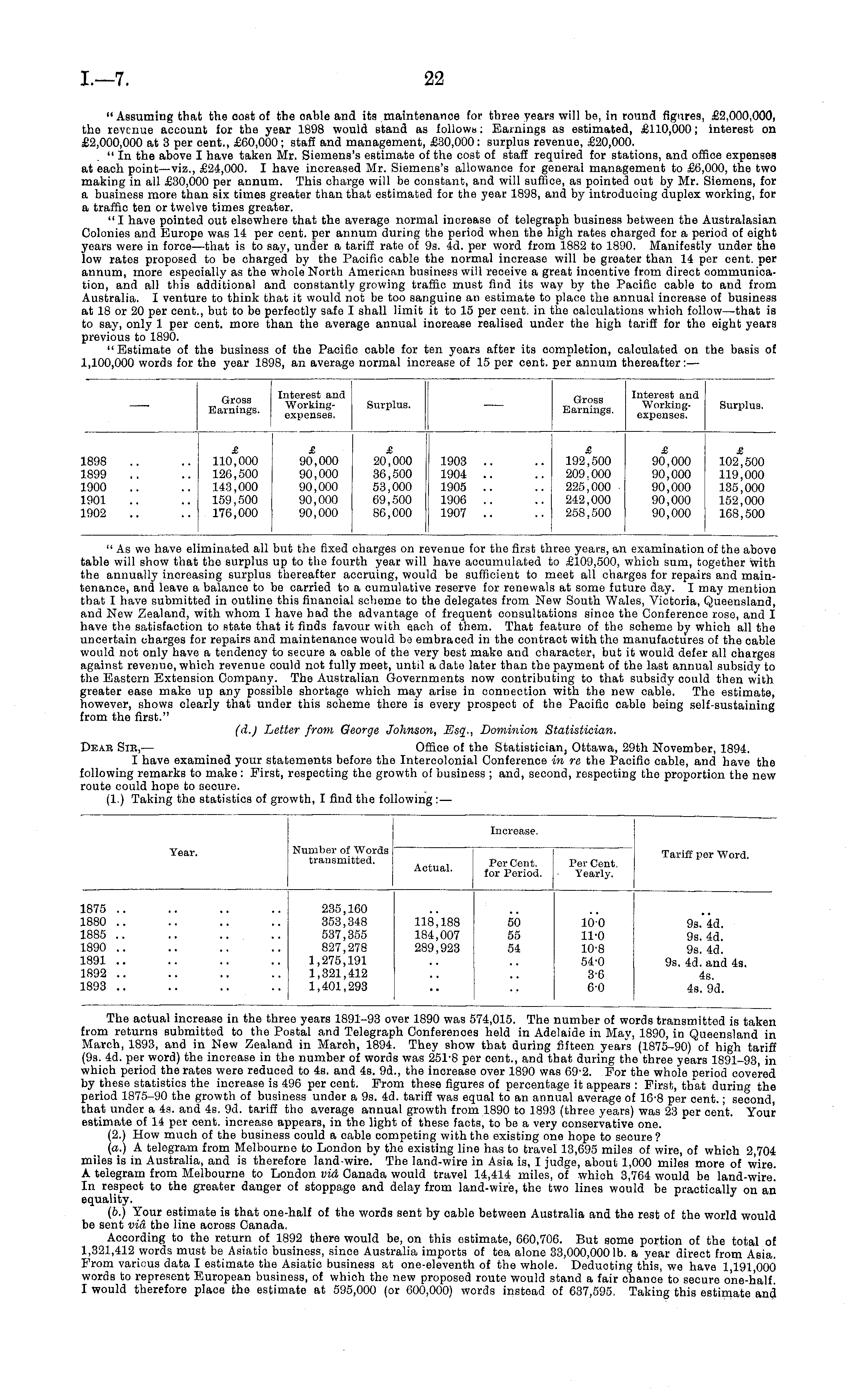 " As we have eliminated all but the fixed charges on revenue for the first three yeats, an examination of the above table will show that the surplus up to the fourth year will have accumulated to £109,500, which sum, together with the annually increasing surplus thereafter accruing, would be sufficient to meet all charges for repairs and maintenance, and leave a balance to be carried to a cumulative reserve for renewals at some future day. I may mention that I have submitted in outline this financial scheme to the delegates from New South Wales, Victoria, Queensland, and New Zealand, with whom I have had the advantage of frequent consultations since the Conference rose, and I have the satisfaction to Btate that it finds favour with each of them. That feature of the scheme by which all the uncertain charges for repairs and maintenance would be embraced in the contract with the manufactures of the cable would not only have a tendency to secure a cable of the very best make and character, but it would defer all charges against revenue, which revenue could not fully meet, until a date later than the payment of the last annual subsidy to the Eastern Extension Company. The Australian Governments now contributing to that subsidy could then with greater ease make up any possible shortage which may arise in connection with the new cable. The estimate, however, shows clearly that under this scheme there is every prospect of the Pacific cable being self-sustaining from the first." (d.J Letter from George Johnson, Esq., Dominion Statistician. Deah Sir, — Office of the Statistician, Ottawa, 29th November, 1894. I have examined your statements before the Intercolonial Conference in re the Pacific cable, and have the following remarks to make: First, respecting the growth of business ; and, second, respecting the proportion the new route could hope to secure. (1.) Taking the statistics of growth, I find the following:—