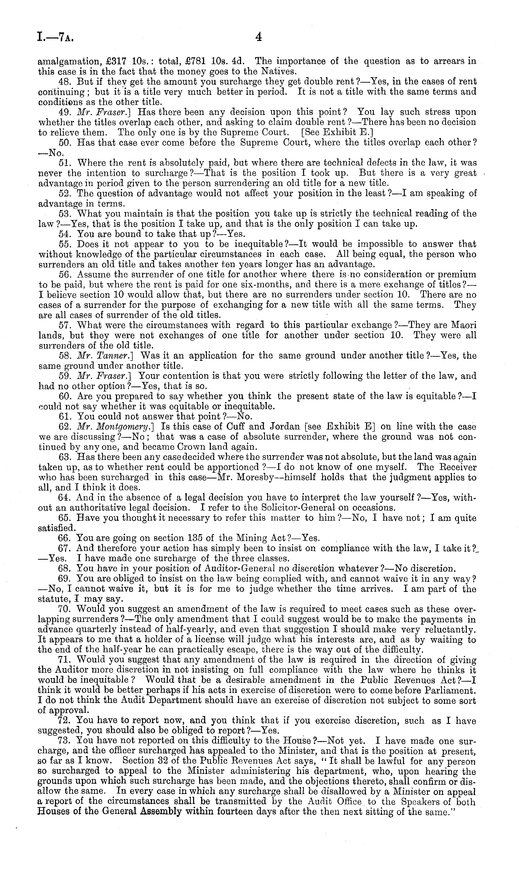 amalgamation, £317 10s.: total, £781 10s. 4d. The importance of the question as to arrears in this case is in the fact that the money goes to the Natives. 48. But if they get the amount you surcharge they get double rent ?—Yes, in the cases of rent continuing ; but it is a title very much better in period. It is not a title with the same terms and conditions as the other title. 49. Mr. Fraser.] Has there been any decision upon this point ? You lay such stress upon whether the titles overlap each other, and asking to claim double rent ?—There has been no decision to relieve them. The only one is by the Supreme Court. [See Exhibit E.] 50. Has that case ever come before the Supreme Court, where the titles overlap each other ? —No. 51. Where the rent is absolutely paid, but where there are technical defects in the law, it was never the intention to surcharge ? —That is the position I took up. But there is a very great advantage in period given to the person surrendering an old title for a new title. 52. The question of advantage would not affect your position in the least ? —I am speaking of advantage in terms. 53. What you maintain is that the position you take up is strictly the technical reading of the law ?—Yes, that is the position I take up, and that is the only position I can take up. 54. You are bound to take that up ?—Yes. 55. Does it not appear to you to be inequitable?—lt would be impossible to answer that without knowledge of the particular circumstances in each case. All being equal, the person who surrenders an old title and takes another ten years longer has an advantage. 56. Assume the surrender of one title for another where there is no consideration or premium to be paid, but where the rent is paid for one six-months, and there is a mere exchange of titles?— I believe section 10 would allow that, but there are no surrenders under section 10. There are no cases of a surrender for the purpose of exchanging for a new title with all the same terms. They are all cases of surrender of the old titles. 57. What were the circumstances with regard to this particular exchange ?—They are Maori lands, but they were not exchanges of one title for another under section 10. They were all surrenders of the old title. 58. Mr. Tanner.] Was it an application for the same ground under another title ?—Yes, the same ground under another title. 59. Mr. Fraser.] Your contention is that you were strictly following the letter of the law, and had no other option ? —Yes, that is so. 60. Are you prepared to say whether you think the present state of the law is equitable ?—I could not say whether it was equitable or inequitable. 61. You could not answer that point ?—No. 62. Mr. Montgomery.] Is this case of Cuff and Jordan [see Exhibit E] on line with the case we are discussing ? —No; that was a case of absolute surrender, where the ground was not continued by any one, and became Crown land again. 63. Has there been any casedecided where the surrender was not absolute, but the land was again taken up, as to whether rent could be apportioned ? —I do not know of one myself. The Receiver who has been surcharged in this case—Mr. Moresby—himself holds that the judgment applies to all, and I think it does. 64. And in the absence of a legal decision you have to interpret the law yourself ? —Yes, without an authoritative legal decision. I refer to the Solicitor-General on occasions. 65. Have you thought it necessary to refer this matter to him?—No, I have not; I am quite satisfied. 66. You are going on section 135 of the Mining Act ?—Yes. 67. And therefore your action has simply been to insist on compliance with the law, I take it?. —Yes. I have made one surcharge of the three classes. 68. You have in your position of Auditor-General no discretion whatever ?—No discretion. 69. You are obliged to insist on the law being complied with, and cannot waive it in any way ? —No, I cannot waive it, but it is for me to judge whether the time arrives. lam part of the statute, I may say. 70. Would you suggest an amendment of the law is required to meet cases such as these overlapping surrenders ?—The only amendment that I could suggest would be to make the payments in advance quarterly instead of half-yearly, and even that suggestion I should make very reluctantly. It appears to me that a holder of a license will judge what his interests are, and as by waiting to the end of the half-year he can practically escape, there is the way out of the difficulty. 71. Would you suggest that any amendment of the law is required in the direction of giving the Auditor more discretion in not insisting on full compliance with the law where he thinks it would be inequitable ? Would that be a desirable amendment in the Public Eevenues Act ?—I think it would be better perhaps if his acts in exercise of discretion were to come before Parliament. I do not think the Audit Department should have an exercise of discretion not subject to some sort of approval. 72. You have to report now, and you think that if you exercise discretion, such as I have suggested, you should also be obliged to report? —Yes. 73. You have not reported on this difficulty to the House ?—Not yet. I have made one surcharge, and the officer surcharged has appealed to the Minister, and that is the position at present, so far as I know. Section 32 of the Public Revenues Act says, "It shall be lawful for any person so surcharged to appeal to the Minister administering his department, who, upon hearing the grounds upon which such surcharge has been made, and the objections thereto, shall confirm or disallow the same. In every case in which any surcharge shall be disallowed by a Minister on appeal a report of the circumstances shall be transmitted by the Audit Office to the Speakers of both Houses of the General Assembly within fourteen days after the then next sitting of the same."