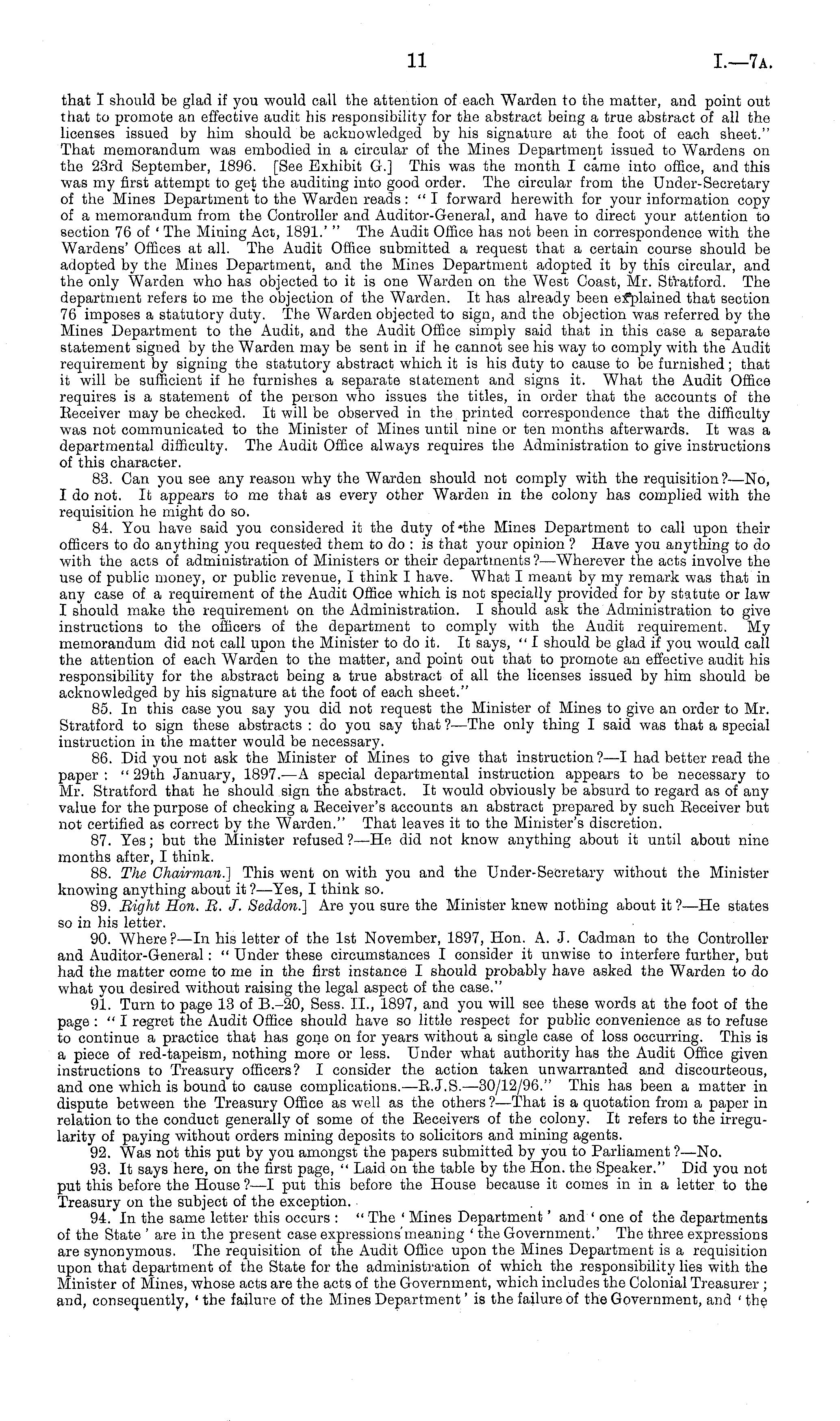 that I should be glad if you would call the attention of each Warden to the matter, and point out that to promote an effective audit his responsibility for the abstract being a true abstract of all the licenses issued by him should be acknowledged by his signature at the foot of each sheet." That memorandum was embodied in a circular of the Mines Department issued to Wardens on the 23rd September, 1896. [See Exhibit G.] This was the month I came into office, and this was my first attempt to get the auditing into good order. The circular from the Under-Secretary of the Mines Department to the Warden reads : " I forward herewith for your information copy of a memorandum from the Controller and x~r-General, and have to direct your attention to section 76 of ' The Mining Act, 1891.' ,: The Audit Office has not been in correspondence with the Wardens' Offices at all. The Audit Office submitted a request that a certain course should be adopted by the Mines Department, and the Mines Department adopted it by this circular, and the only Warden who has objected to it is one Warden on the West Coast, Mr. Stratford. The department refers to me the objection of the Warden. It has already been explained that section 76 imposes a statutory duty. The Warden objected to sign, and the objection was referred by the Mines Department to the Audit, and the Audit Office simply said that in this case a separate statement signed by the Warden may be sent in if he cannot see his way to comply with the Audit requirement by signing the statutory abstract which it is his duty to cause to be furnished; that it will be sufficient if he furnishes a separate statement and signs it. What the Audit Office requires is a statement of the person who issues the titles, in order that the accounts of the Receiver may be checked. It will be observed in the printed correspondence that the difficulty was not communicated to the Minister of Mines until nine or ten months afterwards. It was a departmental difficulty. The Audit Office always requires the Administration to give instructions of this character. 83. Can you see any reason why the Warden should not comply with the requisition?—No, Ido not. It appears to me that as every other Warden in the colony has complied with the requisition he might do so. 84. You have said you considered it the duty of the Mines Department to call upon their officers to do anything you requested them to do : is that your opinion ? Have you anything to do with the acts of administration of Ministers or their departments ?—Wherever the acts involve the use of public money, or public revenue, I think I have. What I meant by my remark was that in any case of a requirement of the Audit Office which is not specially provided for by statute or law I should make the requirement on the Administration. I should ask the Administration to give instructions to the officers of the department to comply with the Audit requirement. My memorandum did not call upon the Minister to do it. It says, " I should be glad if you would call the attention of each Warden to the matter, and point out that to promote an effective audit his responsibility for the abstract being a true abstract of all the licenses issued by him should be acknowledged by his signature at the foot of each sheet." 85. In this case you say you did not request the Minister of Mines to give an order to Mr. Stratford to sign these abstracts : do you say that ?—The only thing I said was that a special instruction in the matter would be necessary. 86. Did you not ask the Minister of Mines to give that instruction?—l had better read the paper: "29th January, 1897. —A special departmental instruction appears to be necessary to Mr. Stratford that he should sign the abstract. It would obviously be absurd to regard as of any value for the purpose of checking a Receiver's accounts an abstract prepared by such Receiver but not certified as correct by the Warden." That leaves it to the Minister's discretion. 87. Yes; but the Minister refused ? —He did not know anything about it until about nine months after, I think. 88. The Chairman.'] This went on with you and the Under-Secretary without the Minister knowing anything about it ? —Yes, I think so. 89. Bight Hon. B. J. Seddon.] Are you sure the Minister knew nothing about it ?—He states so in his letter. 90. Where P —ln his letter of the Ist November, 1897, Hon. A. J. Cadman to the Controller and Auditor-General: " Under these circumstances I consider it unwise to interfere further, but had the matter come to me in the first instance I should probably have asked the Warden to do what you desired without raising the legal aspect of the case." 91. Turn to page 13 of 8.-20, Sess. 11., 1897, and you will see these words at the foot of the page : "I regret the Audit Office should have so little respect for public convenience as to refuse to continue a practice that has gone on for years without a single case of loss occurring. This is a piece of red-tapeism, nothing more or less. Under what authority has the Audit Office given instructions to Treasury officers? I consider the action taken unwarranted and discourteous, and one which is bound to cause complications.—R.J.S. —30/12/96." This has been a matter in dispute between the Treasury Office as well as the others ?—That is a quotation from a paper in relation to the conduct generally of some of the Receivers of the colony. It refers to the irregularity of paying without orders mining deposits to solicitors and mining agents. 92. Was not this put by you amongst the papers submitted by you to Parliament ?—No. 93. It says here, on the first page, " Laid on the table by the Hon. the Speaker." Did you not put this before the House ? —I put this before the House because it comes in in a letter to the Treasury on the subject of the exception. 94. In the same letter this occurs : " The ' Mines Department' and ' one of the departments of the State '