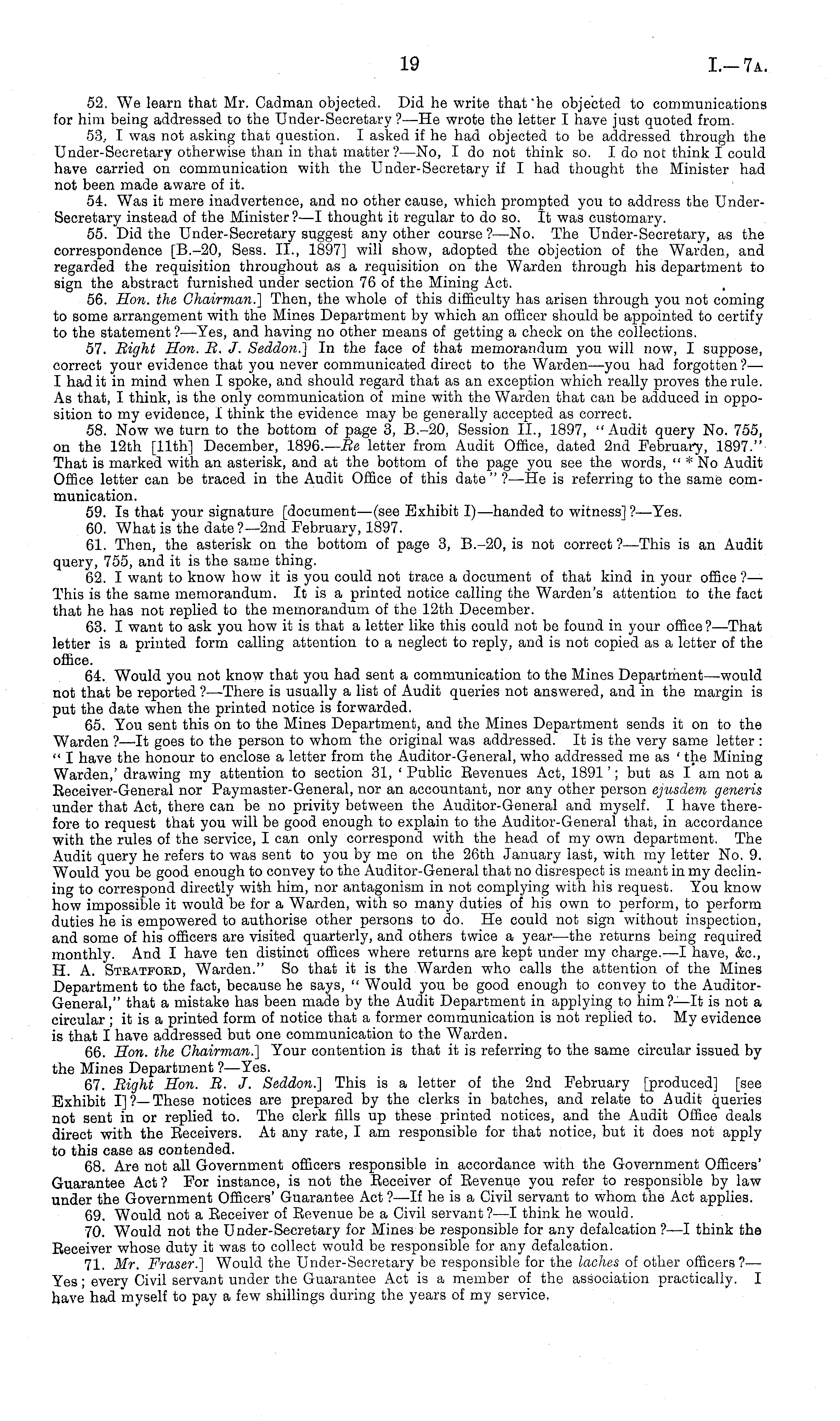 52. We learn that Mr. Cadman objected. Did he write that'he objected to communications for him being addressed to the Under-Secretary ?—He wrote the letter I have just quoted from. 53. I was not asking that question. I asked if he had objected to be addressed through the Under-Secretary otherwise than in that matter?—No, I do not think so. Ido not think I could have carried on communication with the Under-Secretary if I had thought the Minister had not been made aware of it. 54. Was it mere inadvertence, and no other cause, which prompted you to address the Undersecretary instead of the Minister ?—I thought it regular to do so. It was customary. 55. Did the Under-Secretary suggest any other course ?—No. The Under-Secretary, as the correspondence [8.-20, Sess. 11., 1897] will show, adopted the objection of the Warden, and regarded the requisition throughout as a requisition on the Warden through his department to sign the abstract furnished under section 76 of the Mining Act. 56. Hon. the Chairman.'] Then, the whole of this difficulty has arisen through you not coming to some arrangement with the Mines Department by which an officer should be appointed to certify to the statement ?—Yes, and having no other means of getting a check on the collections. 57. Bight Hon. B. J. Seddon.] In the face of that memorandum you will now, I suppose, correct your evidence that you never communicated direct to the Warden —you had forgotten'?— I had it in mind when I spoke, and should regard that as an exception which really proves the rule. As that, I think, is the only communication of mine with the Warden that can be adduced in opposition to my evidence, 1 think the evidence may be generally accepted as correct. 58. Now we turn to the bottom of page 3, 8.-20, Session 11., 1897, "Audit query No. 755, on the 12th [11th] December, 1896.—8e letter from Audit Office, dated 2nd February, 1897." That is marked with an asterisk, and at the bottom of the page you see the words, " * No Audit Office letter can be traced in the Audit Office of this date " ?—He is referring to the same communication. 59. Is that your signature [document —(see Exhibit I) —handed to witness] ?—Yes. 60. What is the date?—2nd February, 1897. 61. Then, the asterisk on the bottom of page 3, 8.-20, is not correct ?—This is an Audit query, 755, and it is the same thing. 62. I want to know how it is you could not trace a document of that kind in your office ?— This is the same memorandum. It is a printed notice calling the Warden's attention to the fact that he has not replied to the memorandum of the 12th December. 63. I want to ask you how it is that a letter like this could not be found in your office ?—That letter is a printed form calling attention to a neglect to reply, and is not copied as a letter of the office. 64. Would you not know that you had sent a communication to the Mines Department—would not that be reported ?—There is usually a list of Audit queries not answered, and in the margin is put the date when the printed notice is forwarded. 65. You sent this on to the Mines Department, and the Mines Department sends it on to the Warden ? —lt goes to the person to whom the original was addressed. It is the very same letter : " I have the honour to enclose a letter from the Auditor-General, who addressed me as ' the Mining Warden, , drawing my attention to section 31, ' Public Revenues Act, 1891'; but as lam not a Eeceiver-General nor Paymaster-General, nor an accountant, nor any other person ejusdem generis under that Act, there can be no privity between the Auditor-General and myself. I have therefore to request that you will be good enough to explain to the Auditor-General that, in accordance with the rules of the service, I can only correspond with the head of my own department. The Audit query he refers to was sent to you by me on the 26th January last, with my letter No. 9. Would you be good enough to convey to the Auditor-General that no disrespect is meant in my declining to correspond directly with him, nor antagonism in not complying with his request. You know how impossible it would be for a Warden, with so many duties of his own to perform, to perform duties he is empowered to authorise other persons to do. He could not sign without inspection, and some of his officers are visited quarterly, and others twice a year—the returns being required monthly. And I have ten distinct offices where returns are kept under my charge.—l have, &c, H. A. Stratford, Warden." So that it is the Warden who calls the attention of the Mines Department to the fact, because he says, " Would you be good enough to convey to the AuditorGeneral," that a mistake has been made by the Audit Department in applying to him? —It is not a circular ;itis a printed form of notice that a former communication is not replied to. My evidence is that I have addressed but one communication to the Warden. 66. Hon. the Chairman.] Your contention is that it is referring to the same circular issued by the Mines Department ? —Yes. 67. Bight Hon. B. J. Seddon.] This is a letter of the 2nd February [produced] [see Exhibit I]? —These notices are prepared by the clerks in batches, and relate to Audit queries not sent in or replied to. The clerk fills up these printed notices, and the Audit Office deals direct with the Receivers. At any rate, I am responsible for that notice, but it does not apply to this case as contended. 68. Are not all Government officers responsible in accordance with the Government Officers' Guarantee Act ? For instance, is not the Receiver of Revenue you refer to responsible by law under the Government Officers' Guarantee Act ?—lf he is a Civil servant to whom the Act applies. 69. Would not a Receiver of Revenue be a Civil servant?—l think he would. 70. Would not the Under-Secretary for Mines be responsible for any defalcation?—l think the Receiver whose duty it was to collect would be responsibl