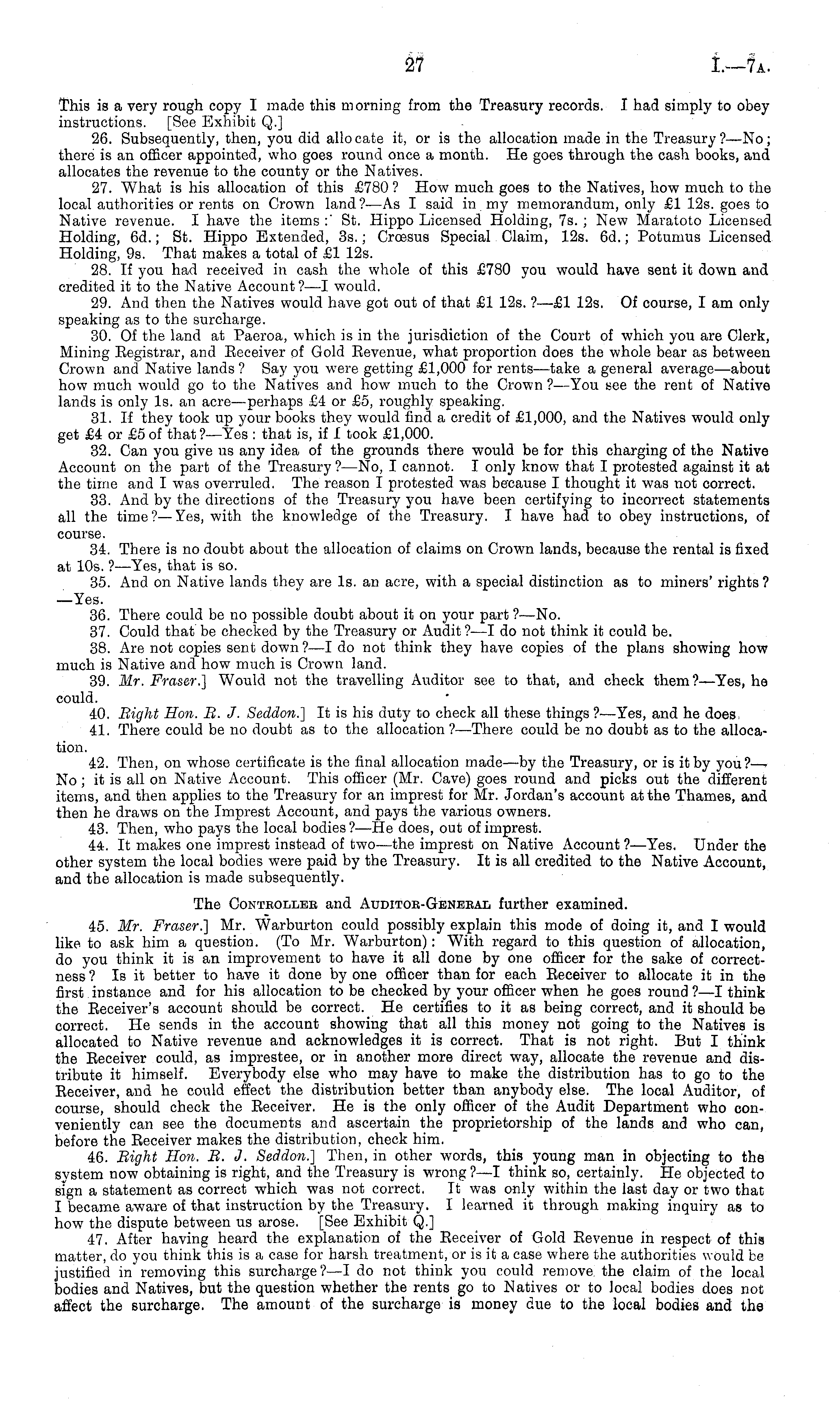 This is a very rough copy I made this morning from the Treasury records. I had simply to obey instructions. [See Exhibit Q.] 26. Subsequently, then, you did allocate it, or is the allocation made in the Treasury?—No; there is an officer appointed, who goes round once a month. He goes through the cash books, and allocates the revenue to the county or the Natives. 27. What is his allocation of this £780 ? How much goes to the Natives, how much to the local authorities or rents on Crown land?—As I said in my memorandum, only £1 12s. goes to Native revenue. I have the items :' St. Hippo Licensed Holding, 7s. ; New Maratoto Licensed Holding, 6d.; St. Hippo Extended, 35.; Crossus Special Claim, 12s. 6d.; Potumus Licensed Holding, 9s. That makes a total of £1 12s. 28. If you had received in cash the whole of this £780 you would have sent it down and credited it to the Native Account? —I would. 29. And then the Natives would have got out of that £1 12s. ?—£l 12s. Of course, lam only speaking as to the surcharge. 30. Of the land at Paeroa, which is in the jurisdiction of the Court of which you are Clerk, Mining Eegistrar, and Eeceiver of Gold Eevenue, what proportion does the whole bear as between Crown and Native lands ? Say you were getting £1,000 for rents—take a general average—about how much would go to the Natives and how much to the Crown ?—You see the rent of Native lands is only Is. an acre —perhaps £4 or £5, roughly speaking. 31. If they took up your books they would find a credit of £1,000, and the Natives would only get £4 or £5 of that ?—Yes : that is, if 1 took £1,000. 32. Can you give us any idea of the grounds there would be for this charging of the Native Account on the part of the Treasury ? —No, I cannot. I only know that I protested against it at the time and I was overruled. The reason I protested was because I thought it was not correct. 33. And by the directions of the Treasury you have been certifying to incorrect statements all the time?— Yes, with the knowledge of the Treasury. I have had to obey instructions, of course. 34. There is no doubt about the allocation of claims on Crown lands, because the rental is fixed at 10s. ? —Yes, that is so. 35. And on Native lands they are Is. an acre, with a special distinction as to miners' rights? —Yes. 36. There could be no possible doubt about it on your part ?—No. 37. Could that be checked by the Treasury or Audit?—l do not think it could be. 38. Are not copies sent down?—l do not think they have copies of the plans showing how much is Native and how much is Crown land. 39. Mr. Fraser.] Would not the travelling Auditor see to that, and check them?— Yes, he could. 40. Bight Hon. B. J. Seddon.] It is his duty to check all these things ?—Yes, and he does, 41. There could be no doubt as to the allocation ?—There could be no doubt as to the allocation. 42. Then, on whose certificate is the final allocation made—by the Treasury, or is it by you?—No; it is all on Native Account. This officer (Mr. Cave) goes round and picks out the different items, and then applies to the Treasury for an imprest for Mr. Jordan's account at the Thames, and then he draws on the Imprest Account, and pays the various owners. 43. Then, who pays the local bodies ?—He does, out of imprest. 44. It makes one imprest instead of two—the imprest on Native Account ?—Yes. Under the other system the local bodies were paid by the Treasury. It is all credited to the Native Account, and the allocation is made subsequently. The Conteollee and Auditoe-Gbneeal further examined. 45. Mr. Fraser.] Mr. Warburton could possibly explain this mode of doing it, and I would like to ask him a question. (To Mr. Warburton): With regard to this question of allocation, do you think it is an improvement to have it all done by one officer for the sake of correctness ? Is it better to have it done by one officer than for each Receiver to allocate it in the first instance and for his allocation to be checked by your officer when he goes round ?—I think the Eeceiver's account should be correct. He certifies to it as being correct, and it should be correct. He sends in the account showing that all this money not going to the Natives is allocated to Native revenue and acknowledges it is correct. That is not right. But I think the Eeceiver could, as imprestee, or in another more direct way, allocate the revenue and distribute it himself. Everybody else who may have to make the distribution has to go to the Eeceiver, and he could effect the distribution better than anybody else. The local Auditor, of course, should check the Eeceiver. He is the only officer of the Audit Department who conveniently can see the documents and ascertain the proprietorship of the lands and who can, before the Eeceiver makes the distribution, check him. 46. Bight Hon. B. J. Seddon.] Then, in other words, this young man in objecting to the system now obtaining is right, and the Treasury is wrong ? —I think so, certainly. He objected to sign a statement as correct which was not correct. It was only within the last day or two that I became aware of that instruction by the Treasury. I learned it through making inquiry as to how the dispute between us arose. [See Exhibit Q.] 47. After having heard the explanation of the Eeceiver of Gold Eevenue in respect of this matter, do you think this is a case for harsh treatment, or is it a case where the authorities would be justified in removing this surcharge? —I do not think you could remove the claim of the local bodies and Natives, but the question whether the rents go to Natives or to local bodies does not affect the surcharge. The amount of the surcharge is money due to the local bodies and the