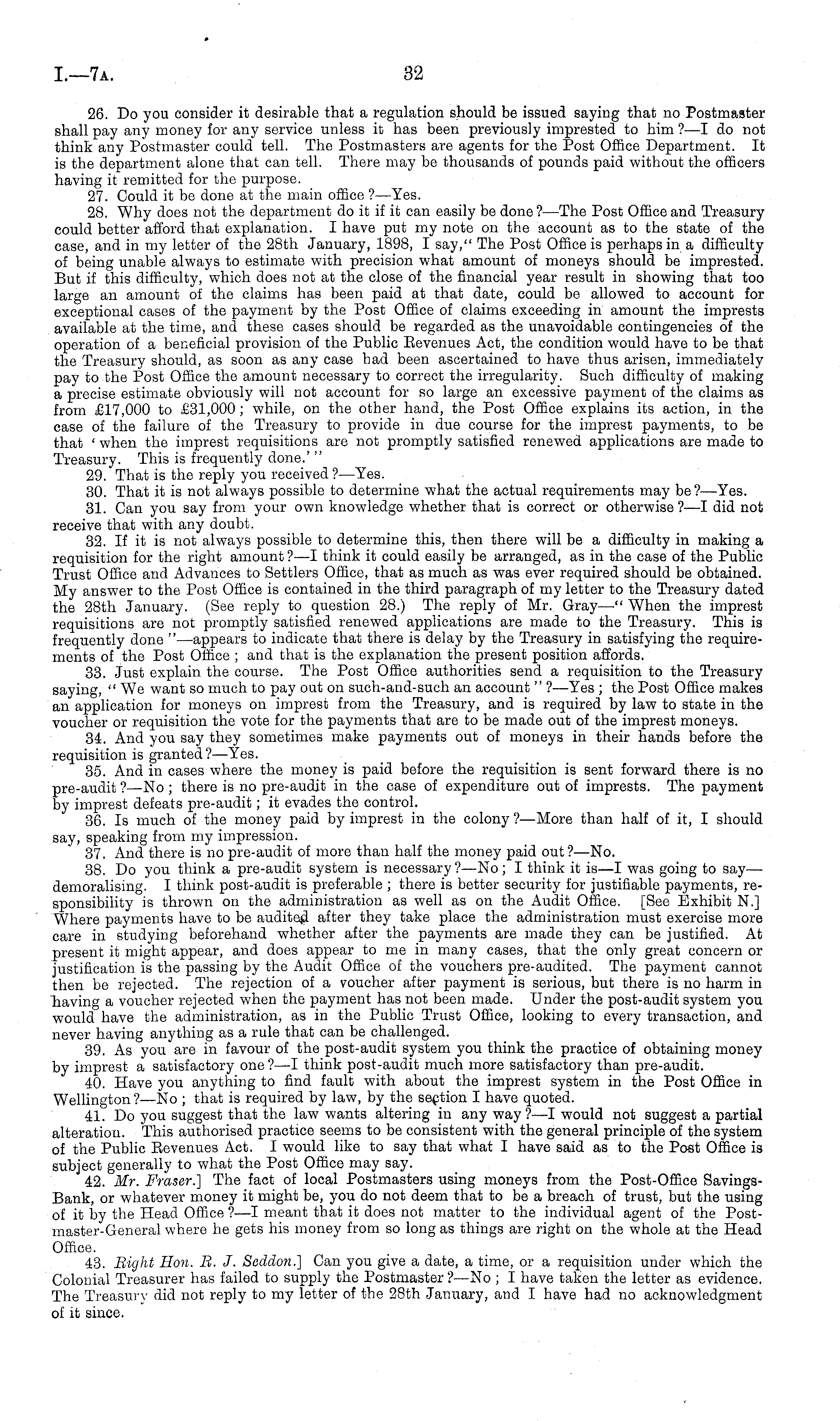 26. Do you consider it desirable that a regulation should be issued saying that no Postmaster shall pay any money for any service unless it has been previously imprested to him ?—I do not think any Postmaster could tell. The Postmasters are agents for the Post Office Department. It is the department alone that can tell. There may be thousands of pounds paid without the officers having it remitted for the purpose. 27. Could it be done at the main office ?—Yes. 28. Why does not the department do it if it can easily be done ? —The Post Office and Treasury could better afford that explanation. I have put my note on the account as to the state of the case, and in my letter of the 28th January, 1898, I say," The Post Office is perhaps in a difficulty of being unable always to estimate with precision what amount of moneys should be imprested. But if this difficulty, which does not at the close of the financial year result in showing that too large an amount of the claims has been paid at that date, could be allowed to account for exceptional cases of the payment by the Post Office of claims exceeding in amount the imprests available at the time, and these cases should be regarded as the unavoidable contingencies of the operation of a beneficial provision of the Public Eevenues Act, the condition would have to be that the Treasury should, as soon as any case bad been ascertained to have thus arisen, immediately pay to the Post Office the amount necessary to correct the irregularity. Such difficulty of making a precise estimate obviously will not account for so large an excessive payment of the claims as from £17,000 to £31,000 ; while, on the other hand, the Post Office explains its action, in the case of the failure of the Treasury to provide in due course for the imprest payments, to be that ' when the imprest requisitions are not promptly satisfied renewed applications are made to Treasury. This is frequently done.' " 29. That is the reply you received?— Yes. 30. That it is not always possible to determine what the actual requirements may be?— Yes. 31. Can you say from your own knowledge whether that is correct or otherwise ?—I did not receive that with any doubt. 32. If it is not always possible to determine this, then there will be a difficulty in making a requisition for the right amount ? —I think it could easily be arranged, as in the case of the Public Trust Office and Advances to Settlers Office, that as much as was ever required should be obtained. My answer to the Post Office is contained in the third paragraph of my letter to the Treasury dated the 28th January. (See reply to question 28.) The reply of Mr. Gray—" "When the imprest requisitions are not promptly satisfied renewed applications are made to the Treasury. This is frequently done " —appears to indicate that there is delay by the Treasury in satisfying the requirements of the Post Office ; and that is the explanation the present position affords. 33. Just explain the course. The Post Office authorities send a requisition to the Treasury saying, " We want so much to pay out on such-and-such an account " ?—Yes ; the Post Office makes an application for moneys on imprest from the Treasury, and is required by law to state in the voucher or requisition the vote for the payments that are to be made out of the imprest moneys. 34. And you say they sometimes make payments out of moneys in their hands before the requisition is granted? —Yes. 35. And in cases where the money is paid before the requisition is sent forward there is no pre-audit ?—No ; there is no pre-audit in the case of expenditure out of imprests. The payment by imprest defeats pre-audit; it evades the control. 36. Is much of the money paid by imprest in the colony ?—More than half of it, I should say, speaking from my impression. 37. And there is no pre-audit of more than half the money paid out?— No. 38. Do you think a pre-audit system is necessary?—No; I think it is—l was going to say— demoralising. I think post-audit is preferable ; there is better security for justifiable payments, responsibility is thrown on the administration as well as on the Audit Office. [See Exhibit N.] Where payments have to be audited after they take place the administration must exercise more care in studying beforehand whether after the payments are made they can be justified. At present it might appear, and does appear to me in many cases, that the only great concern or justification is the passing by the Audit Office of the vouchers pre-audited. The payment cannot then be rejected. The rejection of a voucher after payment is serious, but there is no harm in having a voucher rejected when the payment has not been made. Under the post-audit system you would have the administration, as in the Public Trust Office, looking to every transaction, and never having anything as a rule that can be challenged. 39. As you are in favour of the post-audit system you think the practice of obtaining money by imprest a satisfactory one ? —I think post-audit much more satisfactory than pre-audit. 40. Have you anything to find fault with about the imprest system in the Post Office in Wellington? —No ; that is required by law, by the section I have quoted. 41. Do you suggest that the law wants altering in any way ?—I would not suggest a partial alteration. This authorised practice seems to be consistent with the general principle of the system of the Public Eevenues Act. I would like to say that what I have said as to the Post Office is subject generally to what the Post Office may say. 42. Mr. Fraser.] The fact of local Postmasters using moneys from the Post-Office SavingsBank, or whatever money it might be, you do not deem that to be a breach of trust, but the using of it by the Head Office ?—I meant that it does not matter to the individual agent of the Post-master-General where he gets his money from so long as things are right on the whole at the Head Offic