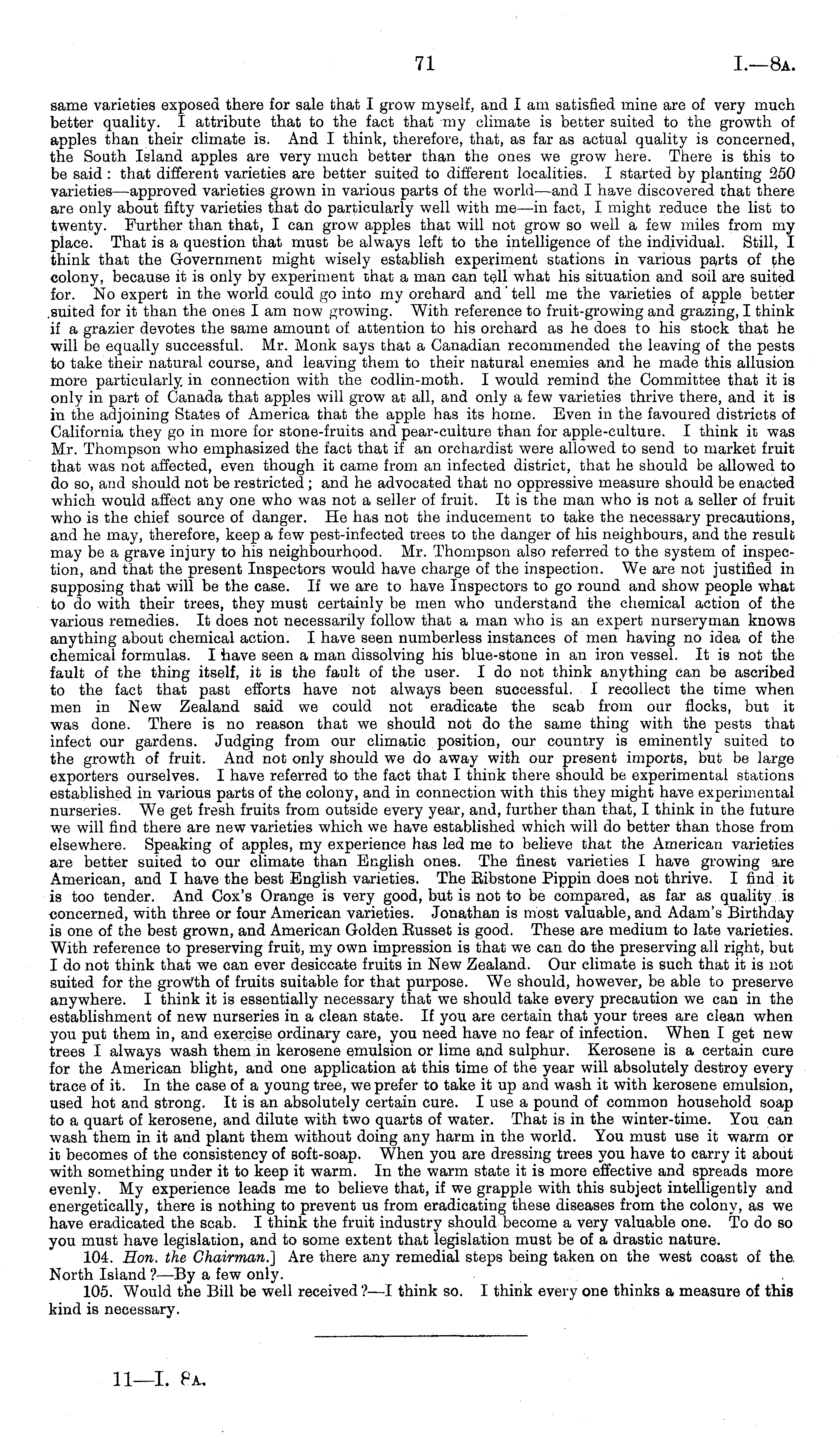 same varieties exposed there for sale that I grow myself, and I am satisfied mine are of very much better quality. I attribute that to the fact that my climate is better suited to the growth of apples than their climate is. And I think, therefore, that, as far as actual quality is concerned, the South Island apples are very much better than the ones we grow here. There is this to be said : that different varieties are better suited to different localities. I started by planting 250 varieties —approved varieties grown in various parts of the world—and I have discovered that there are only about fifty varieties that do particularly well with me —in fact, I might reduce the list to twenty. Further than that, I can grow apples that will not grow so well a few miles from my place. That is a question that must be always left to the intelligence of the individual. Still, I think that the Government might wisely establish experiment stations in various parts of the colony, because it is only by experiment that a man can tell what his situation and soil are suited for. No expert in the world could go into my orchard and' tell me the varieties of apple better .suited for it than the ones lam now growing. With reference to fruit-growing and grazing, I think if a grazier devotes the same amount of attention to his orchard as he does to his stock that he will be equally successful. Mr. Monk says that a Canadian recommended the leaving of the pests to take their natural course, and leaving them to their natural enemies and he made this allusion more particularly, in connection with the codlin-moth. I would remind the Committee that it is only in part of Canada that apples will grow at all, and only a few varieties thrive there, and it is in the adjoining States of America that the apple has its home. Even in the favoured districts of California they go in more for stone-fruits and pear-culture than for apple-culture. I think it was Mr. Thompson who emphasized the fact that if an orchardist were allowed to send to market fruit that was not affected, even though it came from an infected district, that he should be allowed to do so, and should not be restricted; and he advocated that no oppressive measure should be enacted which would affect any one who was not a seller of fruit. It is the man who is not a seller of fruit who is the chief source of danger. He has not the inducement to take the necessary precautions, and he may, therefore, keep a few pest-infected trees to the danger of his neighbours, and the result may be a grave injury to his neighbourhood. Mr. Thompson also referred to the system of inspection, and that the present Inspectors would have charge of the inspection. We are not justified in supposing that will be the case. If we are to have Inspectors to go round and show people what to do with their trees, they must certainly be men who understand the chemical action of the various remedies. It does not necessarily follow that a man who is an expert nurseryman knows anything about chemical action. I have seen numberless instances of men having no idea of the chemical formulas. I have seen a man dissolving his blue-stone in an iron vessel. It is not the fault of the thing itself, it is the fault of the user. I do not think anything can be ascribed to the fact that past efforts have not always been successful. I recollect the time when men in New Zealand said we could not eradicate the scab from our flocks, but it was done. There is no reason that we should not do the same thing with the pests that infect our gardens. Judging from our climatic position, our country is eminently suited to the growth of fruit. And not only should we do away with our present imports, but be large exporters ourselves. I have referred to the fact that I think there should be experimental stations established in various parts of the colony, and in connection with this they might have experimental nurseries. We get fresh fruits from outside every year, and, further than that, I think in the future we will find there are new varieties which we have established which will do better than those from elsewhere. Speaking of apples, my experience has led me to believe that the American varieties are better suited to our climate than English ones. The finest varieties I have growing are American, and I have the best English varieties. The Bibstone Pippin does not thrive. I find it is too tender. And Cox's Orange is very good, but is not to be compared, as far as quality is concerned, with three or four American varieties. Jonathan is most valuable, and Adam's Birthday is one of the best grown, and American Golden Busset is good. These are medium to late varieties. With reference to preserving fruit, my own impression is that we can do the preserving all right, but Ido not think that we can ever desiccate fruits in New Zealand. Our climate is such that it is not suited for the growth of fruits suitable for that purpose. We should, however, be able to preserve anywhere. I think it is essentially necessary that we should take every precaution we can in the establishment of new nurseries in a clean state. If you are certain that your trees are clean when you put them in, and exercise ordinary care, you need have no fear of infection. When I get new trees I always wash them in kerosene emulsion or lime and sulphur. Kerosene is a certain cure for the American blight, and one application at this time of the year will absolutely destroy every trace of it. In the case of a young tree, we prefer to take it up and wash it with kerosene emulsion, used hot and strong. It is an absolutely certain cure. I use a pound of common household soap to a quart of kerosene, and dilute with two quarts of water. That is in the winter-time. You can wash them in it and plant them without doing any harm in the world. You must use it warm or it becomes of the consistency of soft-soap. When you are dressing trees you have to carry it about with s