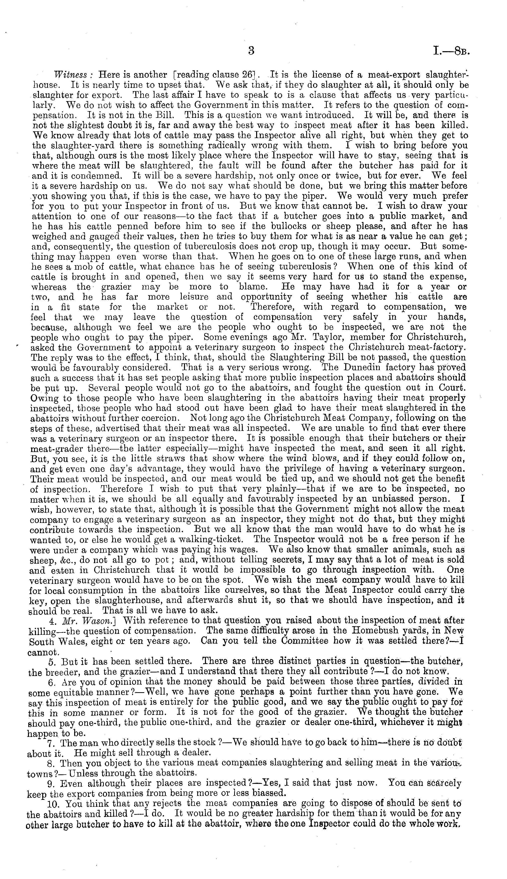 Witness : Here is another [reading clause 26]. It is the license of a meat-export slaughterhouse. It is nearly time to upset that. We ask that, if they do slaughter at all, it should only be slaughter for export. The last affair I have to speak to is a clause that affects us very particularly. We do not wish to affect the Government in this matter. It refers to the question of compensation. It is not in the Bill. This is a question we want introduced. It will be, and there is not the slightest doubt it is, far and away the best way to inspect meat after it has been killed. We know already that lots of cattle may pass the Inspector alive all right, but when they get to the slaughter-yard there is something radically wrong with them. I wish to bring before you that, although ours is the most likely place where the inspector will have to stay, seeing that is where the meat will be slaughtered, the fault will be found after the butcher has paid for it and it is condemned. It will be a severe hardship, not only once or twice, but for ever. We feel it a severe hardship on us. We do not say what should be done, but we bring this matter before you showing you that, if this is the case, we have to pay the piper. We would very much prefer for you to put your Inspector in front of us. But we know that cannot be. I wish to draw your attention to one of our reasons —to the fact that if a butcher goes into a public market, and he has his cattle penned before him to see if the bullocks or sheep please, and after he has weighed and gauged their values, then he tries to buy them for what is as near a value he can get; and, consequently, the question of tuberculosis does not crop up, though it may occur. But something may happen even worse than that. When he goes on to one of these large runs, and when he sees a mob of cattle, what chance has he of seeing tuberculosis ? When one of this kind of cattle is brought in and opened, then we say it seems very hard for us to stand the expense, whereas the grazier may be more to blame. He may have had it for a year or two, and he has far more leisure and opportunity of seeing whether his cattle are in a fit state for the market or not. Therefore, with regard to compensation, we feel that we may leave the question of compensation very safely in your hands, because, although we feel we are the people who ought to be inspected, we are not the people who ought to pay the piper. Some evenings ago Mr. Taylor, member for Christchurch, asked the Government to appoint a veterinary surgeon to inspect the Christchurch meat-factory. The reply was to the effect, I think, that, should the Slaughtering Bill be not passed, the question would be favourably considered. That is a very serious wrong. The Dunedin factory has proved such a success that it has set people asking that more public inspection places and abattoirs should be put up. Several people would not go to the abattoirs, and fought the question out in Court. Owing to those people who have been slaughtering in the abattoirs having their meat properly inspected, those people who had stood out have been glad to have their meat slaughtered in the abattoirs without further coercion. Not long ago the Christchurch Meat Company, following on the steps of these, advertised that their meat was all inspected. We are unable to find that ever there was a veterinary surgeon or an inspector there. It is possible enough that their butchers or their meat-grader there—the latter especially —might have inspected the meat, and seen it all right. But, you see, it is the little straws that show where the wind blows, and if they could follow on, and get even one day's advantage, they would have the privilege of having a veterinary surgeon. Their meat would be inspected, and our meat would be tied up, and we should not get the benefit of inspection. Therefore I wish to put that very plainly—that if we are to be inspected, no matter when it is, we should be all equally and favourably inspected by an unbiassed person. I wish, however, to state that, although it is possible that the Government might not allow the meat company to engage a veterinary surgeon as an inspector, they might not do that, but they might contribute towards the inspection. But we all know that the man would have to do what he is wanted to, or else he would get a walking-ticket. The Inspector would not be a free person if he were under a company which was paying his wages. We also know that smaller animals, such as sheep, &c, do not all go to pot; and, without telling secrets, I may say that a lot of meat is sold and eaten in Christchurch that it would be impossible to go through inspection with. One veterinary surgeon would have to be on the spot. We wish the meat company would have to kill for local consumption in the abattoirs like ourselves, so that the Meat Inspector could carry the key, open the slaughterhouse, and afterwards shut it, so that we should have inspection, and it should be real. That is all we have to ask. 4. Mr. Wason.] With reference to that question you raised about the inspection of meat after killing—the question of compensation. The same difficulty arose in the Homebush yards, in New South Wales, eight or ten years ago. Can you tell the Committee how it was settled there?—l cannot. 5. But it has been settled there. There are three distinct parties in question—the butcher, the breeder, and the grazier—and I understand that there they all contribute ?—I do not know. 6. Are you of opinion that the money should be paid between those three parties, divided in some equitable manner? —Well, we have gone perhaps a point further than you have gone. We say this inspection of meat is entirely for the public good, and we say the public ought to pay for this in some manner or form. It is not for the good of the grazier. We thought the butcher should pay one-third, the public one-third, and the grazier or dealer one-third, whichever it might h