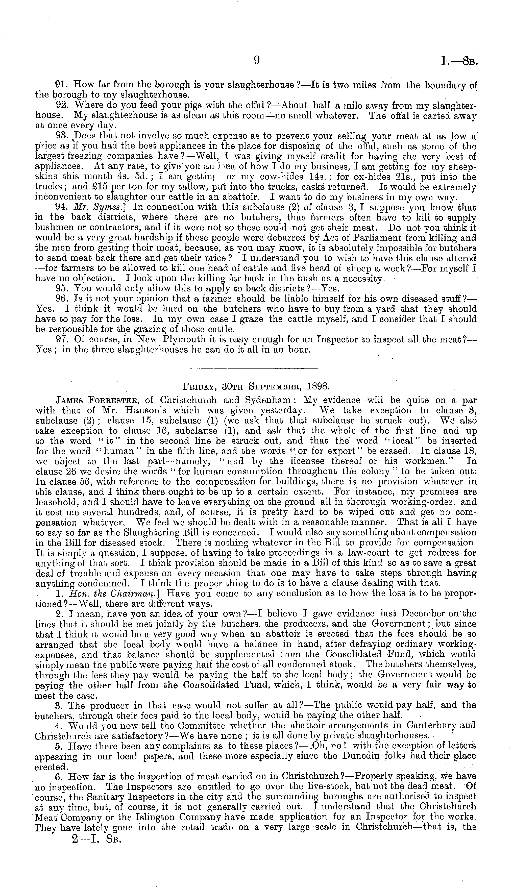 Friday, 30th September, 1898. James Forrester, of Christchurch and Sydenham : My evidence will be quite on a par with that of Mr. Hanson's which was given yesterday. We take exception to clause 3, subclause (2) ; clause 15, subclause (1) (we ask that that subclause be struck out). We also take exception to clause 16, subclause (1), and ask that the whole of the first line and up to the word "it" in the second line be struck out, and that the word "local" be inserted for the word " human " in the fifth line, and the words "or for export" be erased. In clause 18, we object to the last part—namely, "and by the licensee thereof or his workmen." In clause 26 we desire the words " for human consumption throughout the colony "to be taken out. In clause 56, with reference to the compensation for buildings, there is no provision whatever in this clause, and I think there ought to be up to a certain extent. For instance, my premises are leasehold, and I should have to leave everything on the ground all in thorough working-order, and it cost me several hundreds, and, of course, it is pretty hard to be wiped out and get no compensation whatever. We feel we should be dealt with in a reasonable manner. That is all I have to say so far as the Slaughtering Bill is concerned. I would also say something about compensation in the Bill for diseased stock. There is nothing whatever in the Bill to provide for compensation. It is simply a question, I suppose, of having to take proceedings in a law-court to get redress for anything of that sort. I think provision should be made in a Bill of this kind so as to save a great deal of trouble and expense on every occasion that one may have to take steps through having anything condemned. I think the proper thing to do is to have a clause dealing with that. 1. Hon. the Chairman.] Have you come to any conclusion as to how the loss is to be proportioned?— Well, there are different ways. 2. I mean, have you an idea of your own?—l believe I gave evidence last December on the lines that it should be met jointly by the butchers, the producers, and the Government; but since that I think it would be a very good way when an abattoir is erected that the fees should be so arranged that the local body would have a balance in hand, after defraying ordinary workingexpenses, and that balance should be supplemented from the Consolidated Fund, which would simply mean the public were paying half the cost of all condemned stock. The butchers themselves, through the fees they pay would be paying the half to the local body; the Government would be paying the other half from the Consolidated Fund, which, I think, would be a very fair way to meet the case. 3. The producer in that case would not suffer at all ?—The public would pay half, and the butchers, through their fees paid to the local body, would be paying the other half. 4. Would you now tell the Committee whether the abattoir arrangements in Canterbury and Christchurch are satisfactory ? —We have none ; it is all done by private slaughterhouses. 5. Have there been any complaints as to these places?—Oh, no ! with the exception of letters appearing in our local papers, and these more especially since the Dunedin folks had their place erected. . , 6. How far is the inspection of meat carried on in Christchurch ?—Properly speaking, we have no inspection. The Inspectors are entitled to go over the live-stock, but not the dead meat. Of course, the Sanitary Inspectors in the city and the surrounding boroughs are authorised to inspect at any time, but, of course, it is not generally carried out. I understand that the Christchurch Meat Company or the Islington Company have made application for an Inspector for the works. They have lately gone into the retail trade on a very large scale in Christchurch—that is, the 2—l. 88.