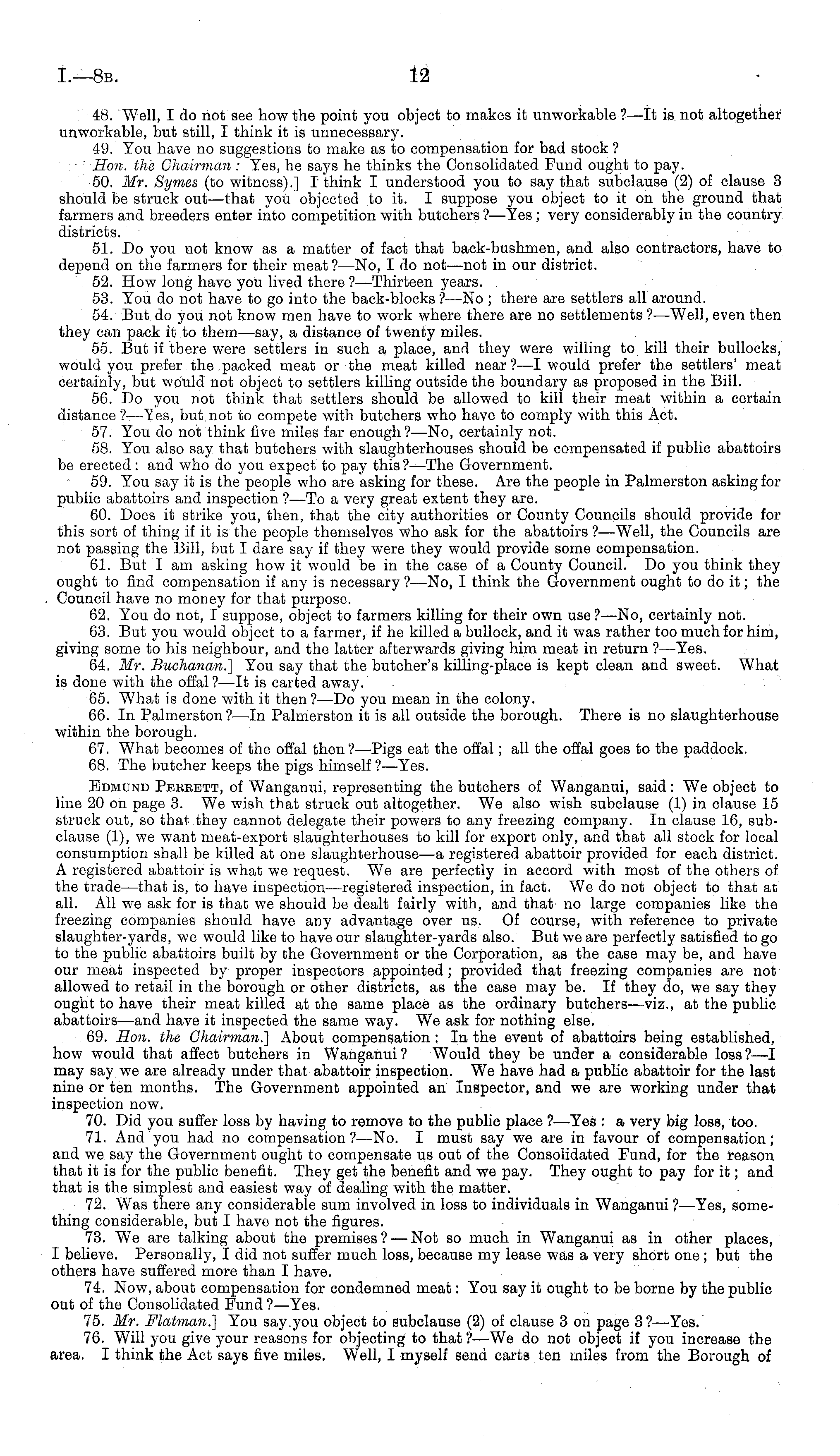 48. Well, I do not see how the point you object to makes it unworkable ? —lt is not altogether unworkable, but still, I think it is unnecessary. 49. You have no suggestions to make as to compensation for bad stock ? ' Hon. the Chairman : Yes, he says he thinks the Consolidated Fund ought to pay. 50. Mr. Symes (to witness).] I think I understood you to say that subclause (2) of clause 3 should be struck out—that you objected to it. I suppose you object to it on the ground that farmers and breeders enter into competition with butchers ?—Yes; very considerably in the country districts. 51. Do you not know as a matter of fact that back-bushmen, and also contractors, have to depend on the farmers for their meat ?—No, I do not—not in our district. 52. How long have you lived there ?—Thirteen years. 53. You do not have to go into the back-blocks ? —No ; there are settlers all around. 54. But do you not know men have to work where there are no settlements ?—Well, even then they can pack it to them—say, a distance of twenty miles. 55. But if there were settlers in such a place, and they were willing to kill their bullocks, would you prefer the packed meat or the meat killed near ?—I would prefer the settlers' meat certainly, but would not object to settlers killing outside the boundary as proposed in the Bill. 56. Do you not think that settlers should be allowed to kill their meat within a certain distance ?—Yes, but not to compete with butchers who have to comply with this Act. 57. You do not think five miles far enough?—No, certainly not. 58. You also say that butchers with slaughterhouses should be compensated if public abattoirs be erected: and who do you expect to pay this?— The Government. 59. You say it is the people who are asking for these. Are the people in Palmerston asking for public abattoirs and inspection ? —To a very great extent they are. 60. Does it strike you, then, that the city authorities or County Councils should provide for this sort of thing if it is the people themselves who ask for the abattoirs ?—Well, the Councils are not passing the Bill, but I dare say if they were they would provide some compensation. 61. But I am asking how it would be in the case of a County Council. Do you think they ought to find compensation if any is necessary ? —No, I think the Government ought to do it; the Council have no money for that purpose. 62. You do not, I suppose, object to farmers killing for their own use? —No, certainly not. 63. But you would object to a farmer, if he killed a bullock, and it was rather too much for him, giving some to his neighbour, and the latter afterwards giving him meat in return ?—Yes. 64. Mr. Buchanan.] You say that the butcher's killing-place is kept clean and sweet. What is done with the offal ? —lt is carted away. 65. What is done with it then ?—Do you mean in the colony. 66. In Palmerston ?—ln Palmerston it is all outside the borough. There is no slaughterhouse within the borough. 67. What becomes of the offal then? —Pigs eat the offal; all the offal goes to the paddock. 68. The butcher keeps the pigs himself ? —Yes. Edmund Perrett, of Wanganui, representing the butchers of Wanganui, said: We object to line 20 on page 3. We wish that struck out altogether. We also wish subclause (1) in clause 15 struck out, so that they cannot delegate their powers to any freezing company. In clause 16, subclause (1), we want meat-export slaughterhouses to kill for export only, and that all stock for local consumption shall be killed at one slaughterhouse —a registered abattoir provided for each district. A registered abattoir is what we request. We are perfectly in accord with most of the others of the trade —that is, to have inspection—registered inspection, in fact. We do not object to that at all. All we ask for is that we should be dealt fairly with, and that no large companies like the freezing companies should have any advantage over us. Of course, with reference to private slaughter-yards, we would like to have our slaughter-yards also. But we are perfectly satisfied to go to the public abattoirs built by the Government or the Corporation, as the case may be, and have our meat inspected by proper inspectors appointed; provided that freezing companies are not allowed to retail in the borough or other districts, as the case may be. If they do, we say they ought to have their meat killed at the same place as the ordinary butchers—viz., at the public abattoirs—and have it inspected the same way. We ask for nothing else. 69. Hon. the Chairman.] About compensation : In the event of abattoirs being established, how would that affect butchers in Wanganui? Would they be under a considerable loss?—I may say we are already under that abattoir inspection. We have had a public abattoir for the last nine or ten months. The Government appointed an Inspector, and we are working under that inspection now. 70. Did you suffer loss by having to remove to the public place ? —Yes : a very big loss, too. 71. And you had no compensation ?—No. I must say we are in favour of compensation; and we say the Government ought to compensate us out of the Consolidated Fund, for the reason that it is for the public benefit. They get the benefit and we pay. They ought to pay for it; and that is the simplest and easiest way of dealing with the matter. 72. Was there any considerable sum involved in loss to individuals in Wanganui ?—Yes, something considerable, but I have not the figures. 73. We are talking about the premises? — Not so much in Wanganui as in other places, I believe. Personally, I did not suffer much loss, because my lease was a very short one; but the others have suffered more than I have. 74. Now, about compensation for condemned meat: You say it ought to be borne by the public out of the Consolidated Fund ? —Yes. 75. Mr. Flatman.] You say.you object to subclause (2) of clause 3on page 3?— Yes. 76. Will you give