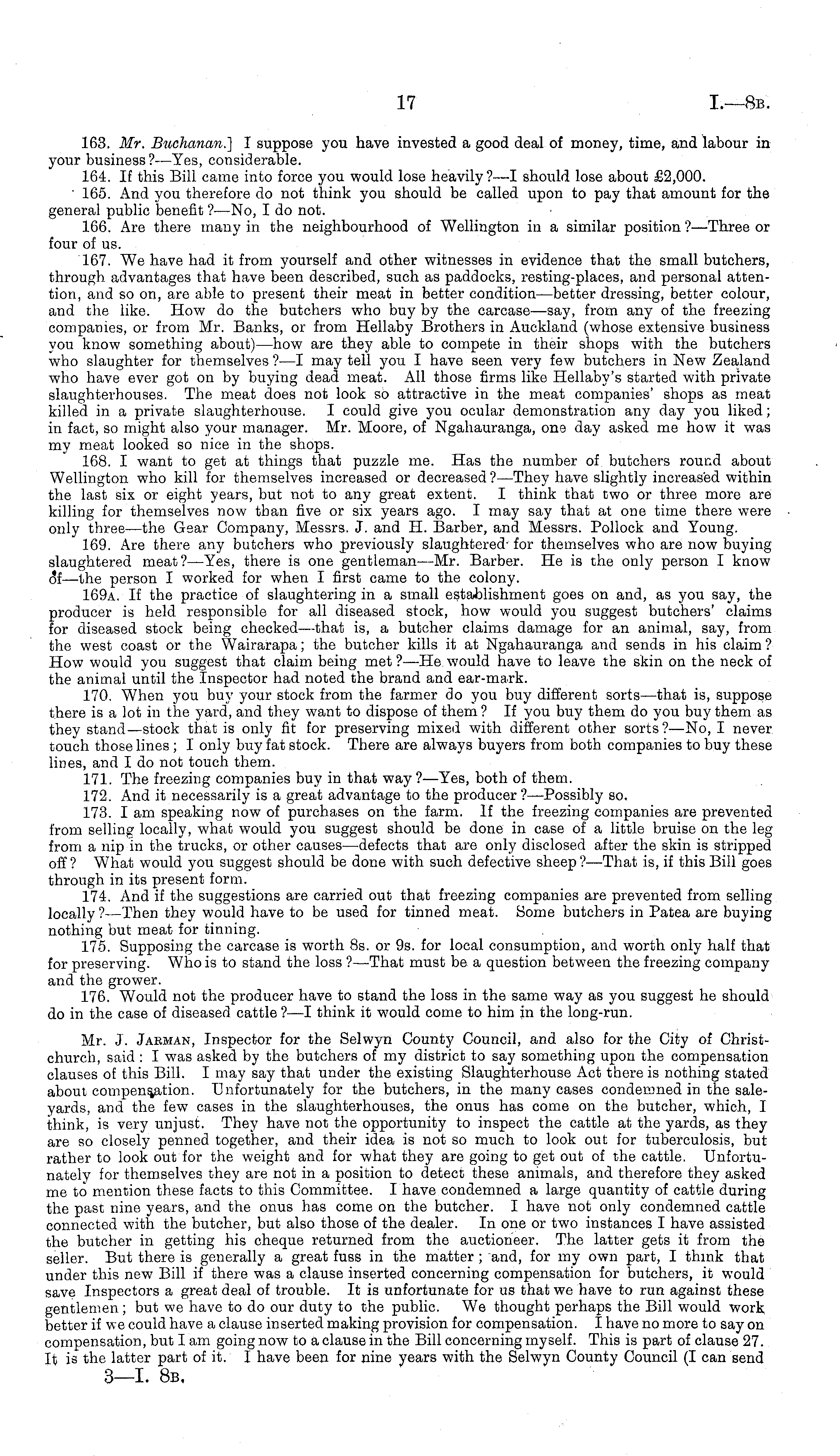 163. Mr. Buchanan.] I suppose you have invested a good deal of money, time, and labour in your business?— Yes, considerable. 164. If this Bill came into force you would lose heavily ?—I should lose about £2,000. ' 165. And you therefore do not think you should be called upon to pay that amount for the general public benefit ?—No, I do not. 166. Are there many in the neighbourhood of Wellington in a similar position ? —Three or four of us. 167. We have had it from yourself and other witnesses in evidence that the small butchers, through advantages that have been described, such as paddocks, resting-places, and personal attention, and so on, are able to present their meat in better condition—better dressing, better colour, and the like. How do the butchers who buy by the carcase—say, from any of the freezing companies, or from Mr. Banks, or from Hellaby Brothers in Auckland (whose extensive business you know something about) —how are they able to compete in their shops with the butchers who slaughter for themselves ? —I may tell you I have seen very few butchers in New Zealand who have ever got on by buying dead meat. All those firms like Hellaby's started with private slaughterhouses. The meat does not look so attractive in the meat companies' shops as meat killed in a private slaughterhouse. I could give you ocular demonstration any day you liked; in fact, so might also your manager. Mr. Moore, of Ngahauranga, one day asked me how it was my meat looked so nice in the shops. 168. I want to get at things that puzzle me. Has the number of butchers round about Wellington who kill for themselves increased or decreased ?—They have slightly increased within the last six or eight years, but not to any great extent. I think that two or three more are killing for themselves now than five or six years ago. I may say that at one time there were only three —the Gear Company, Messrs. J. and H. Barber, and Messrs. Pollock and Young. 169. Are there any butchers who previously slaughtered for themselves who are now buying slaughtered meat? —Yes, there is one gentleman —Mr. Barber. He is the only person I know (3f—the person I worked for when I first came to the colony. 169 a. If the practice of slaughtering in a small establishment goes on and, as you say, the producer is held responsible for all diseased stock, how would you suggest butchers' claims for diseased stock being checked—that is, a butcher claims damage for an animal, say, from the west coast or the Wairarapa; the butcher kills it at Ngahauranga and sends in his claim ? How would you suggest that claim being met?— He.would have to leave the skin on the neck of the animal until the Inspector had noted the brand and ear-mark. 170. When you buy your stock from the farmer do you buy different sorts —that is, suppose there is a lot in the yard, and they want to dispose of them ? If you buy them do you buy them as they stand —stock that is only fit for preserving mixed with different other sorts? —No, I never touch those lines ; I only buy fat stock. There are always buyers from both companies to buy these lines, and I do not touch them. 171. The freezing companies buy in that way? —Yes, both of them. 172. And it necessarily is a great advantage to the producer?— Possibly so. 173. lam speaking now of purchases on the farm. If the freezing companies are prevented from selling locally, what would you suggest should be done in case of a little bruise on the leg from a nip in the trucks, or other causes—defects that are only disclosed after the skin is stripped off? What would you suggest should be done with such defective sheep? —That is, if this Bill goes through in its present form. 174. And if the suggestions are carried out that freezing companies are prevented from selling locally? —Then they would have to be used for tinned meat. Some butchers in Patea are buying nothing but meat for tinning. 175. Supposing the carcase is worth Bs. or 9s. for local consumption, and worth only half that for preserving. Who is to stand the loss ?—That must be a question between the freezing company and the grower. 176. Would not the producer have to stand the loss in the same way as you suggest he should do in the case of diseased cattle ?—I think it would come to him in the long-run. Mr. J. Jarman, Inspector for the Selwyn County Council, and also for the City of Christchurch, said : I was asked by the butchers of my district to say something upon the compensation clauses of this Bill. I may say that under the existing Slaughterhouse Act there is nothing stated about compensation. Unfortunately for the butchers, in the many cases condemned in the saleyards, and the few cases in the slaughterhouses, the onus has come on the butcher, which, I think, is very unjust. They have not the opportunity to inspect the cattle at the yards, as they are so closely penned together, and their idea is not so much to look out for tuberculosis, but rather to look out for the weight and for what they are going to get out of the cattle. Unfortunately for themselves they are not in a position to detect these animals, and therefore they asked me to mention these facts to this Committee. I have condemned a large quantity of cattle during the past nine years, and the onus has come on the butcher. I have not only condemned cattle connected with the butcher, but also those of the dealer. In one or two instances I have assisted the butcher in getting his cheque returned from the auctioneer. The latter gets it from the seller. But there is generally a great fuss in the matter ; and, for my own part, I think that under this new Bill if there was a clause inserted concerning compensation for butchers, it would save Inspectors a great deal of trouble. It is unfortunate for us that we have to run against these gentlemen; but we have to do our duty to the public. We thought perhaps the Bill would work better if we could have a clause inserted mak