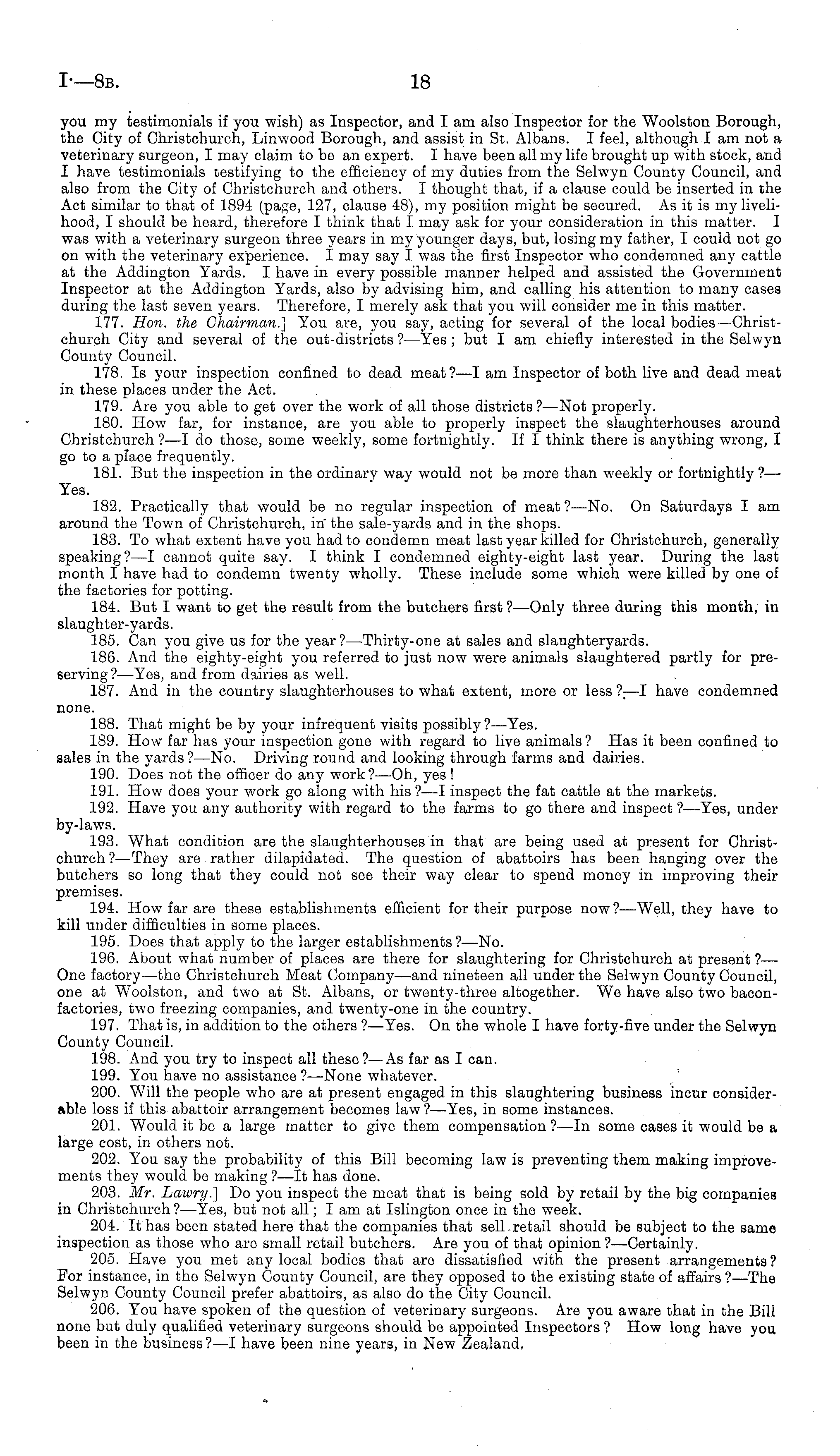 you my testimonials if you wish) as Inspector, and I am also Inspector for the Woolston Borough, the City of Christchurch, Linwood Borough, and assist in St. Albans. I feel, although lam not a veterinary surgeon, I may claim to be an expert. I have been all my life brought up with stock, and I have testimonials testifying to the efficiency of my duties from the Selwyn County Council, and also from the City of Christchurch and others. I thought that, if a clause could be inserted in the Act similar to that of 1894 (page, 127, clause 48), my position might be secured. As it is my livelihood, I should be heard, therefore I think that I may ask for your consideration in this matter. I was with a veterinary surgeon three years in my younger days, but, losing my father, I could not go on with the veterinary experience. I may say I was the first Inspector who condemned any cattle at the Addington Yards. I have in every possible manner helped and assisted the Government Inspector at the Addington Yards, also by advising him, and calling his attention to many cases during the last seven years. Therefore, I merely ask that you will consider me in this matter. 177. Hon. the Chairman.] You are, you say, acting for several of the local bodies—Christchurch City and several of the out-districts ? —Yes; but I am chiefly interested in the Selwyn County Council. 178. Is your inspection confined to dead meat ? —I am Inspector of both live and dead meat in these places under the Act. 179. Are you able to get over the work of all those districts ? —Not properly. 180. How far, for instance, are you able to properly inspect the slaughterhouses around Christchurch ?—I do those, some weekly, some fortnightly. If I think there is anything wrong, I go to a place frequently. 181. But the inspection in the ordinary way would not be more than weekly or fortnightly ?— Yes. 182. Practically that would be no regular inspection of meat?-—No. On Saturdays I am around the Town of Christchurch, in the sale-yards and in the shops. 183. To what extent have you had to condemn meat last year killed for Christchurch, generally speaking?—l cannot quite say. I think I condemned eighty-eight last year. During the last month I have had to condemn twenty wholly. These include some which were killed by one of the factories for potting. 184. But I want to get the result from the butchers first ?—Only three during this month, in slaughter-yards. 185. Can you give us for the year?— Thirty-one at sales and slaughteryards. 186. And the eighty-eight you referred to just now were animals slaughtered partly for preserving?— Yes, and from dairies as well. 187. And in the country slaughterhouses to what extent, more or less ? ; —I have condemned none. 188. That might be by your infrequent visits possibly ?—Yes. 189. How far has your inspection gone with regard to live animals ? Has it been confined to sales in the yards?— No. Driving round and looking through farms and dairies. 190. Does not the officer do any work ? —Oh, yes ! 191. How does your work go along with his ?—I inspect the fat cattle at the markets. 192. Have you any authority with regard to the farms to go there and inspect ?—Yes, under by-laws. 193. What condition are the slaughterhouses in that are being used at present for Christchurch ? —They are rather dilapidated. The question of abattoirs has been hanging over the butchers so long that they could not see their way clear to spend money in improving their premises. 194. How far are these establishments efficient for their purpose now? —Well, they have to kill under difficulties in some places. 195. Does that apply to the larger establishments?— No. 196. About what number of places are there for slaughtering for Christchurch at present ?— One factory—the Christchurch Meat Company—and nineteen all under the Selwyn County Council, one at Woolston, and two at St. Albans, or twenty-three altogether. We have also two baconfactories, two freezing companies, and twenty-one in the country. 197. That is, in addition to the others ? —Yes. On the whole I have forty-five under the Selwyn County Council. 198. And you try to inspect all these? —As far as I can. 199. You have no assistance ?—None whatever. 200. Will the people who are at present engaged in this slaughtering business incur considerable loss if this abattoir arrangement becomes law ?—Yes, in some instances. 201. Would it be a large matter to give them compensation?—ln some cases it would be a large cost, in others not. 202. You say the probability of this Bill becoming law is preventing them making improvements they would be making ? —lt has done. 203. Mr. Lawry.] Do you inspect the meat that is being sold by retail by the big companies in Christchurch ?—Yes, but not all; lam at Islington once in the week. 204. It has been stated here that the companies that sell.retail should be subject to the same inspection as those who are small retail butchers. Are you of that opinion ?—Certainly. 205. Have you met any local bodies that are dissatisfied with the present arrangements ? For instance, in the Selwyn County Council, are they opposed to the existing state of affairs ?—The Selwyn County Council prefer abattoirs, as also do the City Council. 206. You have spoken of the question of veterinary surgeons. Are you aware that in the Bill none but duly qualified veterinary surgeons should be appointed Inspectors ? How long have you been in the business? —I have been nine years, in New Zealand,