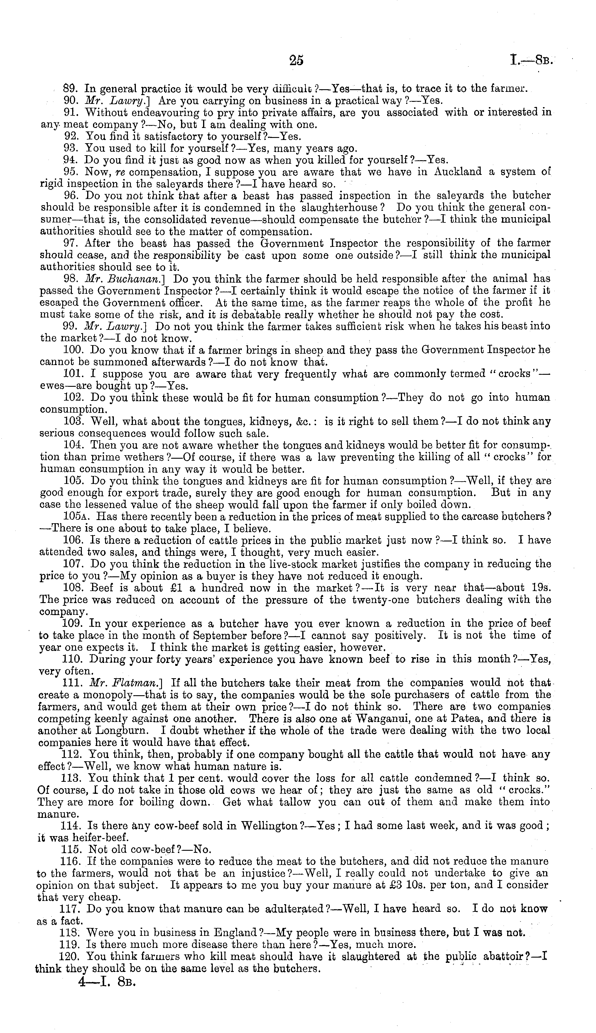 89. In general practice it would be very difficult ? —Yes—that is, to trace it to the farmer. 90. Mr. Lawry.] Are you carrying on business in a practical way ?—Yes. 91. Without endeavouring to pry into private affairs, are you associated with or interested in any meat company ?—No, but I am dealing with one. 92. You find it satisfactory to yourself ?—Yes. 93. You used to kill for yourself ?—Yes, many years ago. 94. Do you find it just as good now as when you killed for yourself ? —Yes. 95. Now, re compensation, I suppose you are aware that we have in Auckland a system of rigid inspection in the saleyards there ?—I have heard so. 96. Do you not think that after a beast has passed inspection in the saleyards the butcher should be responsible after it is condemned in the slaughterhouse ? Do you think the general consumer—that is, the consolidated revenue—should compensate the butcher ?—I think the municipal authorities should see to the matter of compensation. 97. After the beast has passed the Government Inspector the responsibility of the farmer should cease, and the responsibility be cast upon some one outside ? —I still think the municipal authorities should see to it. 98. Mr. Buchanan.] Do you think the farmer should be held responsible after the animal has passed the Government Inspector ? —I certainly think it would escape the notice of the farmer if it escaped the Government officer. At the same time, as the farmer reaps the whole of the profit he must take some of the risk, and it is debatable really whether he should not pay the cost. 99. Mr. Lawry.] Do not you think the farmer takes sufficient risk when he takes his beast into the market ?—I do not know. 100. Do you know that if a farmer brings in sheep and they pass the Government Inspector he cannot be summoned afterwards ?—I do not know that. 101. I suppose you are aware that very frequently what are commonly termed "crocks" — ewes—are bought up ?—Yes. 102. Do you think these would be fit for human consumption ?—They do not go into human consumption. 103. Well, what about the tongues, kidneys, &c.: is it right to sell them?—l do not think any serious consequences would follow such sale. 104. Then you are not aware whether the tongues and kidneys would be better fit for consump-. tion than prime wethers ?—Of course, if there was a law preventing the killing of all " crocks" for human consumption in any way it would be better. 105. Do you think the tongues and kidneys are fit for human consumption ? —Well, if they are good enough for export trade, surely they are good enough for human consumption. But in any case the lessened value of the sheep would fall upon the farmer if only boiled down. 105 a. Has there recently been a reduction in the prices of meat supplied to the carcase butchers ? —There is one about to take place, I believe. 106. Is there a reduction of cattle prices in the public market just now ? —I think so. I have attended two sales, and things were, I thought, very much easier. 107. Do you think the reduction in the live-stock market justifies the company in reducing the price to you ?—My opinion as a buyer is they have not reduced it enough. 108. Beef is about £1 a hundred now in the market? —It is very near that—about 19s. The price was reduced on account of the pressure of the twenty-one butchers dealing with the company. 109. In your experience as a butcher have you ever known a reduction in the price of beef to take place in the month of September before ? —I cannot say positively. It is not the time of year one expects it. I think the market is getting easier, however. 110. During your forty years' experience you have known beef to rise in this month?— Yes, very often. 111. Mr. Flatman.] If all the butchers take their meat from the companies would not that create a monopoly —that is to say, the companies would be the sole purchasers of cattle from the farmers, and would get them at their own price ?—I do not think so. There are two companies competing keenly against one another. There is also one at Wanganui, one at Patea, and there is another at Longburn. I doubt whether if the whole of the trade were dealing with the two local companies here it would have that effect. 112. You think, then, probably if one company bought all the cattle that would not have any effect ?—Well, we know what human nature is. 113. You think that 1 per cent, would cover the loss for all cattle condemned?—l think so. Of course, I do not take in those old cows we hear of; they are just the same as old " crocks." They are more for boiling down. Get what tallow you can out of them and make them into manure. 114. Is there any cow-beef sold in Wellington ?—Yes ; I had some last week, and it was good ; it was heifer-beef. 115. Not old cow-beef ?—No. 116. If the companies were to reduce the meat to the butchers, and did not reduce the manure to the farmers, would not that be an injustice ?—Well, I really could not undertake to give an opinion on that subject. It appears to me you buy your manure at £3 10s. per ton, and I consider that very cheap. 117. Do you know that manure can be adulterated ?—Well, I have heard so. Ido not know as a fact. 118. Were you in business in England?—My people were in business there, but I was not. 119. Is there much more disease there than here?— Yes, much more. 120. You think farmers who kill meat should have it slaughtered at the public abattoir?—_ think they should be on the same level as the butchers. 4—l. Bb.