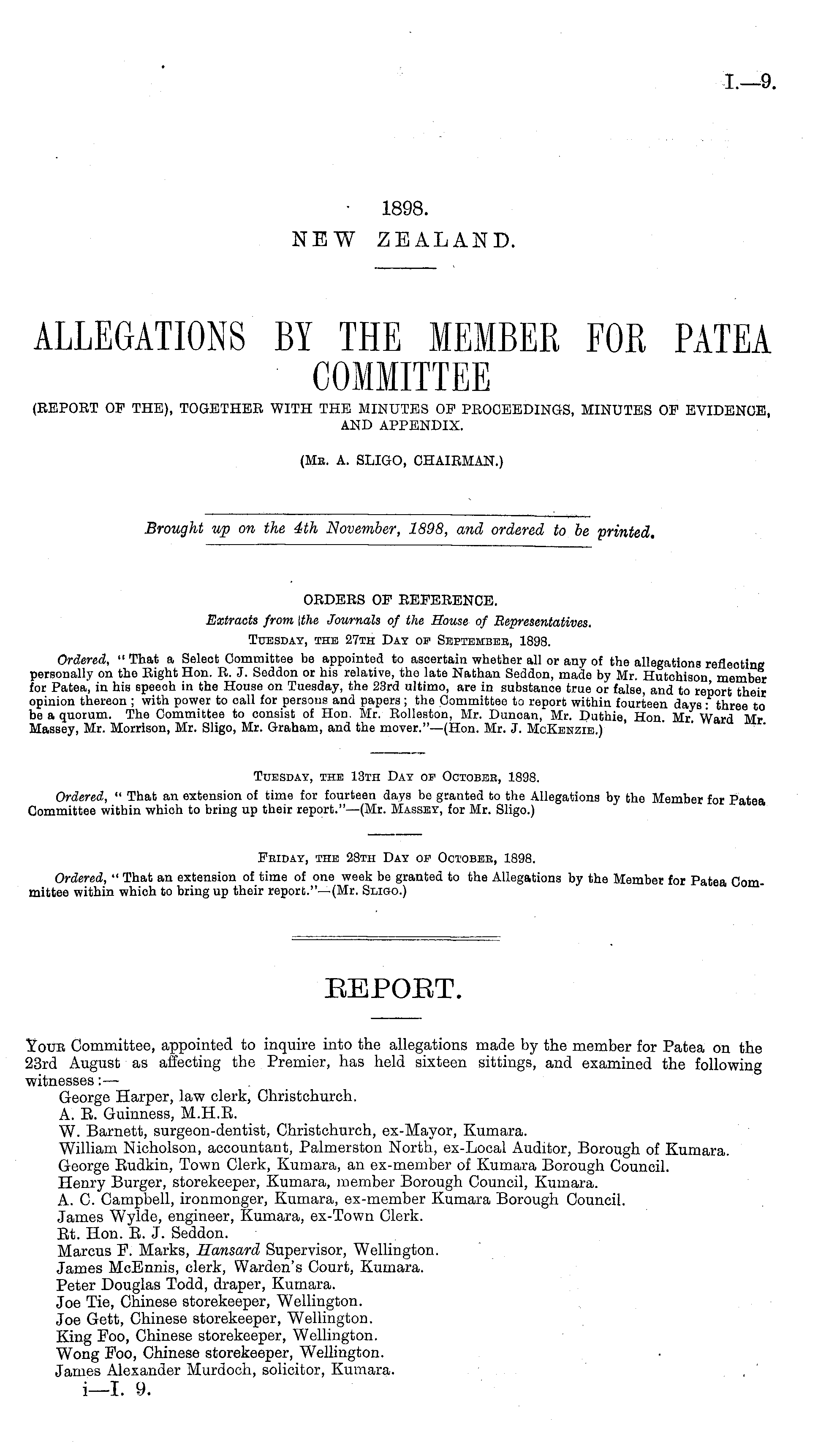 ALLEGATIONS BY THE MEMBER FOR PATEA COMMITTEE (REPORT OF THE), TOGETHER WITH THE MINUTES OF PROCEEDINGS, MINUTES OF EVIDENCE, AND APPENDIX. (Mr. A. SLIGO, CHAIRMAN.)