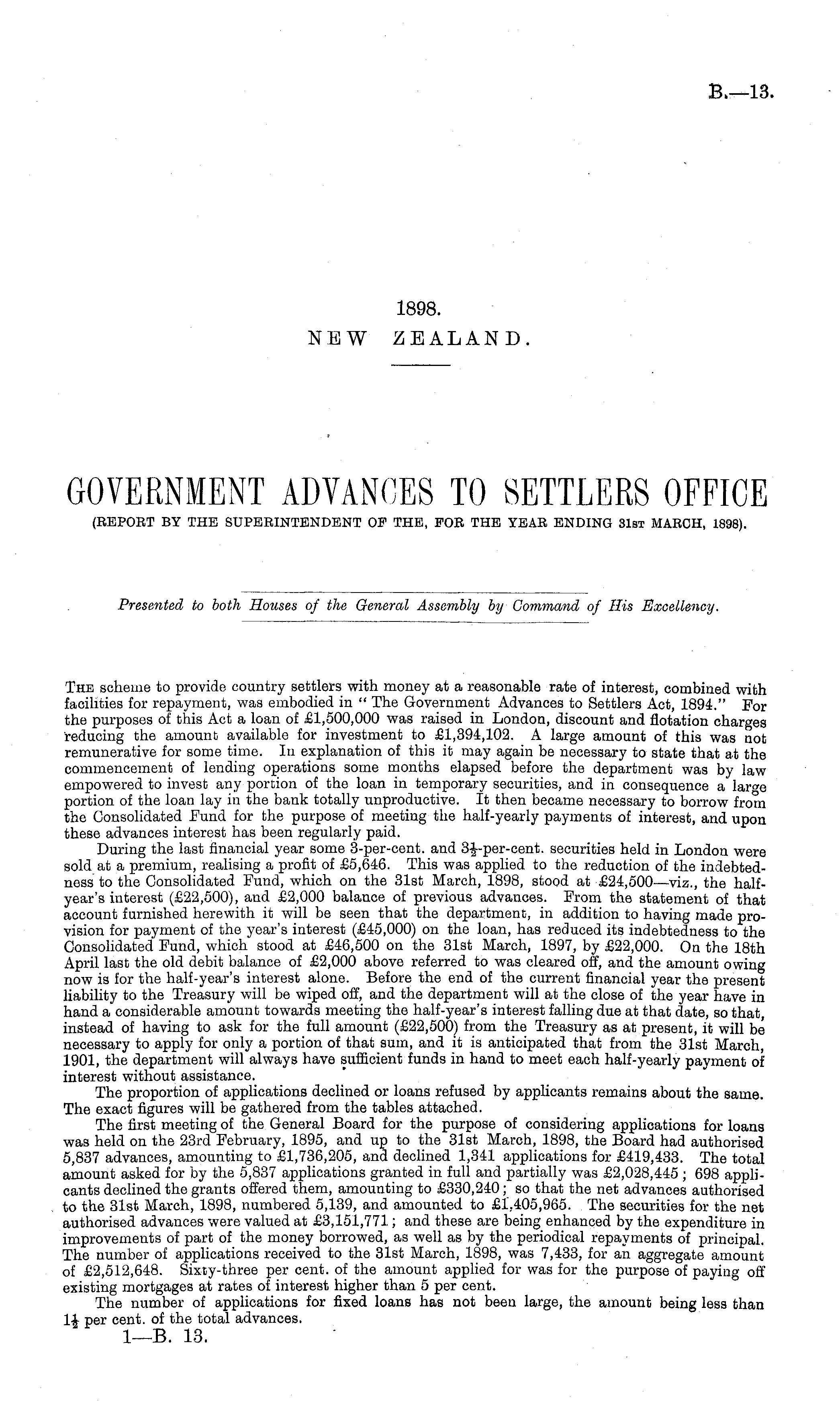 GOVERNMENT ADVANCES TO SETTLERS OFFICE (REPORT BY THE SUPERINTENDENT OF THE, FOR THE YEAR ENDING 31st MARCH, 1898).