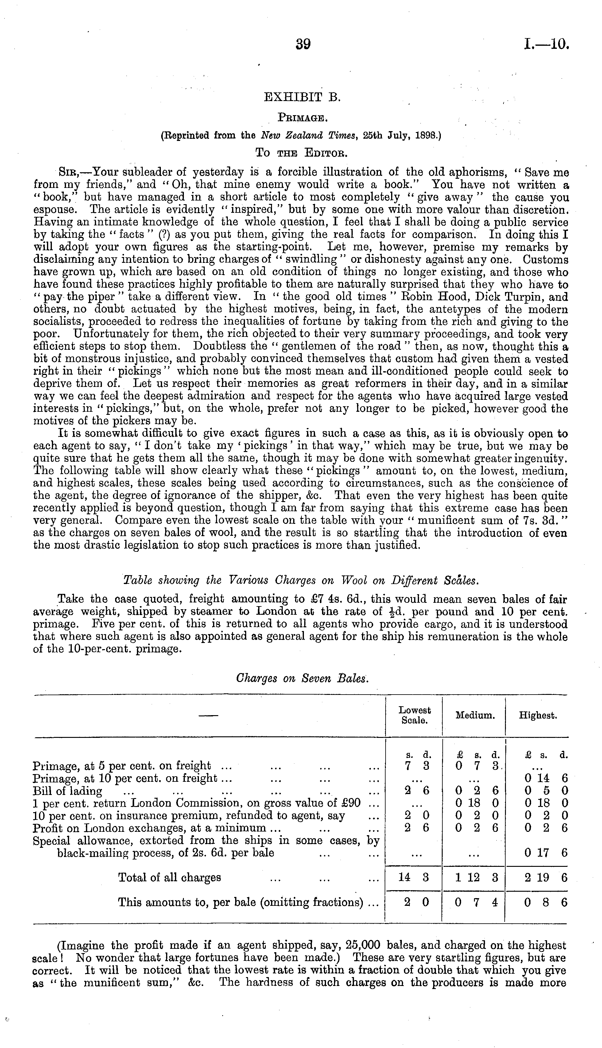 EXHIBIT B. Primage. (Reprinted from the New Zealand Times, 25th July, 1898.) To THE EdITOB. Sib,—Your subleader of yesterday is a forcible illustration of the old aphorisms, " Save me from my friends," and " Oh, that mine enemy would write a book." You have not written a "book," but have managed in a short article to most completely "give away" the cause you espouse. The article is evidently " inspired," but by some one with more valour than discretion. Having an intimate knowledge of the whole question, I feel that I shall be doing a public service by taking the " facts " (?) as you put them, giving the real facts for comparison. In doing this I will adopt your own figures as the starting-point. Let me, however, premise my remarks by disclaiming any intention to bring charges of " swindling "or dishonesty against any one. Customs have grown up, which are based on an old condition of things no longer existing, and those who have found these practices highly profitable to them are naturally surprised that they who have to " pay the piper " take a different view. In " the good old times " Eobin Hood, Dick Turpin, and others, no doubt actuated by the highest motives, being, in fact, the antetypes of the modern socialists, proceeded to redress the inequalities of fortune by taking from the rich and giving to the poor. Unfortunately for them, the rich objected to their very summary proceedings, and took very efficient steps to stop them. Doubtless the " gentlemen of the road " then, as now, thought this a bit of monstrous injustice, and probably convinced themselves that custom had given them a vested right in their "pickings" which none but the most mean and ill-conditioned people could seek to deprive them of. Let us respect their memories as great reformers in their day, and in a similar way we can feel the deepest admiration and respect for the agents who have acquired large vested interests in " pickings," but, on the whole, prefer not any longer to be picked, however good the motives of the pickers may be. It is somewhat difficult to give exact figures in such a case as this, as it is obviously open to each agent to say, " I don't take my ' pickings' in that way," which may be true, but we may be quite sure that he gets them all the same, though it may be done with somewhat greater ingenuity. The following table will show clearly what these "pickings " amount to, on the lowest, medium, and highest scales, these scales being used according to circumstances, such as the conscience of the agent, the degree of ignorance of the shipper, &c. That even the very highest has been quite recently applied is beyond question, though I am far from saying that this extreme case has been very general. Compare even the lowest scale on the table with your " munificent sum of 7s. 3d. " as the charges on seven bales of wool, and the result is so startling that the introduction of even the most drastic legislation to stop such practices is more than justified. Table showing the Various Charges on Wool on Different Scales. Take the case quoted, freight amounting to £7 4s. 6d., this would mean seven bales of fair average weight, shipped by steamer to London at the rate of i&. per pound and 10 per cent, primage. Five per cent, of this is returned to all agents who provide cargo, and it is understood that where such agent is also appointed as general agent for the ship his remuneration is the whole of the 10-per-cent. primage.