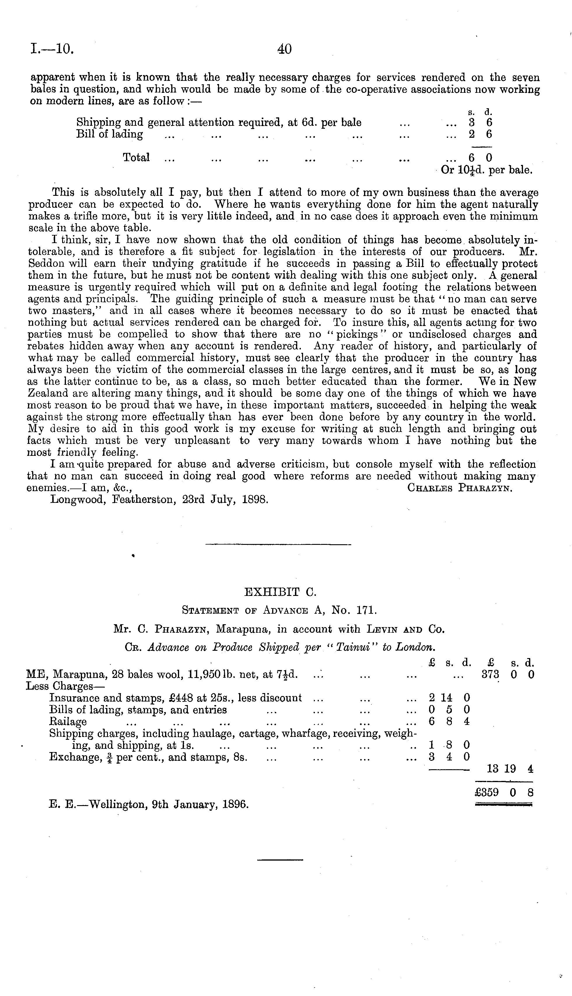 EXHIBIT C. Statement of Advance A, No. 171. Mr. C. Phaeazyn, Marapuna, in account with Levin and Co. Ce. Advance on Produce Shipped per "Tainui" to London. £ s. d. £ s. d. ME, Marapuna, 28 bales wool, 11,950 lb. net, at 7£d. ..'. ... ... ... 373 0 0 Less Charges — Insurance and stamps, £448 at 255., less discount ... ... ... 2 14 0 Bills of lading, stamps, and entries ... ... ... ...050 Bailage ... ... ... ... ... ... ...684 Shipping charges, including haulage, cartage, wharfage, receiving, weighing, and shipping, at Is. ... ... ... ... ..180 Exchange, f per cent., and stamps, Bs. ... ... ... ... 3 4 0 13 19 4 £359 0 8 E. E.—Wellington, 9th January, 1896. ■■