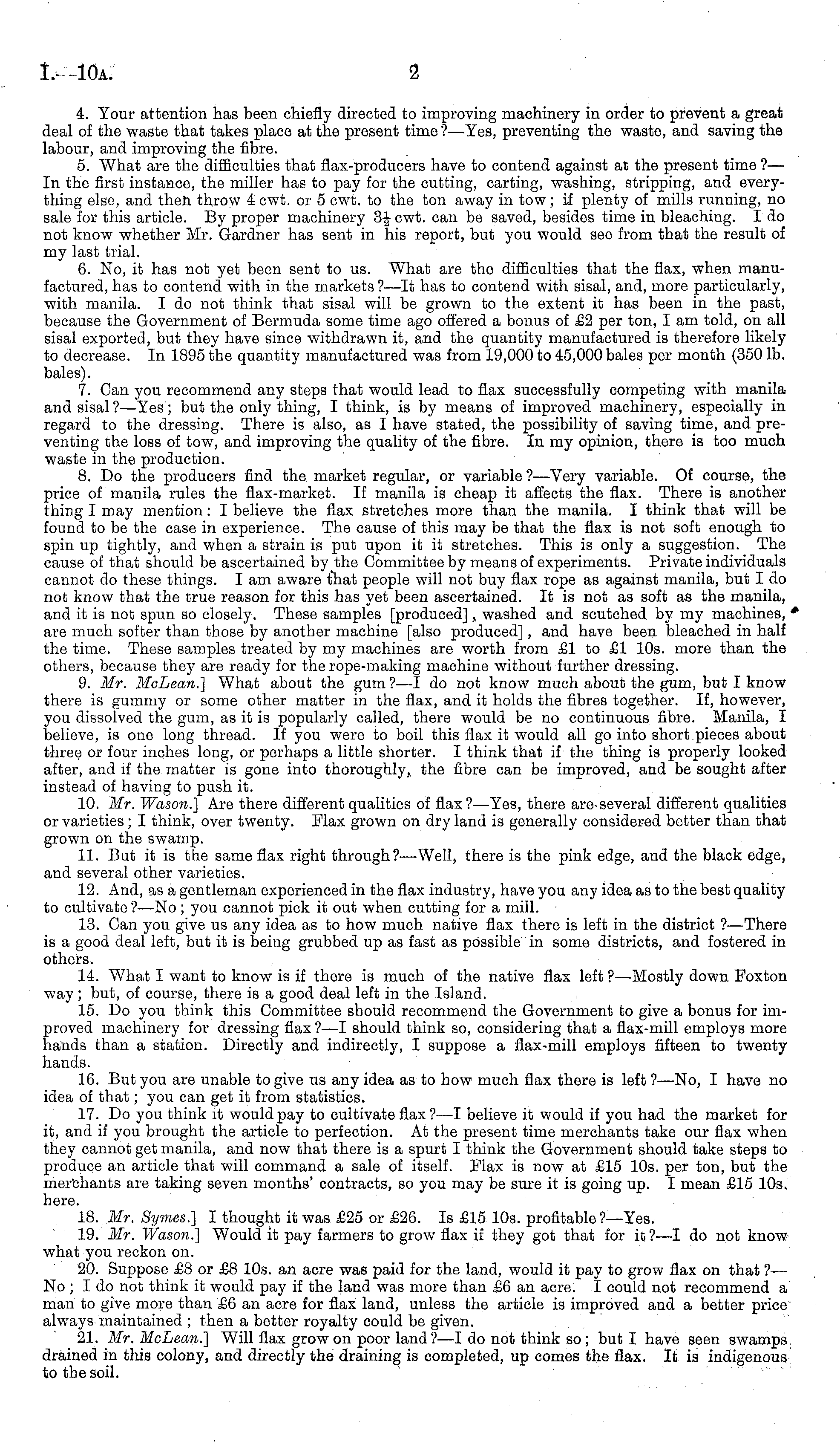 4. Your attention has been chiefly directed to improving machinery in order to prevent a great deal of the waste that takes place at the present time ?—Yes, preventing the waste, and saving the labour, and improving the fibre. 5. What are the difficulties that flax-producers have to contend against at the present time ?— In the first instance, the miller has to pay for the cutting, carting, washing, stripping, and everything else, and then throw 4 cwt. or 5 cwt. to the ton away in tow; if plenty of mills running, no sale for this article. By proper machinery 3-| cwt. can be saved, besides time in bleaching. Ido not know whether Mr. Gardner has sent in his report, but you would see from that the result of my last trial. 6. No, it has not yet been sent to us. What are the difficulties that the flax, when manufactured, has to contend with in the markets?—lt has to contend with sisal, and, more particularly, with manila. I do not think that sisal will be grown to the extent it has been in the past, because the Government of Bermuda some time ago offered a bonus of £2 per ton, I am told, on all sisal exported, but they have since withdrawn it, and the quantity manufactured is therefore likely to decrease. In 1895 the quantity manufactured was from 19,000 to 45,000 bales per month (350 lb. bales). 7. Can you recommend any steps that would lead to flax successfully competing with manila and sisal ?—Yes; but the only thing, I think, is by means of improved machinery, especially in regard to the dressing. There is also, as I have stated, the possibility of saving time, and preventing the loss of tow, and improving the quality of the fibre. In my opinion, there is too much waste in the production. 8. Do the producers find the market regular, or variable ?—Very variable. Of course, the price of manila rules the flax-market. If manila is cheap it affects the flax. There is another thing I may mention: I believe the flax stretches more than the manila. I think that will be found to be the case in experience. The cause of this may be that the flax is not soft enough to spin up tightly, and when a strain is put upon it it stretches. This is only a suggestion. The cause of that should be ascertained bythe Committee by means of experiments. Private individuals cannot do these things. lam aware that people will not buy flax rope as against manila, but Ido not know that the true reason for this has yet been ascertained. It is not as soft as the manila, and it is not spun so closely. These samples [produced],, washed and scutched by my machines, * are much softer than those by another machine [also produced] , and have been bleached in half the time. These samples treated by my machines are worth from £1 to £1 10s. more than the others, because they are ready for the rope-making machine without further dressing. 9. Mr. McLean.] What about the gum ?—I do not know much about the gum, but I know there is gummy or some other matter in the flax, and it holds the fibres together. If, however, you dissolved the gum, as it is popularly called, there would be no continuous fibre. Manila, I believe, is one long thread. If you were to boil this flax it would all go into short pieces about three or four inches long, or perhaps a little shorter. I think that if the thing is properly looked after, and if the matter is gone into thoroughly, the fibre can be improved, and be sought after instead of having to push it. 10. Mr. Wason.] Are there different qualities of flax?— Yes, there are-several different qualities or varieties; I think, over twenty. Flax grown on dryland is generally considered better than that grown on the swamp. 11. But it is the same flax right through?— Well, there is the pink edge, and the black edge, and several other varieties. 12. And, as a gentleman experienced in the flax industry, have you any idea as to the best quality to cultivate ? —No ; you cannot pick it out when cutting for a mill. 13. Can you give us any idea as to how much native flax there is left in the district ?—There is a good deal left, but it is being grubbed up as fast as possible in some districts, and fostered in others. 14. What I want to know is if there is much of the native flax left ?—Mostly down Foxton way; but, of course, there is a good deal left in the Island. 15. Do you think this Committee should recommend the Government to give a bonus for improved machinery for dressing flax ?—I should think so, considering that a flax-mill employs more hands than a station. Directly and indirectly, I suppose a flax-mill employs fifteen to twenty hands. 16. But you are unable to give us any idea as to how much flax there is left ?—No, I have no idea of that; you can get it from statistics. 17. Do you think it would pay to cultivate flax ? —I believe it would if you had the market for it, and if you brought the article to perfection. At the present time merchants take our flax when they cannot get manila, and now that there is a spurt I think the Government should take steps to produce an article that will command a sale of itself. Flax is now at £15 10s. per ton, but the merchants are taking seven months' contracts, so you may be sure it is going up. I mean £15 10s. here. 18. Mr. Symes.] I thought it was £25 or £26. Is £15 10s. profitable?— Yes. 19. Mr. Wason.] Would it pay farmers to grow flax if they got that for it ?—I do not know what you reckon on. 20. Suppose £8 or £8 10s. an acre was paid for the land, would it pay to grow flax on that ? — No ; Ido not think it would pay if the land was more than £6 an acre. I could not recommend a man to give more than £6 an acre for flax land, unless the article is improved and a better price always maintained ; then a better royalty could be given. 21. Mr. McLean.] Will flax grow on poor land?—l do not think so; but I have seen swamps drained in this colony, and directly the draining is completed, up comes the flax. It is indigenous to the 