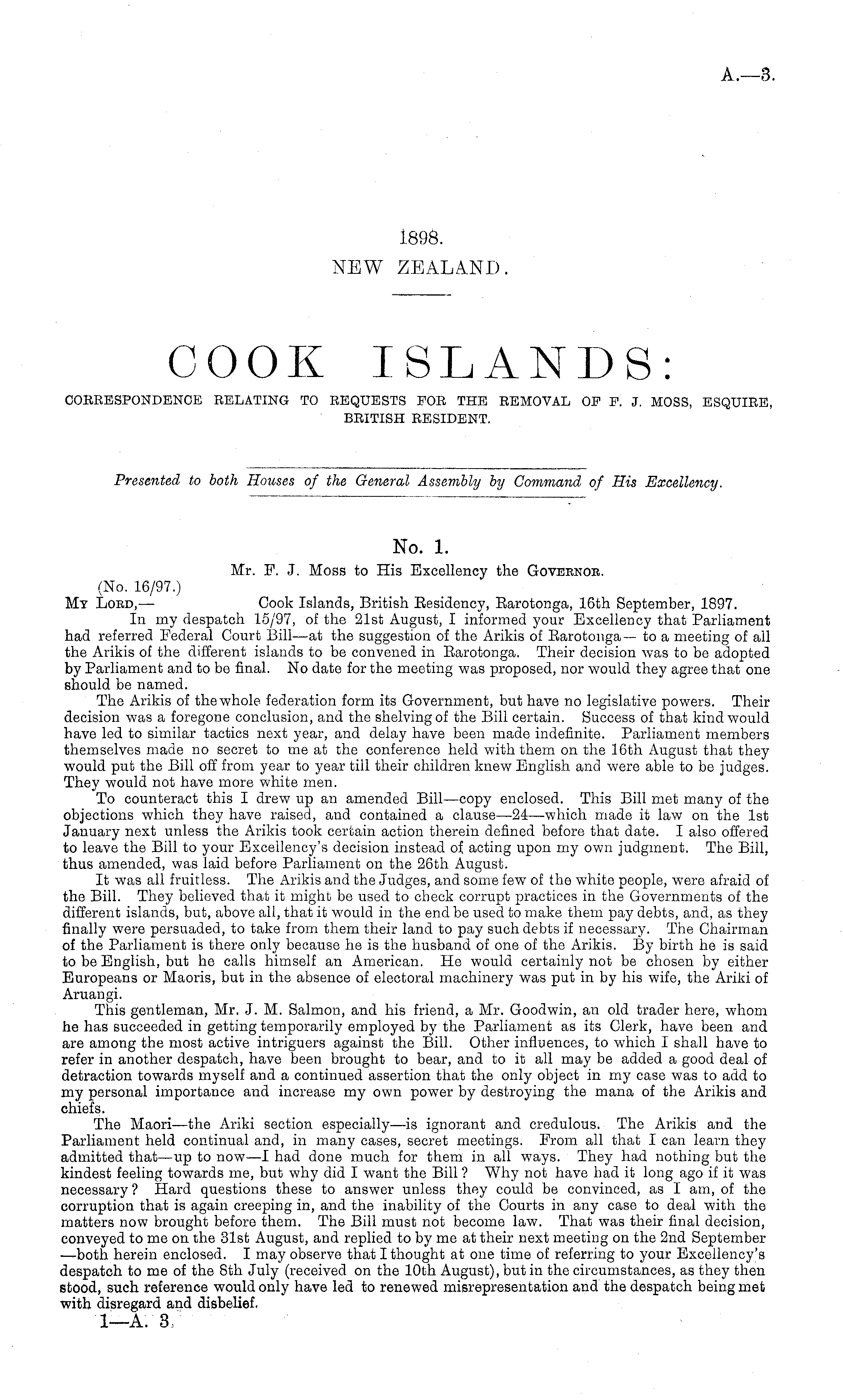 No. 1. Mr. F. J. Moss to His Excellency the Goveenoe. (No. 16/97.) My Lord, — Cook Islands, British Eesidency, Earotonga, 16th September, 1897. In my despatch 15/97, of the 21st August, I informed your Excellency that Parliament had referred Federal Court 13111—at the suggestion of the Arikis of Earotonga— to a meeting of all the Arikis of the different islands to be convened in Earotonga. Their decision was to be adopted by Parliament and to be final. No date for the meeting was proposed, nor would they agree that one should be named. The Arikis of the whole federation form its Government, but have no legislative powers. Their decision was a foregone conclusion, and the shelving of the Bill certain. Success of that kind would have led to similar tactics next year, and delay have been made indefinite. Parliament members themselves made no secret to me at the conference held with them on the 16th August that they would put the Bill off from year to year till their children knew English and were able to be judges. They would not have more white men. To counteract this I drew up an amended Bill—copy enclosed. This Bill met many of the objections which they have raised, and contained a clause—24—which made it law on the Ist January next unless the Arikis took certain action therein denned before that date. I also offered to leave the Bill to your Excellency's decision instead of. acting upon my own judgment. The Bill, thus amended, was laid before Parliament on the 26th August. It was all fruitless. The Arikis and the Judges, and some few of the white people, were afraid of the Bill. They believed that it might be used to check corrupt practices in the Governments of the different islands, but, above all, that it would in the end be used to make them pay debts, and, as they finally were persuaded, to take from them their land to pay such debts if necessary. The Chairman of the Parliament is there only because he is the husband of one of the Arikis. By birth he is said to be English, but he calls himself an American. He would certainly not be chosen by either Europeans or Maoris, but in the absence of electoral machinery was put in by his wife, the Ariki of Aruangi. This gentleman, Mr. J. M. Salmon, and his friend, a Mr. Goodwin, an old trader here, whom he has succeeded in getting temporarily employed by the Parliament as its Clerk, have been and are among the most active intriguers against the Bill. Other influences, to which I shall have to refer in another despatch, have been brought to bear, and to it all may be added a good deal of detraction towards myself and a continued assertion that the only object in my case was to add to my personal importance and increase my own power by destroying the mana of the Arikis and chiefs. The Maori—the Ariki section especially—is ignorant and credulous. The Arikis and the Parliament held continual and, in many cases, secret meetings. From all that I can learn they admitted that —up to now —I had done much for them in all ways. They had nothing but the kindest feeling towards me, but why did I want the Bill ? Why not have had it long ago if it was necessary ? Hard questions these to answer unless they could be convinced, as I am, of the corruption that is again creeping in, and the inability of the Courts in any case to deal with the matters now brought before them. The Bill must not become law. That was their final decision, conveyed to me on the 31st August, and replied to by me at their next meeting on the 2nd September —both herein enclosed. I may observe that I thought at one time of referring to your Excellency's despatch to me of the Bth July (received on the 10th August), but in the circumstances, as they then stood, such reference would only have led to renewed misrepresentation and the despatch being met with disregard and disbelief.