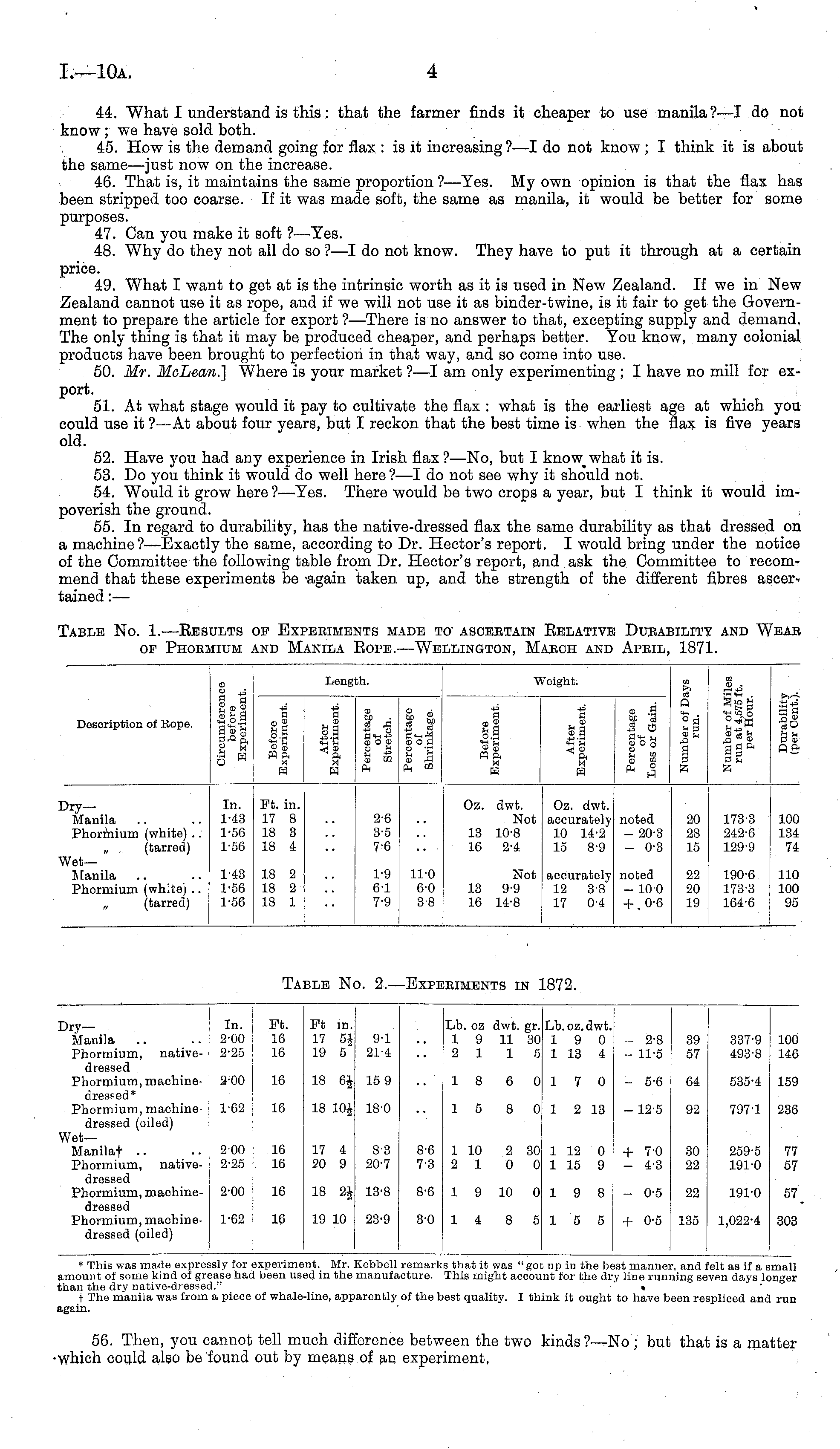 44. What I understand is this: that the farmer finds it cheaper to use manila?—l do not know ; we have sold both. 45. How is the demand going for flax :is it increasing ?-—I do not know; I think it is about the same —just now on the increase. 46. That is, it maintains the same proportion ? —Yes. My own opinion is that the flax has been stripped too coarse. If it was made soft, the same as manila, it would be better for some purposes. 47. Can you make it soft ?—Yes. 48. Why do they not all do so ?—I do not know. They have to put it through at a certain price. 49. What I want to get at is the intrinsic worth as it is used in New Zealand. If we in New Zealand cannot use it as rope, and if we will not use it as binder-twine, is it fair to get the Government to prepare the article for export ?—There is no answer to that, excepting supply and demand. The only thing is that it may be produced cheaper, and perhaps better. You know, many colonial products have been brought to perfection in that way, and so come into use. 50. Mr. McLean.] Where is your market ?—I am only experimenting ; I have no mill for export. 51. At what stage would it pay to cultivate the flax : what is the earliest age at which you could use it ? —At about four years, but I reckon that the best time is when the flax is five years old. 52. Have you had any experience in Irish flax ? —No, but I what it is. 53. Do you think it would do well here ? —I do not see why it should not. 54. Would it grow here ?—Yes. There would be two crops a year, but I think it would impoverish the ground. 55. In regard to durability, has the native-dressed flax the same durability as that dressed on a machine?— Exactly the same, according to Dr. Hector's report. I would bring under the notice of the Committee the following table from Dr. Hector's report, and ask the Committee to recommend that these experiments be -again taken up, and the strength of the different fibres ascertained :—