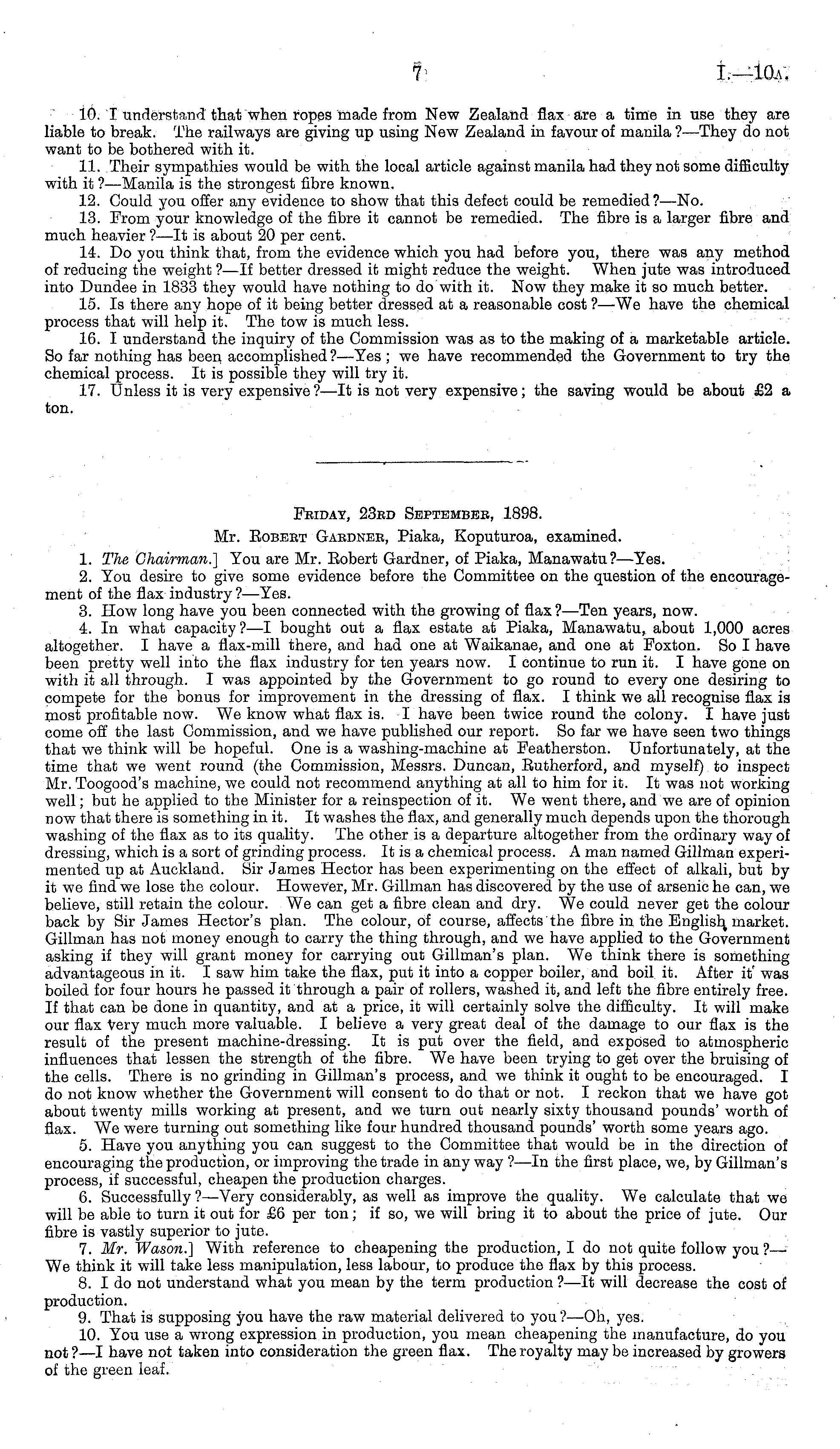 10. I understand that when ropes made from New Zealand flax are a time in use they are liable to break. The railways are giving up using New Zealand in favour of manila ? —They do not want to be bothered with it. 11. Their sympathies would be with the local article against manila had they not some difficulty with it ?—Manila is the strongest fibre known. 12. Could you offer any evidence to show that this defect could be remedied?— No. 13. From your knowledge of the fibre it cannot be remedied. The fibre is a larger fibre and much heavier ?—lt is about 20 per cent. 14. Do you think that, from the evidence which you had before you, there was any method of reducing the weight ?—lf better dressed it might reduce the weight. When jute was introduced into Dundee in 1833 they would have nothing to do with it. Now they make it so much better. 15. Is there any hope of it being better dressed at a reasonable cost ?—We have the chemical process that will help it. The tow is much less. 16. I understand the inquiry of the Commission was as to the making of a marketable article. So far nothing has been accomplished ?—Yes ; we have recommended the Government to try the chemical process. It is possible they will try it. 17. Unless it is very expensive ? —lt is not very expensive; the saving would be about £2 a ton.