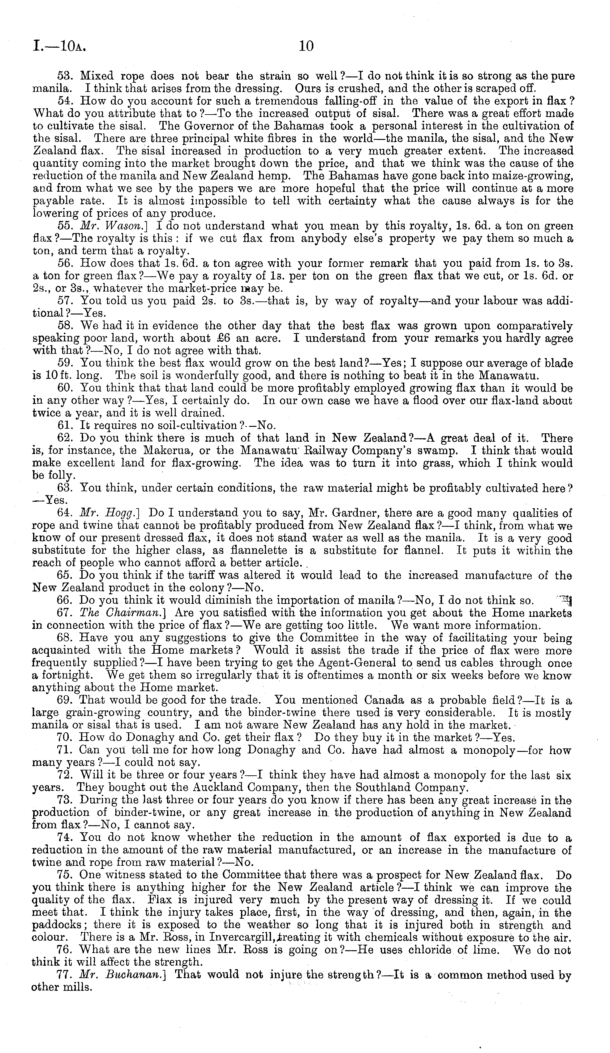 53. Mixed rope does not bear the strain so well ?—I do not think it is so strong as the pure manila. I think that arises from the dressing. Ours is crushed, and the other is scraped off. 54. How do you account for such a tremendous falling-off in the value of the export in flax ? What do you attribute that to ? —To the increased output of sisal. There was a great effort made to cultivate the sisal. The Governor of the Bahamas took a personal interest in the cultivation of the sisal. There are three principal white fibres in the world —the manila, the sisal, and the New Zealand flax. The sisal increased in production to a very much greater extent. The increased quantity coming into the market brought down the price, and that we think was the cause of the reduction of the manila and New Zealand hemp. The Bahamas have gone back into maize-growing, and from what we see by the papers we are more hopeful that the price will continue at a more payable rate. It is almost impossible to tell with certainty what the cause always is for the lowering of prices of any produce. 55. Mr. Wason.] I do not understand what you mean by this royalty, Is. 6d. a ton on green flax ?—The royalty is this : if we cut flax from anybody else's property we pay them so much a ton, and term that a royalty. 56. How does that Is. 6d. a ton agree with your former remark that you paid from Is. to 3s. a ton for green flax? —We pay a royalty of Is. per ton on the green flax that we cut, or Is. 6d. or 25., or 35., whatever the market-price may be. 57. You told us you paid 2s. to 3s. —that is, by way of royalty—and your labour was additional ? —Yes. 58. We had it in evidence the other day that the best flax was grown upon comparatively speaking poor land, worth about £6 an acre. I understand from your remarks you hardly agree with that ?—No, I do not agree with that. 59. You think the best flax would grow on the best land?—-Yes; I suppose our average of blade is 10 ft. long. The soil is wonderfully good, and there is nothing to beat it in the Manawatu. 60. You think that that land could be more profitably employed growing flax than it would be in any other way ?—Yes, I certainly do. In our own case we have a flood over our flax-land about twice a year, and it is well drained. 61. It requires no soil-cultivation?-—No. 62. Do you think there is much of that land in New Zealand?—A great deal of it. There is, for instance, the Makerua, or the Manawatu Railway Company's swamp. I think that would make excellent land for flax-growing. The idea was to turn it into grass, which I think would be folly. 63. You think, under certain conditions, the raw material might be profitably cultivated here ? —Yes. 64. Mr. Hogg.] Do I understand you to say, Mr. Gardner, there are a good many qualities of rope and twine that cannot be profitably produced from New Zealand flax ?—I think, from what we know of our present dressed flax, it does not stand water as well as the manila. It is a very good substitute for the higher class, as flannelette is a substitute for flannel. It puts it within the reach of people who cannot afford a better article.. 65. Do you think if the tariff was altered it would lead to the increased manufacture of the New Zealand product in the colony ? —No. 66. Do you think it would diminish the importation of manila ?—No, Ido not think so. " 7J -| 67. The Chairman.] Are you satisfied with the information you get about the Home markets in connection with the price of flax ?—We are getting too little. We want more information. 68. Have you any suggestions to give the Committee in the way of facilitating your being acquainted with the Home markets ? Would it assist the trade if the price of flax were more frequently supplied ?—I have been trying to get the Agent-General to send us cables through once a fortnight. We get them so irregularly that it is oftentimes a month or six weeks before we know anything about the Home market. 69. That would be good for the trade. You mentioned Canada as a probable field ?—lt is a large grain-growing country, and the binder-twine there used is very considerable. It is mostly manila or sisal that is used. lam not aware New Zealand has any hold in the market. 70. How do Donaghy and Co. get their flax ? Do they buy it in the market ?—Yes. 71. Can you tell me for how long Donaghy and Co. have had almost a monopoly—for how many years ? —I could not say. 72. Will it be three or four years ?—I think they have had almost a monopoly for the last six years. They bought out the Auckland Company, then the Southland Company. 73. During the last three or four years do you know if there has been any great increase in the production of binder-twine, or any great increase in the production of anything in New Zealand from flax ? —No, I cannot say. 74. You do not know whether the reduction in the amount of flax exported is due to a reduction in the amount of the raw material manufactured, or an increase in the manufacture of twine and rope from raw material ? —No. 75. One witness stated to the Committee that there was a prospect for New Zealand flax. Do you think there is anything higher for the New Zealand article ?—I think we can improve the quality of the flax. Flax is injured very much by the present way of dressing it. If we could meet that. I think the injury takes place, first, in the way of dressing, and then, again, in the paddocks; there it is exposed to the weather so long that it is injured both in strength and colour. There is a Mr. Ross, in Invercargill, treating it with chemicals without exposure to the air. 76. What are the new lines Mr. Ross is going on?—He uses chloride of lime. We do not think it will affect the strength. 77. Mr. Buchanan.] That would not injure the strength?—lt is a common method used by other mills.