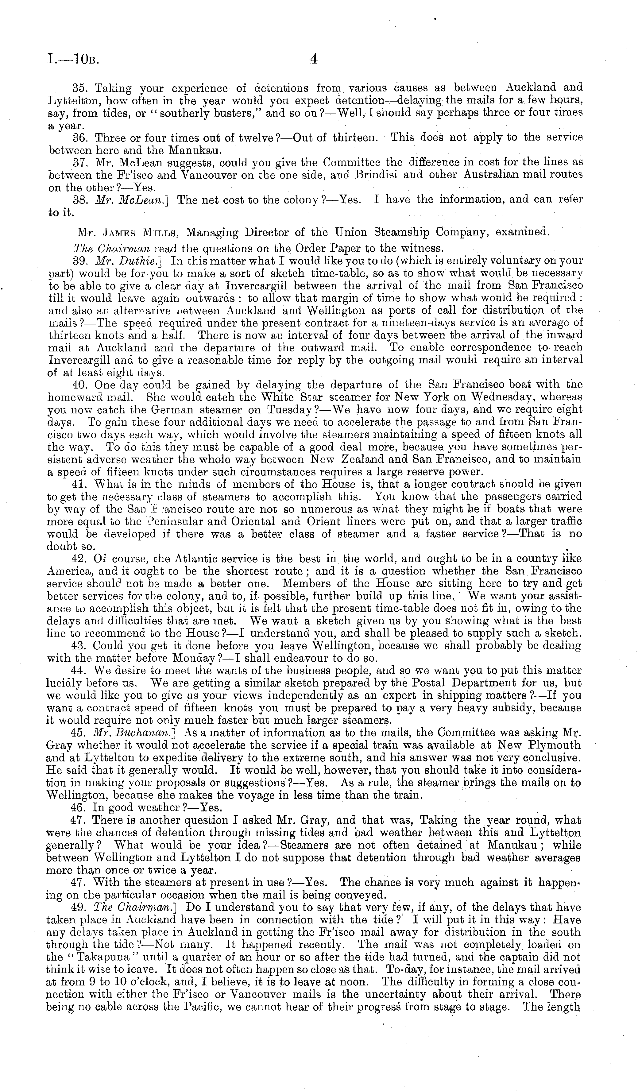 35. Taking your experience of detentions from various causes as between Auckland and Lyttelton, how often in the year would you expect detention: —delaying the mails for a few hours, say, from tides, or " southerly busters," and so on?— Well, I should say perhaps three or four times a year. 36. Three or four times out of twelve ? —Out of thirteen. This does not apply to the service between here and the Manukau. 37. Mr. McLean suggests, could you give the Committee the difference in cost for the lines as between the Frisco and Vancouver on the one side, and Brindisi and other Australian mail routes on the other?— Yes. 38. Mr. McLean.] The net cost to the colony ? —Yes. I have the information, and can refer to it. Mr. James Mills, Managing Director of the Union Steamship Company, examined. The Chairman read the questions on the Order Paper to the witness. 39. Mr. Duthie.] In this matter what I would like you to do (which is entirely voluntary on your part) would be for you to make a sort of sketch time-table, so as to show what would be necessary to be able to give a clear day at Invercargill between the arrival of the mail from San Francisco till it would leave again outwards : to allow that margin of time to show what would be required : and also an alternative between Auckland and Wellington as ports of call for distribution of the mails ?—The speed required under the present contract for a mneteen-days service is an average of thirteen knots and a half. There is now an interval of four days between the arrival of the inward mail at Auckland and the departure of the outward mail. To enable correspondence to reach Invercargill and to give a reasonable time for reply by the outgoing mail would require an interval of at least eight days. 40. One day could be gained by delaying the departure of the San Francisco boat with the homeward mail. She would catch the White Star steamer for New York on Wednesday, whereas you now catch the German steamer on Tuesday ?—We have now four days, and we require eight days. To gain these four additional days we need to accelerate the passage to and from San Francisco two days each way, which would involve the steamers maintaining a speed of fifteen knots all the way. To do this they must be capable of a good deal more, because you have sometimes persistent adverse weather the whole way between New Zealand and San Francisco, and to maintain a speed of fifteen knots under such circumstances requires a large reserve power. 41. What is in the minds of members of the House is, that a longer contract should be given to get the necessary class of steamers to accomplish this. You know that the passengers carried by way of the San i -ancisco route are not so numerous as what they might be if boats that were more equal to the Peninsular and Oriental and Orient liners were put on, and that a larger traffic would be developed if there was a better class of steamer and a faster service ? —That is no doubt so. 42. Of course, the Atlantic service is the best in the world, and ought to be in a country like America, and it ought to be the shortest route ; and it is a question whether the San Francisco service should not be made a better one. Members of the House are sitting here to try and get better services for the colony, and to, if possible, further build up this line. We want your assistance to accomplish this object, but it is felt that the present time-table does not fit in, owing to the delays and difficulties that are met. We want a sketch given us by you showing what is the best line to recommend to the House ?—I understand you, and shall be pleased to supply such a sketch. 43. Could you get it clone before you leave Wellington, because we shall probably be dealing with the matter before Monday?—l shall endeavour to do so, 44. We desire to meet the wants of the business people, and so we want you to put this matter lucidly before us. We are getting a similar sketch prepared by the Postal Department for us, but we would like you to give us your views independently as an expert in shipping matters ?—lf you want a contract speed of fifteen knots you must be prepared to pay a very heavy subsidy, because it would require not only much faster but much larger steamers. 45. Mr. Buchanan.] As a matter of information as to the mails, the Committee was asking Mr. Gray whether it would not accelerate the service if a special train was available at New Plymouth and at Lyttelton to expedite delivery to the extreme south, and his answer was not very conclusive. He said that it generally would. It would be well, however, that you should take it into consideration in making your proposals or suggestions ?—Yes. As a rule, the steamer brings the mails on to Wellington, beca.use she makes the voyage in less time than the train. 46. In good weather ? —Yes. 47. There is another question I asked Mr. Gray, and that was, Taking the year round, what were the chances of detention through missing tides and bad weather between this and Lyttelton generally ? What would be your idea ? —Steamers are not often detained at Manukau; while between Wellington and Lyttelton I do not suppose that detention through bad weather averages more than once or twice a year. 47. With the steamers at present in use? —Yes. The chance is very much against it happening on the particular occasion when the mail is being conveyed. 49. The Chairman.] Do I understand you to say that very few, if any, of the delays that have taken place in Auckland have been in connection with the tide? I will put it in this way: Have any delays taken place in Auckland in getting the Frisco mail away for distribution in the south through the tide ?—Not many. It happened recently. The mail was not completely loaded on the " Takapuna " until a quarter of an. hour or so after the tide had turned, and the captain did not think it wise to leave. It does not often happen so close as that. To-day, for instance, t