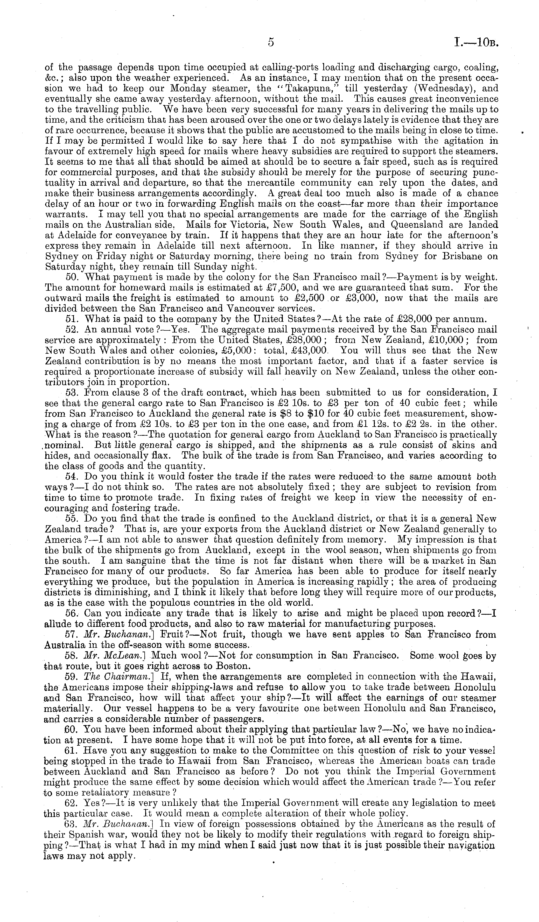 of the passage depends upon time occupied at calling-ports loading and discharging cargo, coaling, &c.; also upon the weather experienced. As an instance, I may mention that on the present occasion we had to keep our Monday steamer, the "Takapuna," till yesterday (Wednesday), and eventually she came away yesterday afternoon, without the mail. This causes great inconvenience to the travelling public. We have been very successful for many years in delivering the mails up to time, and the criticism that has been aroused over the one or two delays lately is evidence that they are of rare occurrence, because it shows that the public are accustomed to the mails being in close to time. If I may be permitted I would like to say here that I do not sympathise with the agitation in favour of extremely high speed for mails where heavy subsidies are required to support the steamers. It seems to me that all that should be aimed at should be to secure a fair speed, such as is required for commercial purposes, and that the subsidy should be merely for the purpose of securing punctuality in arrival and departure, so that the mercantile community can rely upon the dates, and make their business arrangements accordingly. A great deal too much also is made of a chance delay of an hour or two in forwarding English mails on the coast—far more than their importance warrants. I may tell you that no special arrangements are made for the carriage of the English mails on the Australian side. Mails for Victoria, New South Wales, and Queensland are landed at Adelaide for conveyance by train. If it happens that they are an hour late for the afternoon's express they remain in Adelaide till next afternoon. In like manner, if they should arrive in Sydney on Friday night or Saturday morning, there being no train from Sydney for Brisbane on Saturday night, they remain till Sunday night. 50. What payment is made by the colony for the San Francisco mail?— Payment is by weight. The amount for homeward mails is estimated at £7,500, and we are guaranteed that sum. For the outward mails the freight is estimated to amount to £2,500 or £3,000, now that the mails are divided between the San Francisco and Vancouver services. 51. What is paid to the company by the United States?—At the rate of £28,000 per annum. 52. An annual vote? —Yes. The aggregate mail payments received by the San Francisco mail service are approximately : From the United States, £28,000 ; from New Zealand, £10,000 ; from New South Wales and other colonies, £5,000: total, £43,000. You will thus see that the New Zealand contribution is by no means the most important factor, and that if a faster service is required a proportionate increase of subsidy will fall heavily on New Zealand, unless the other contributors join in proportion. 53. From clause 3 of the draft contract, which has been submitted to us for consideration, I see that the general cargo rate to San Francisco is £2 10s. to £3 per ton of 40 cubic feet; while from San Francisco to Auckland the general rate is $8 to $10 for 40 cubic feet measurement, showing a charge of from £2 10s. to £3 per ton in the one case, and from £1 12s. to £2 2s. in the other. What is the reason ?—The quotation for general cargo from Auckland to San Francisco is practically .nominal. But little general cargo is shipped, and the shipments as a rule consist of skins and hides, and occasionally flax. The bulk of the trade is from San Francisco, and varies according to the class of goods and the quantity. 54. Do you think it would foster the trade if the rates were reduced to the same amount both ways ? —I do not think so. The rates are not absolutely fixed ; they are subject to revision from time to time to promote trade. In fixing rates of freight we keep in view the necessity of encouraging and fostering trade. 55. Do you find that the trade is confined to the Auckland district, or that it is a general New Zealand trade ? That is, are your exports from the Auckland district or New Zealand generally to America? —I am not able to answer that question definitely from memory. My impression is that the bulk of the shipments go from Auckland, except in the wool season, when shipments go from the south. lam sanguine that the time is not far distant when there will be a market in San Francisco for many of our products. So far America has been able to produce for itself nearly everything we produce, but the population in America is increasing rapidly ; the area of producing districts is diminishing, and I think it likely that before long they will require more of our products, as is the case with the populous countries in the old world. 56. Can you indicate any trade that is likely to arise and might be placed upon record?—l allude to different food products, and also to raw material for manufacturing purposes. 57. Mr. Buchanan.] Fruit?— Not fruit, though we have sent apples to San Francisco from Australia in the off-season with some success. 58. Mr. McLean.] Much wool?— Not for consumption in San Francisco. Some wool goes by that route, but it goes right across to Boston. 59. The Chairman.] If, when the arrangements are completed in connection with the Hawaii, the Americans impose their shipping-laws and refuse to allow you to take trade between Honolulu and San Francisco, how will that affect your ship?—lt will affect the earnings of our steamer materially. Our vessel happens to be a very favourite one between Honolulu and San Francisco, and carries a considerable number of passengers. .60. You have been informed about their applying that particular law ? —No, we have no indication at present. I have some hope that it will not be put into force, at all events for a time. 61. Have you any suggestion to make to the Committee on this question of risk to your vessel being stopped in the trade to Hawaii from San Francisco, whereas the American boats can trade between Auckland and San Francisco as before