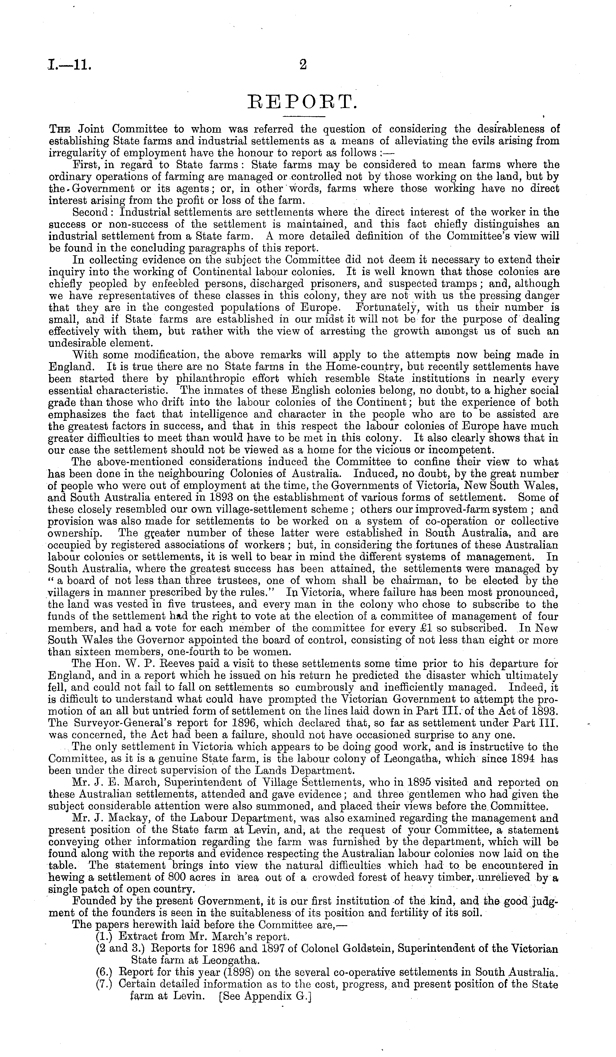EEPOET. The Joint Committee to whom was referred the question of considering the desirableness of establishing State farms and industrial settlements as a means of alleviating the evils arising from irregularity of employment have the honour to report as follows : — First, in regard to State farms : State farms may be considered to mean farms where the ordinary operations of farming are managed or controlled not by those working on the land, but by the - Government or its agents; or, in other words, farms where those working have no direct interest arising from the profit or loss of the farm. Second : Industrial settlements are settlements where the direct interest of the worker in the success or non-success of the settlement is maintained, and this fact chiefly distinguishes an industrial settlement from a State farm. A more detailed definition of the Committee's view will be found in the concluding paragraphs of this report. In collecting evidence on the subject the Committee did not deem it necessary to extend their inquiry into the working of Continental labour colonies. It is well known that those colonies are chiefly peopled by enfeebled persons, discharged prisoners, and suspected tramps; and, although we have representatives of these classes in this colony, they are not with us the pressing danger that they are in the congested populations of Europe. Fortunately, with us their number is small, and if State farms are established in our midst it will not be for the purpose of dealing effectively with them, but rather with the view of arresting the growth amongst us of such an undesirable element. With some modification, the above remarks will apply to the attempts now being made in England. It is true there are no State farms in the Home-country, but recently settlements have been started there by philanthropic effort which resemble State institutions in nearly every essential characteristic. The inmates of these English colonies belong, no doubt, to a higher social grade than those who drift into the labour colonies of the Continent; but the experience of both emphasizes the fact that intelligence and character in the people who are to be assisted are the greatest factors in success, and that in this respect the labour colonies of Europe have much greater difficulties to meet than would have to be met in this colony. It also clearly shows that in our case the settlement should not be viewed as a home for the vicious or incompetent. The above-mentioned considerations induced the Committee to confine their view to what has been done in the neighbouring Colonies of Australia. Induced, no doubt, by the great number of people who were out of employment at the time, the Governments of Victoria, New South Wales, and South Australia entered in 1893 on the establishment of various forms of settlement. Some of these closely resembled our own village-settlement scheme ; others our improved-farm system ; and provision was also made for settlements to be worked on a system of co-operation or collective ownership. The greater number of these latter were established in South Australia, and are occupied by registered associations of workers ; but, in considering the fortunes of these Australian labour colonies or settlements, it is well to bear in mind the different systems of management. In South Australia, where the greatest success has been attained, the settlements were managed by " a board of not less than three trustees, one of whom shall be chairman, to be elected by the villagers in manner prescribed by the rules." In Victoria, where failure has been most pronounced, the land was vested in five trustees, and every man in the colony who chose to subscribe to the funds of the settlement had the right to vote at the election of a committee of management of four members, and had a vote for each member of the committee for every £1 so subscribed. In New South Wales the Governor appointed the board of control, consisting of not less than eight or more than sixteen members, one-fourth to be women. The Hon. W. P. Beeves paid a visit to these settlements some time prior to his departure for England, and in a report which he issued on his return he predicted the disaster which ultimately fell, and could not fail to fall on settlements so cumbrousiy and inefficiently managed. Indeed, it is difficult to understand what could have prompted the Victorian Government to attempt the promotion of an all but untried form of settlement on the lines laid down in Part 111. of the Act of 1893. The Surveyor-General's report for 1896, which declared that, so far as settlement under Part 111. was concerned, the Act had been a failure, should not have occasioned surprise to any one. The only settlement in Victoria which appears to be doing good work, and is instructive to the Committee, as it is a genuine State farm, is the labour colony of Leongatha, which since 1891 has been under the direct supervision of the Lands Department. Mr. J. E. March, Superintendent of Village Settlements, who in 1895 visited and reported on these Australian settlements, attended and gave evidence; and three gentlemen who had given the subject considerable attention were also summoned, and placed their views before the Committee. Mr. J. Mackay, of the Labour Department, was also examined regarding the management and present position of the State farm at Levin, and, at the request of your Committee, a statement conveying other information regarding the farm was furnished by the department, which will be found along with the reports and evidence respecting the Australian labour colonies now laid on the table. The statement brings into view the natural difficulties which had to be encountered in hewing a settlement of 800 acres in area out of a crowded forest of heavy timber, unrelieved by a single patch of open country. Founded by the present Government, it is our first institution of the kind, and the good judgment of the founders is 