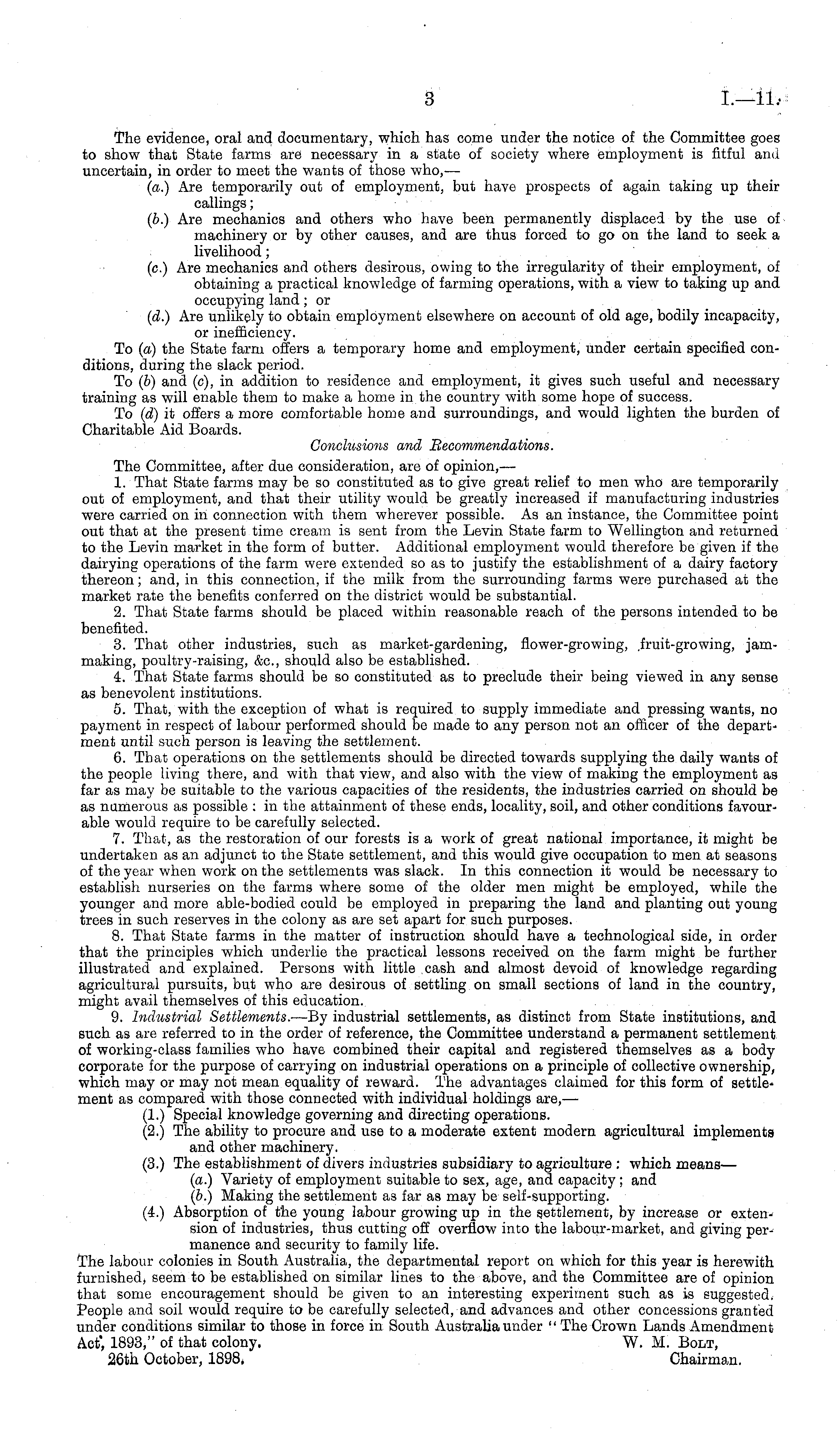 The evidence, oral and documentary, which has come under the notice of the Committee goes to show that State farms are necessary in a state of society where employment is fitful and uncertain, in order to meet the wants of those who, — (a.) Are temporarily out of employment, but have prospects of again taking up their callings; (b.) Are mechanics and others who have been permanently displaced by the use of machinery or by other causes, and are thus forced to go on the land to seek a livelihood; (c.) Are mechanics and others desirous, owing to the irregularity of their employment, of obtaining a practical knowledge of farming operations, with a view to taking up and occupying land; or (d.) Are unlikely to obtain employment elsewhere on account of old age, bodily incapacity, or inefficiency. To (a) the State farm offers a temporary home and employment, under certain specified conditions, during the slack period. To (b) and (c), in addition to residence and employment, it gives such useful and necessary training as will enable them to make a home in the country with some hope of success. To (d) it offers a more comfortable home and surroundings, and would lighten the burden of Charitable Aid Boards. Conclusions and Becommendations. The Committee, after due consideration, are of opinion,—■ 1. That State farms may be so constituted as to give great relief to men who are temporarily out of employment, and that their utility would be greatly increased if manufacturing industries were carried on in connection with them wherever possible. As an instance, the Committee point out that at the present time cream is sent from the Levin State farm to Wellington and returned to the Levin market in the form of butter. Additional employment would therefore be given if the dairying operations of the farm were extended so as to justify the establishment of a dairy factory thereon; and, in this connection, if the milk from the surrounding farms were purchased at the market rate the benefits conferred on the district would be substantial. 2. That State farms should be placed within reasonable reach of the persons intended to be benefited. 3. That other industries, such as market-gardening, flower-growing, fruit-growing, jammaking, poultry-raising, &c, should also be established. 4. That State farms should be so constituted as to preclude their being viewed in any sense as benevolent institutions. 5. That, with the exception of what is required to supply immediate and pressing wants, no payment in respect of labour performed should be made to any person not an officer of the department until such person is leaving the settlement. 6. That operations on the settlements should be directed towards supplying the daily wants of the people living there, and with that view, and also with the view of making the employment as far as may be suitable to the various capacities of the residents, the industries carried on should be as numerous as possible : in the attainment of these ends, locality, soil, and other conditions favourable would require to be carefully selected. 7. That, as the restoration of our forests is a work of great national importance, it might be undertaken as an adjunct to the State settlement, and this would give occupation to men at seasons of the year when work on the settlements was slack. In this connection it would be necessary to establish nurseries on the farms where some of the older men might be employed, while the younger and more able-bodied could be employed in preparing the land and planting out young trees in such reserves in the colony as are set apart for such purposes. 8. That State farms in the matter of instruction should have a technological side, in order that the principles which underlie the practical lessons received on the farm might be further illustrated and explained. Persons with little cash and almost devoid of knowledge regarding agricultural pursuits, but who are desirous of settling on small sections of land in the country, might avail themselves of this education. 9. Industrial Settlements. —By industrial settlements, as distinct from State institutions, and such as are referred to in the order of reference, the Committee understand a permanent settlement of working-class families who have combined their capital and registered themselves as a body corporate for the purpose of carrying on industrial operations on a principle of collective ownership, which may or may not mean equality of reward. The advantages claimed for this form of settlement as compared with those connected with individual holdings are, — (1.) Special knowledge governing and directing operations. (2.) The ability to procure and use to a moderate extent modern agricultural implements and other machinery. (3.) The establishment of divers industries subsidiary to agriculture : which means— (a.) Variety of employment suitable to sex, age, and capacity ; and (b.) Making the settlement as far as may be self-supporting. (4.) Absorption of the young labour growing up in the settlement, by increase or extension of industries, thus cutting off overflow into the labour-market, and giving permanence and security to family life. The labour colonies in South Australia, the departmental report on which for this year is herewith furnished, seem to be established on similar lines to the above, and the Committee are of opinion that some encouragement should be given to an interesting experiment such as is suggested. People and soil would require to be carefully selected, and advances and other concessions granted under conditions similar to those in force in South Australia under " The Crown Lands Amendment Act*, 1893," of that colony. W. M. Bolt, 26th October, 1898. Chairman.