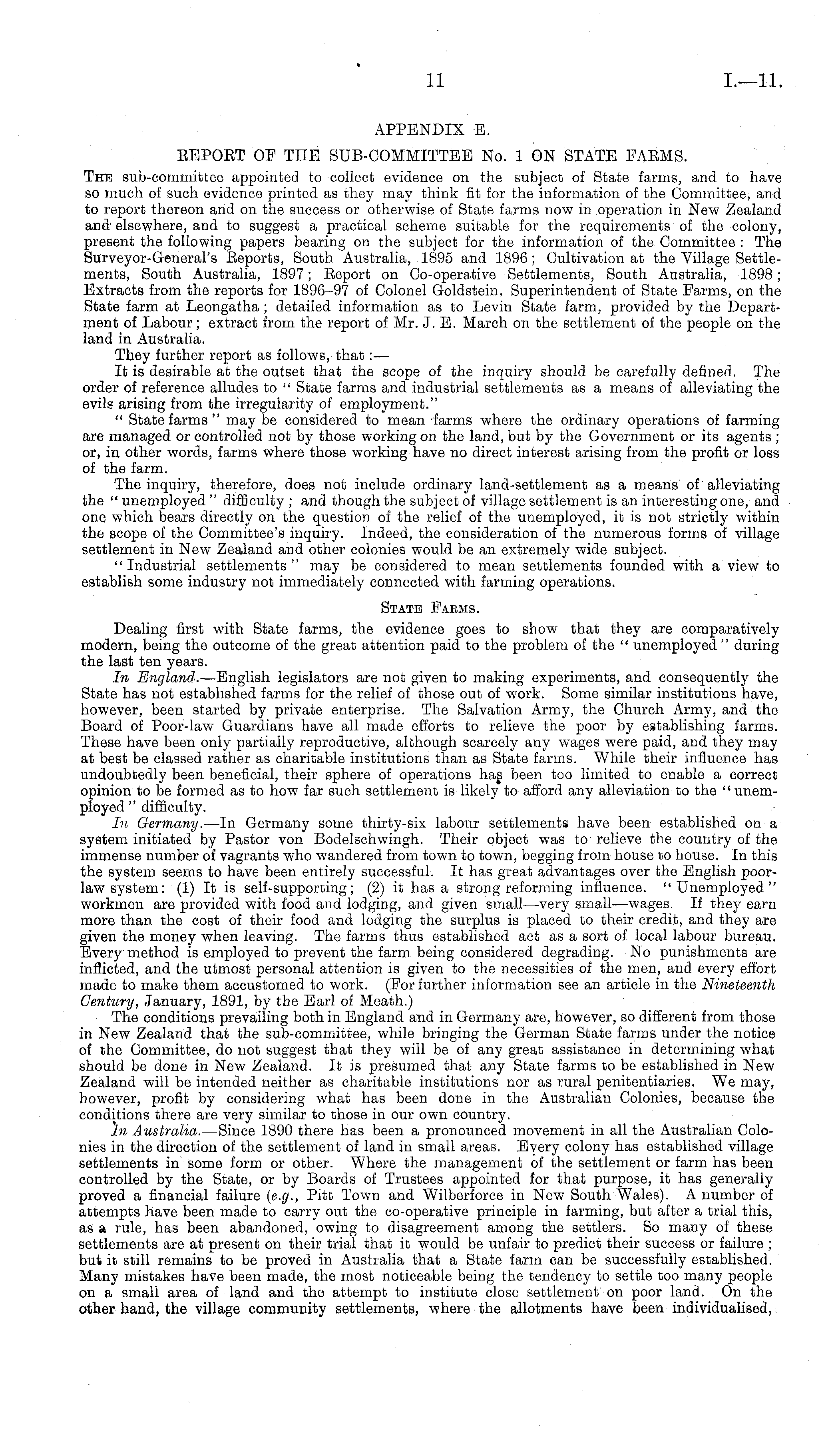 APPENDIX E. REPORT OF THE SUB-COMMITTEE No. 1 ON STATE FARMS. The sub-committee appointed to collect evidence on the subject of State farms, and to have so much of such evidence printed as they may think fit for the information of the Committee, and to report thereon and on the success or otherwise of State farms now in operation in New Zealand and elsewhere, and to suggest a practical scheme suitable for the requirements of the colony, present the following papers bearing on the subject for the information of the Committee : The Surveyor-General's Reports, South Australia, 1895 and 1896 ; Cultivation at the Village Settlements, South Australia, 1897; Report on Co-operative Settlements, South Australia, 1898; Extracts from the reports for 1896-97 of Colonel Goldstein, Superintendent of State Farms, on the State farm at Leongatha ; detailed information as to Levin State farm, provided by the Department of Labour; extract from the report of Mr. J. E. March on the settlement of the people on the land in Australia. They further report as follows, that : — It is desirable at the outset that the scope of the inquiry should be carefully defined. The order of reference alludes to " State farms and industrial settlements as a means of alleviating the evils arising from the irregularity of employment." " State farms " may be considered to mean farms where the ordinary operations of farming are managed or controlled not by those working on the land, but by the Government or its agents ; or, in other words, farms where those working have no direct interest arising from the profit or loss of the farm. The inquiry, therefore, does not include ordinary land-settlement as a means of alleviating the " unemployed " difficulty ; and though the subject of village settlement is an interesting one, and one which bears directly on the question of the relief of the unemployed, it is not strictly within the scope of the Committee's inquiry. Indeed, the consideration of the numerous forms of village settlement in New Zealand and other colonies would be an extremely wide subject. "Industrial settlements" may be considered to mean settlements founded with a view to establish some industry not immediately connected with farming operations. State Farms. Dealing first with State farms, the evidence goes to show that they are comparatively modern, being the outcome of the great attention paid to the problem of the " unemployed " during the last ten years. In England. —English legislators are not given to making experiments, and consequently the State has not established farms for the relief of those out of work. Some similar institutions have, however, been started by private enterprise. The Salvation Army, the Church Army, and the Board of Poor-law Guardians have all made efforts to relieve the poor by establishing farms. These have been only partially reproductive, although scarcely any wages were paid, and they may at best be classed rather as charitable institutions than as State farms. While their influence has undoubtedly been beneficial, their sphere of operations has been too limited to enable a correct opinion to be formed as to how far such settlement is likely to afford any alleviation to the " unemployed " difficulty. In Germany. —ln Germany some thirty-six labour settlements have been established on a system initiated by Pastor yon Bodelschwingh. Their object was to relieve the country of the immense number of vagrants who wandered from town to town, begging from house to house. In this the system seems to have been entirely successful. It has great advantages over the English poorlaw system: (1) It is self-supporting; (2) it has a strong reforming influence. "Unemployed" workmen are provided with food and lodging, and given small—very small —wages. If they earn more than the cost of their food and lodging the surplus is placed to their credit, and they are given the money when leaving. The farms thus established act as a sort of local labour bureau. Every method is employed to prevent the farm being considered degrading. No punishments are inflicted, and the utmost personal attention is given to the necessities of the men, and every effort made to make them accustomed to work. (For further information see an article in the Nineteenth Century, January, 1891, by the Earl of Meath.) The conditions prevailing both in England and in Germany are, however, so different from those in New Zealand that the sub-committee, while bringing the German State farms under the notice of the Committee, do not suggest that they will be of any great assistance in determining what should be done in New Zealand. It is presumed that any State farms to be established in New Zealand will be intended neither as charitable institutions nor as rural penitentiaries. We may, however, profit by considering what has been done in the Australian Colonies, because the conditions there are very similar to those in our own country. In Australia. —Since 1890 there has been a pronounced movement in all the Australian Colonies in the direction of the settlement of land in small areas. Every colony has established village settlements in some form or other. Where the management of the settlement or farm has been controlled by the State, or by Boards of Trustees appointed for that purpose, it has generally proved a financial failure (e.g., Pitt Town and Wilberforce in New South Wales). A number of attempts have been made to carry out the co-operative principle in farming, but after a trial this, as a rule, has been abandoned, owing to disagreement among the settlers. So many of these settlements are at present on their trial that it would be unfair to predict their success or failure ; but it still remains to be proved in Australia that a State farm can be successfully established. Many mistakes have been made, the most noticeable being the tendency to settle too many people on a small area of land and the attempt to institute close sett