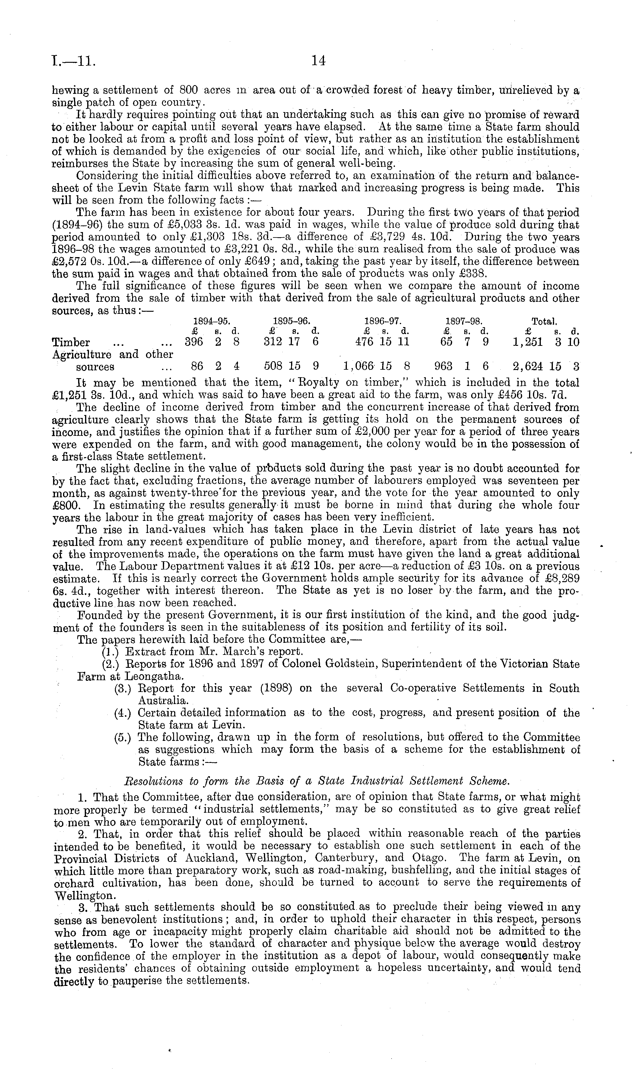 hewing a settlement of 800 acres m area out of a crowded forest of heavy timber, unrelieved by a single patch of open country. It hardly requires pointing out that an undertaking such as this can give no promise of reward to either labour or capital until several years have elapsed. At the same time a State farm should not be looked at from a profit and loss point of view, but rather as an institution the establishment of which is demanded by the exigencies of our social life, and which, like other public institutions, reimburses the State by increasing the sum of general well-being. Considering the initial difficulties above referred to, an examination of the return and balancesheet of the Levin State farm will show that marked and increasing progress is being made. This will be seen from the following facts : — The farm has been in existence for about four years. During the first two years of that period (1894-96) the sum of £5,033 3s. Id. was paid in wages, while the value of produce sold during that period amounted to only £1,303 18s. 3d.—a difference of £3,729 4s. lOd. During the two years 1896-98 the wages amounted to £3,221 os. Bd., while the sum realised from the sale of produce was £2,572 os. lOd.—a difference of only £649 ; and, taking the past year by itself, the difference between the sum paid in wages and that obtained from the sale of products was only £338. The full significance of these figures will be seen when we compare the amount of income derived from the sale of timber with that derived from the sale of agricultural products and other sources, as thus: — 1894-95. 1895-96. 1896-97. 1897-98. Total. £ a. d. £ s. d. £ s. d. £ s. d. £ s. d. Timber ... ... 396 2 8 312 17 6 476 15 11 65 7 9 1,251 3 10 Agriculture and other sources ... 86 2 4 508 15 9 1,066 15 8 963 1 6 2,624 15 3 It may be mentioned that the item, " Royalty on timber," which is included in the total £1,251 3s. 10d., and which was said to have been a great aid to the farm, was only £456 10s. 7d. The decline of income derived from timber and the concurrent increase of that derived from agriculture clearly shows that the State farm is getting its hold on the permanent sources of income, and justifies the opinion that if a further sum of £2,000 per year for a period of three years were expended on the farm, and with good management, the colony would be in the possession of a first-class State settlement. The slight decline in the value of prbducts sold during the past year is no doubt accounted for by the fact that, excluding fractions, the average number of labourers employed was seventeen per month, as against twenty-three'for the previous year, and the vote for the year amounted to only £800. In estimating the results generally it must be borne in mind that during the whole four years the labour in the great majority of cases has been very inefficient. The rise in land-values which has taken place in the Levin district of late years has not resulted from any recent expenditure of public money, and therefore, apart from the actual value of the improvements made, the operations on the farm must have given the land a great additional value. The Labour Department values it at £12 10s. per acre—a reduction of £3 10s. on a previous estimate. If this is nearly correct the Government holds ample security for its advance of £8,289 6s. 4d., together with interest thereon. The State as yet is no loser by the farm, and the productive line has now been reached. Founded by the present Government, it is our first institution of the kind, and the good judgment of the founders is seen in the suitableness of its position and fertility of its soil. The papers herewith laid before the Committee are, — (1.) Extract from Mr. March's report. (2.) Reports for 1896 and 1897 of Colonel Goldstein, Superintendent of the Victorian State Farm at Leongatha. (3.) Report for this year (1898) on the several Co-operative Settlements in South Australia. (4.) Certain detailed information as to the cost, progress, and present position of the State farm at Levin. (5.) The following, drawn up in the form of resolutions, but offered to the Committee as suggestions which may form the basis of a scheme for the establishment of State farms:— Resolutions to form the Basis of a State Industrial Settlement Scheme. 1. That the Committee, after due consideration, are of opinion that State farms, or what might more properly be termed "industrial settlements," may be so constituted as to give great relief to men who are temporarily out of employment. 2. That, in order that this relief should be placed within reasonable reach of the parties intended to be benefited, it would be necessary to establish one such settlement in each of the Provincial Districts of Auckland, Wellington, Canterbury, and Otago. The farm at Levin, on which little more than preparatory work, such as road-making, bushfelling, and the initial stages of orchard cultivation, has been done, should be turned to account to serve the requirements of Wellington. 3. That such settlements should be so constituted as to preclude their being viewed in any sense as benevolent institutions; and, in order to uphold their character in this respect, persons who from age or incapacity might properly claim charitable aid should not be admitted to the settlements. To lower the standard of character and physique below the average would destroy the confidence of the employer in the institution as a depot of labour, would consequently make the residents' chances of obtaining outside employment a hopeless uncertainty, and would tend directly to pauperise the settlements.