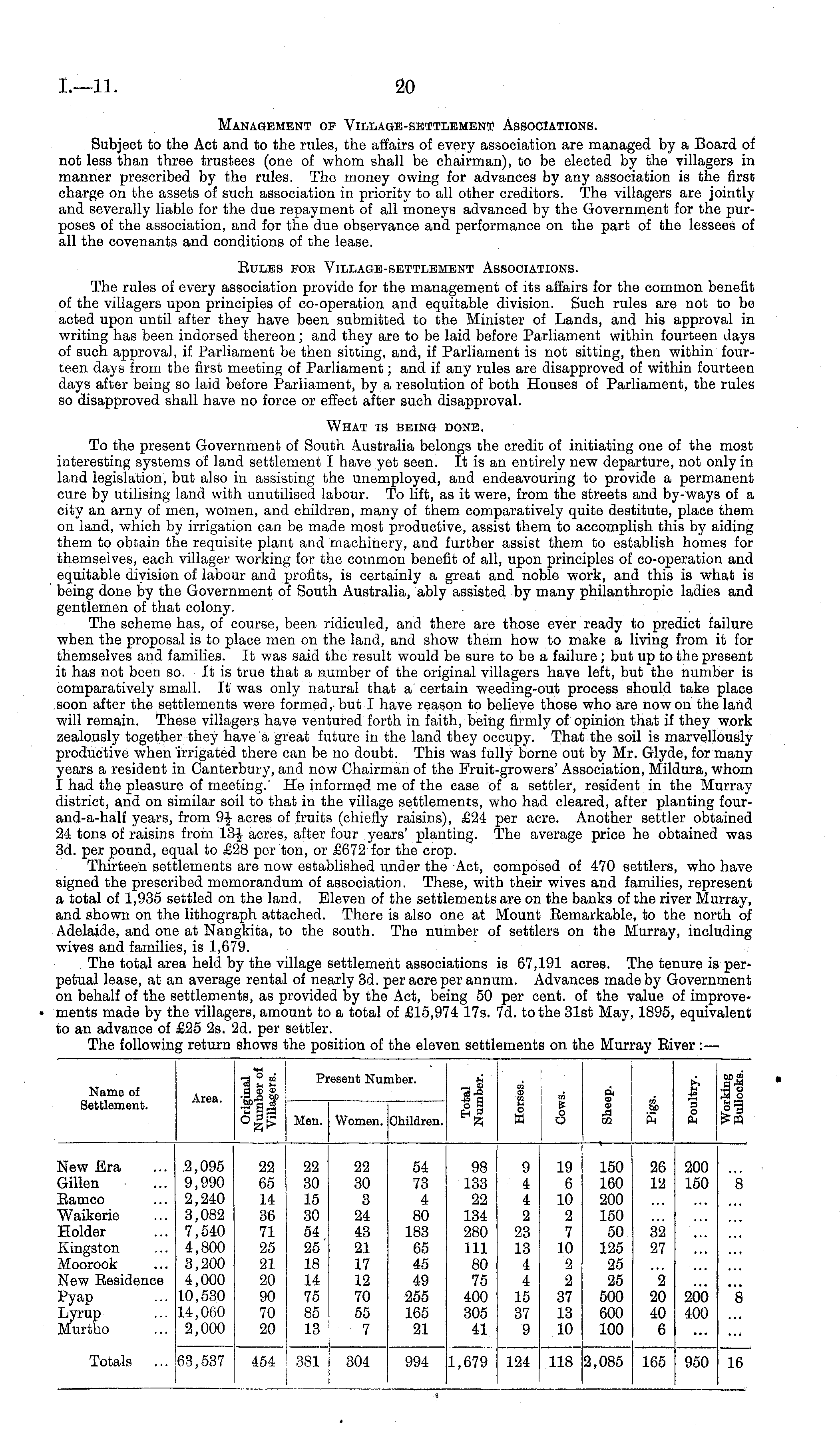 Management op Village-settlement Associations. Subject to the Act and to the rules, the affairs of every association are managed by a Board of not less than three trustees (one of whom shall be chairman), to be elected by the villagers in manner prescribed by the rules. The money owing for advances by any association is the first charge on the assets of such association in priority to all other creditors. The villagers are jointly and severally liable for the due repayment of all moneys advanced by the Government for the purposes of the association, and for the due observance and performance on the part of the lessees of all the covenants and conditions of the lease. Boxes foe Village-settlement Associations. The rules of every association provide for the management of its affairs for the common benefit of the villagers upon principles of co-operation and equitable division. Such rules are not to be acted upon until after they have been submitted to the Minister of Lands, and his approval in writing has been indorsed thereon; and they are to be laid before Parliament within fourteen days of such approval, if Parliament be then sitting, and, if Parliament is not sitting, then within fourteen days from the first meeting of Parliament; and if any rules are disapproved of within fourteen days after being so laid before Parliament, by a resolution of both Houses of Parliament, the rules so disapproved shall have no force or effect after such disapproval. What is being done. To the present Government of South Australia belongs the credit of initiating one of the most interesting systems of land settlement I have yet seen. It is an entirely new departure, not only in land legislation, but also in assisting the unemployed, and endeavouring to provide a permanent cure by utilising land with unutilised labour. To lift, as it were, from the streets and by-ways of a city an amy of men, women, and children, many of them comparatively quite destitute, place them on land, which by irrigation can be made most productive, assist them to accomplish this by aiding them to obtain the requisite plant and machinery, and further assist them to establish homes for themselves, each villager working for the common benefit of all, upon principles of co-operation and equitable division of labour and profits, is certainly a great and noble work, and this is what is being done by the Government of South Australia, ably assisted by many philanthropic ladies and gentlemen of that colony. The scheme has, of course, been ridiculed, and there are those ever ready to predict failure when the proposal is to place men on the land, and show them how to make a living from it for themselves and families. It was said the result would be sure to be a failure ; but up to the present it has not been so. It is true that a number of the original villagers have left, but the number is comparatively small. It was only natural that a certain weeding-out process should take place soon after the settlements were formed,, but I have reason to believe those who are now on the land will remain. These villagers have ventured forth in faith, being firmly of opinion that if they work zealously together they have a great future in the land they occupy. That the soil is marvellously productive when irrigated there can be no doubt. This was fully borne out by Mr. Glyde, for many years a resident in Canterbury, and now Chairman of the Fruit-growers' Association, Mildura, whom I had the pleasure of meeting. He informed me of the case of a settler, resident in the Murray district, and on similar soil to that in the village settlements, who had cleared, after planting four-and-a-half years, from 9J acres of fruits (chiefly raisins), £24 per acre. Another settler obtained 24 tons of raisins from acres, after four years' planting. The average price he obtained was 3d. per pound, equal to £28 per ton, or £672 for the crop. Thirteen settlements are now established under the Act, composed of 470 settlers, who have signed the prescribed memorandum of association. These, with their wives and families, represent a total of 1,935 settled on the land. Eleven of the settlements are on the banks of the river Murray, and shown on the lithograph attached. There is also one at Mount Eemarkable, to the north of Adelaide, and one at Nangkita, to the south. The number of settlers on the Murray, including wives and families, is 1,679. The total area held by the village settlement associations is 67,191 acres. The tenure is perpetual lease, at an average rental of nearly 3d. per acre per annum. Advances made by Government on behalf of the settlements, as provided by the Act, being 50 per cent, of the value of improvements made by the villagers, amount to a total of £15,974 17s. 7d. to the 31st May, 1895, equivalent to an advance of £25 2s. 2d. per settler. The following return shows the position of the eleven settlements on the Murray Eiver: —
