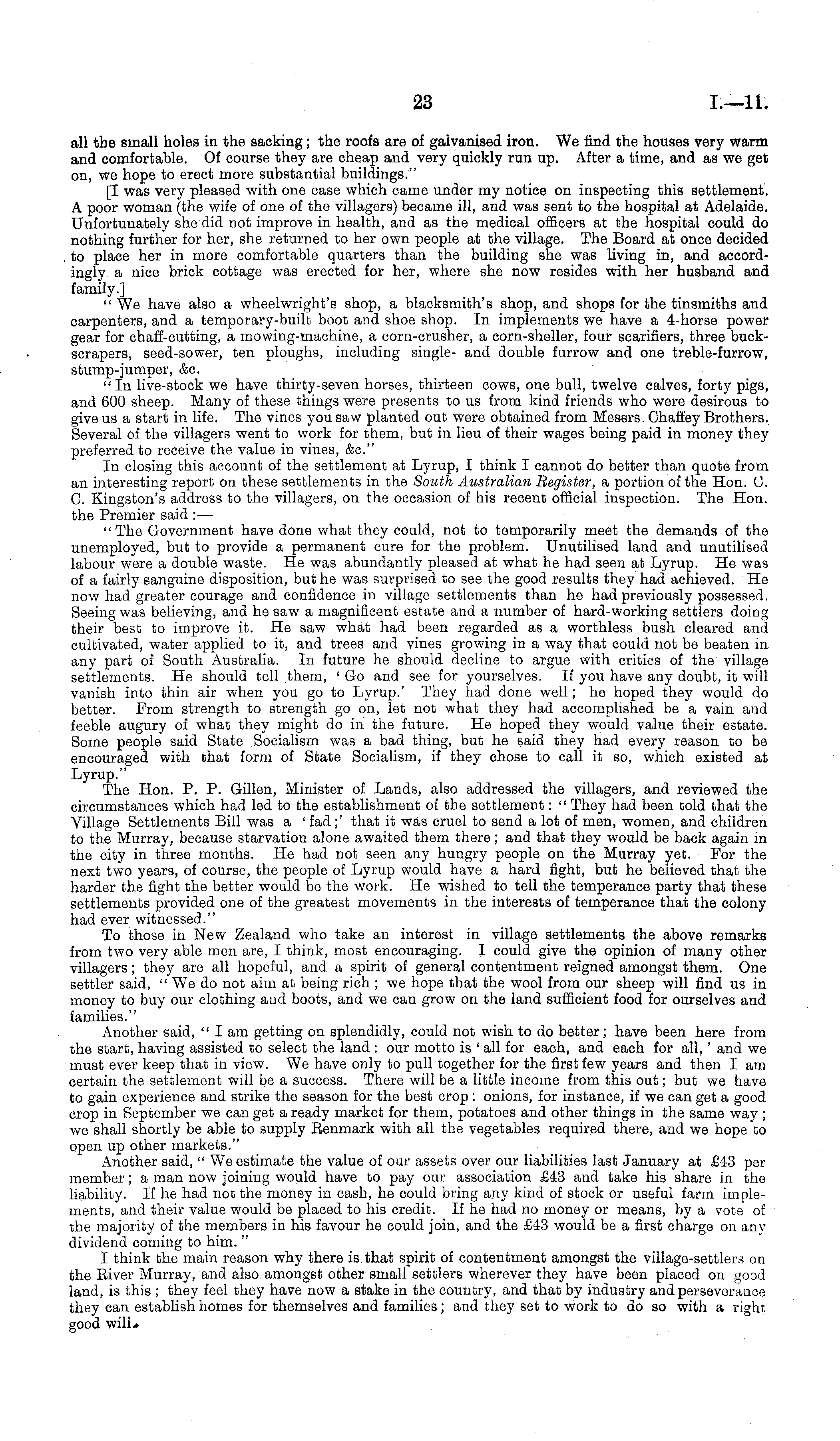 all the small holes in the sacking; the roofs are of galvanised iron. We find the houses very warm and comfortable. Of course they are cheap and very quickly run up. After a time, and as we get on, we hope to erect more substantial buildings." [I was very pleased with one case which came under my notice on inspecting this settlement. A poor woman (the wife of one of the villagers) became ill, and was sent to the hospital at Adelaide. Unfortunately she did not improve in health, and as the medical officers at the hospital could do nothing further for her, she returned to her own people at the village. The Board at once decided to place her in more comfortable quarters than the building she was living in, and accordingly a nice brick cottage was erected for her, where she now resides with her husband and family.] " We have also a wheelwright's shop, a blacksmith's shop, and shops for the tinsmiths and carpenters, and a temporary-built boot and shoe shop. In implements we have a 4-horse power gear for chaff-cutting, a mowing-machine, a corn-crusher, a corn-sheller, four scarifiers, three buckscrapers, seed-sower, ten ploughs, including single- and double furrow and one treble-furrow, stump-jumper, &c. "In live-stock we have thirty-seven horses, thirteen cows, one bull, twelve calves, forty pigs, and 600 sheep. Many of these things were presents to us from kind friends who were desirous to give us a start in life. The vines you saw planted out were obtained from Messrs. Chaffey Brothers. Several of the villagers went to work for them, but in lieu of their wages being paid in money they preferred to receive the value in vines, &c." In closing this account of the settlement at Lyrup, I think I cannot do better than quote from an interesting report on these settlements in the South Australian Register, a portion of the Hon. C. C. Kingston's address to the villagers, on the occasion of his recent official inspection. The Hon. the Premier said :— "The Government have done what they could, not to temporarily meet the demands of the unemployed, but to provide a permanent cure for the problem. Unutilised land and unutilised labour were a double waste. He was abundantly pleased at what he had seen at Lyrup. He was of a fairly sanguine disposition, but he was surprised to see the good results they had achieved. He now had greater courage and confidence in village settlements than he had previously possessed. Seeing was believing, and he saw a magnificent estate and a number of hard-working settlers doing their best to improve it. He saw what had been regarded as a worthless bush cleared and cultivated, water applied to it, and trees and vines growing in a way that could not be beaten in any part of South Australia. In future he should decline to argue with critics of the village settlements. He should tell them, 'Go and see for yourselves. If you have any doubt, it will vanish into thin air when you go to Lyrup.' They had done well; he hoped they would do better. From strength to strength go on, let not what they had accomplished be a vain and feeble augury of what they might do in the future. He hoped they would value their estate. Some people said State Socialism was a bad thing, but he said they had every reason to be encouraged, with that form of State Socialism, if they chose to call it so, which existed at Lyrup." The Hon. P. P. Gillen, Minister of Lands, also addressed the villagers, and reviewed the circumstances which had led to the establishment of the settlement: " They had been told that the Village Settlements Bill was a ' fad ;' that it was cruel to send a lot of men, women, and children to the Murray, because starvation alone awaited them there; and that they would be back again in the city in three months. He had not seen any hungry people on the Murray yet. For the next two years, of course, the people of Lyrup would have a hard fight, but he believed that the harder the fight the better would be the work. He wished to tell the temperance party that these settlements provided one of the greatest movements in the interests of temperance that the colony had ever witnessed." To those in New Zealand who take an interest in village settlements the above remarks from two very able men are, I think, most encouraging. I could give the opinion of many other villagers; they are all hopeful, and a spirit of general contentment reigned amongst them. One settler said, " We do not aim at being rich ; we hope that the wool from our sheep will find us in money to buy our clothing and boots, and we can grow on the land sufficient food for ourselves and families." Another said, " I am getting on splendidly, could not wish to do better; have been here from the start, having assisted to select the land : our motto is ' all for each, and each for all,' and we must ever keep that in view. We have only to pull together for the first few years and then I am certain the settlement will be a success. There will be a little income from this out; but we have to gain experience and strike the season for the best crop : onions, for instance, if we can get a good crop in September we can get a ready market for them, potatoes and other things in the same way ; we shall shortly be able to supply Renmark with all the vegetables required there, and we hope to open up other markets." Another said, " We estimate the value of our assets over our liabilities last January at £43 per member; a man now joining would have to pay our association £43 and take his share in the liability. If he had not the money in cash, he could bring any kind of stock or useful farm implements, and their value would be placed to his credit. If he had no money or means, by a vote of the majority of the members in his favour he could join, and the £43 would be a first charge on any dividend coming to him. " I think the main reason why there is that spirit of contentment amongst the village-settlers on the River Murray, and also amongst other 
