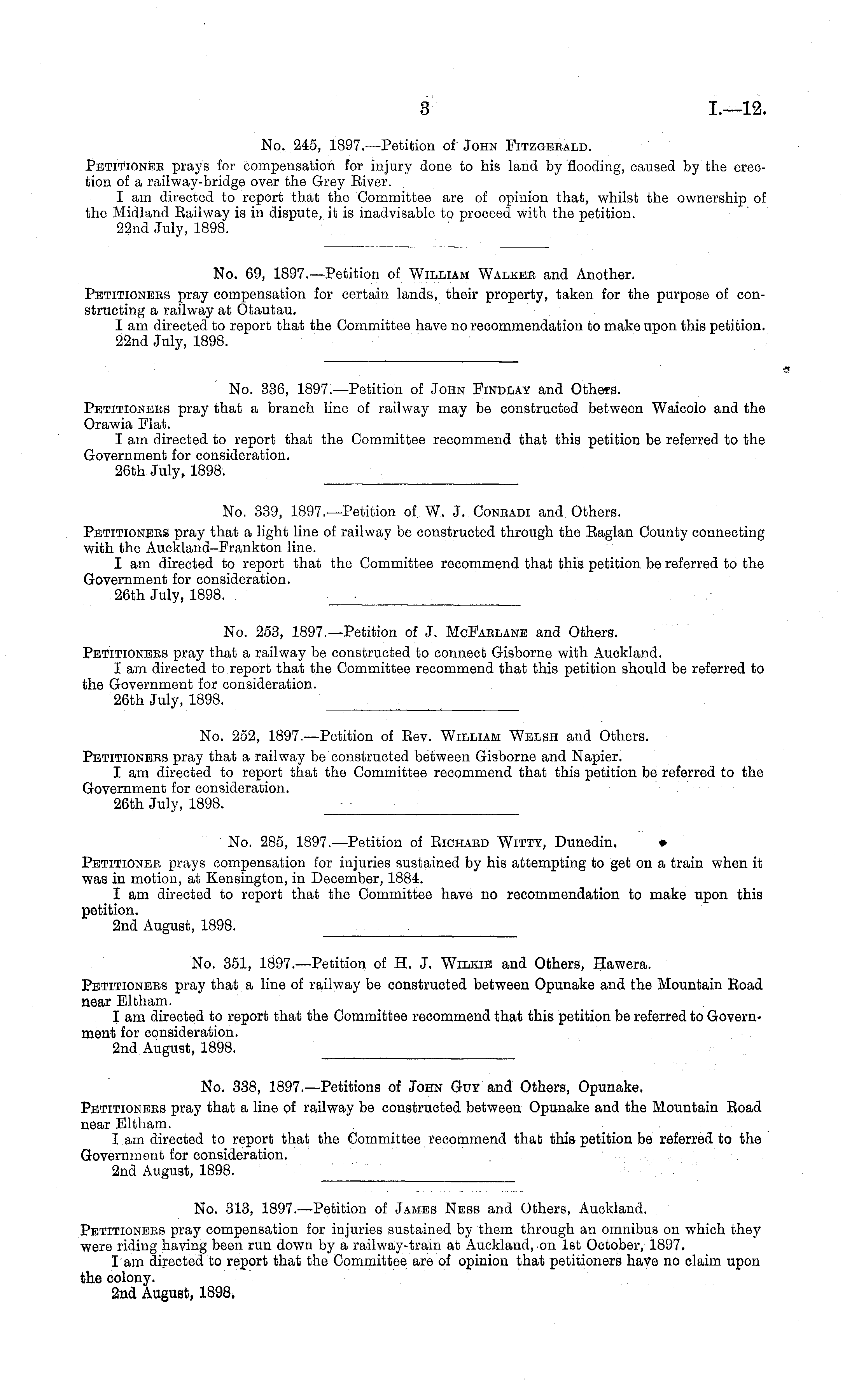 No. 69, 1897.—Petition of William Walkee and Another. Petitionees pray compensation for certain lands, their property, taken for the purpose of constructing a railway at Otautau. I am directed to report that the Committee have no recommendation to make upon this petition. 22nd July, 1898.
