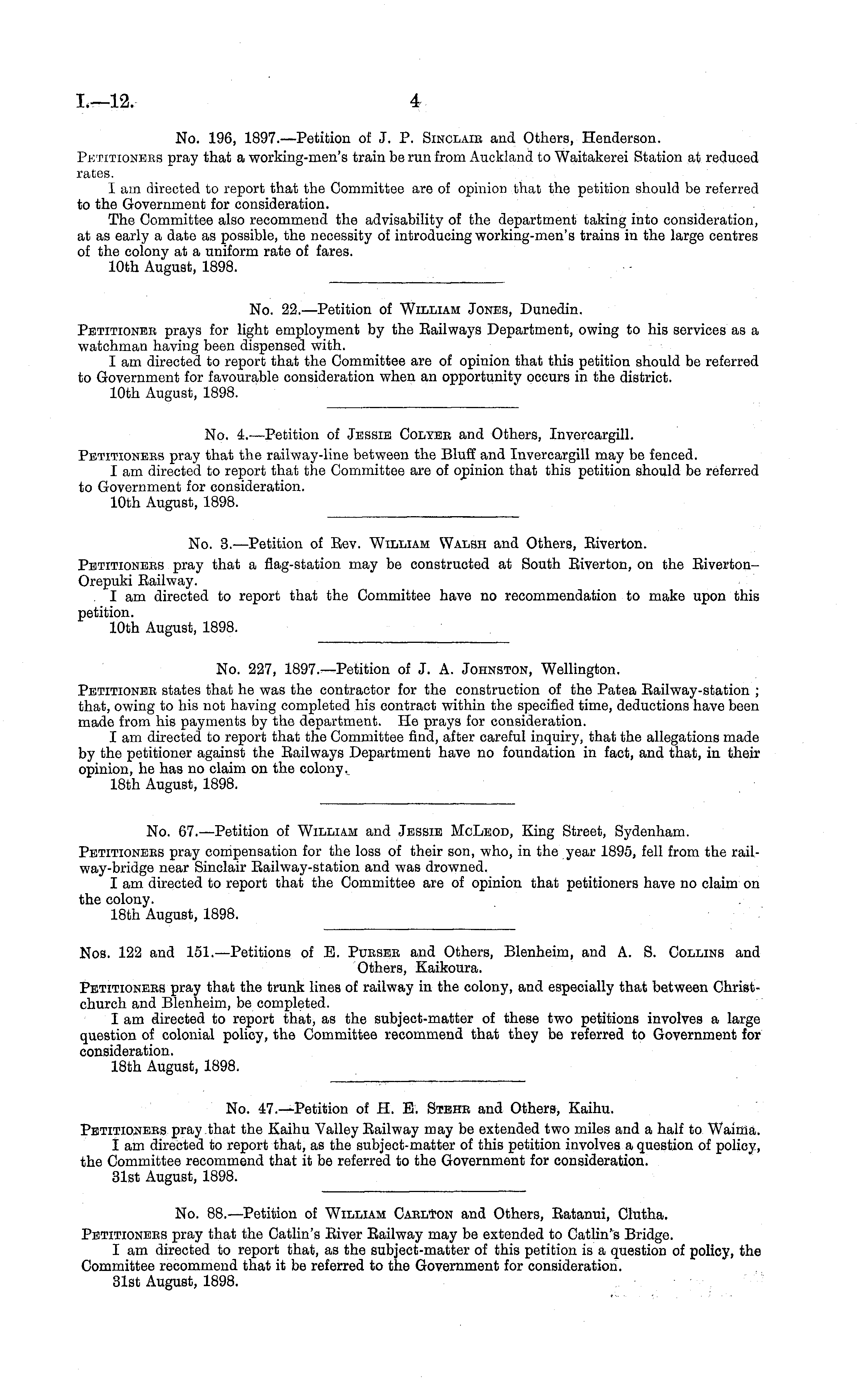 No. 196, 1897. —Petition of J. P. Sinclair and Others, Henderson. Petitionees pray that a working-men's train be run from Auckland to Waitakerei Station at reduced rates. I am directed to report that the Committee are of opinion that the petition should be referred to the Government for consideration. The Committee also recommend the advisability of the department taking into consideration, at as early a date as possible, the necessity of introducing working-men's trains in the large centres of the colony at a uniform rate of fares. 10th August, 1898.