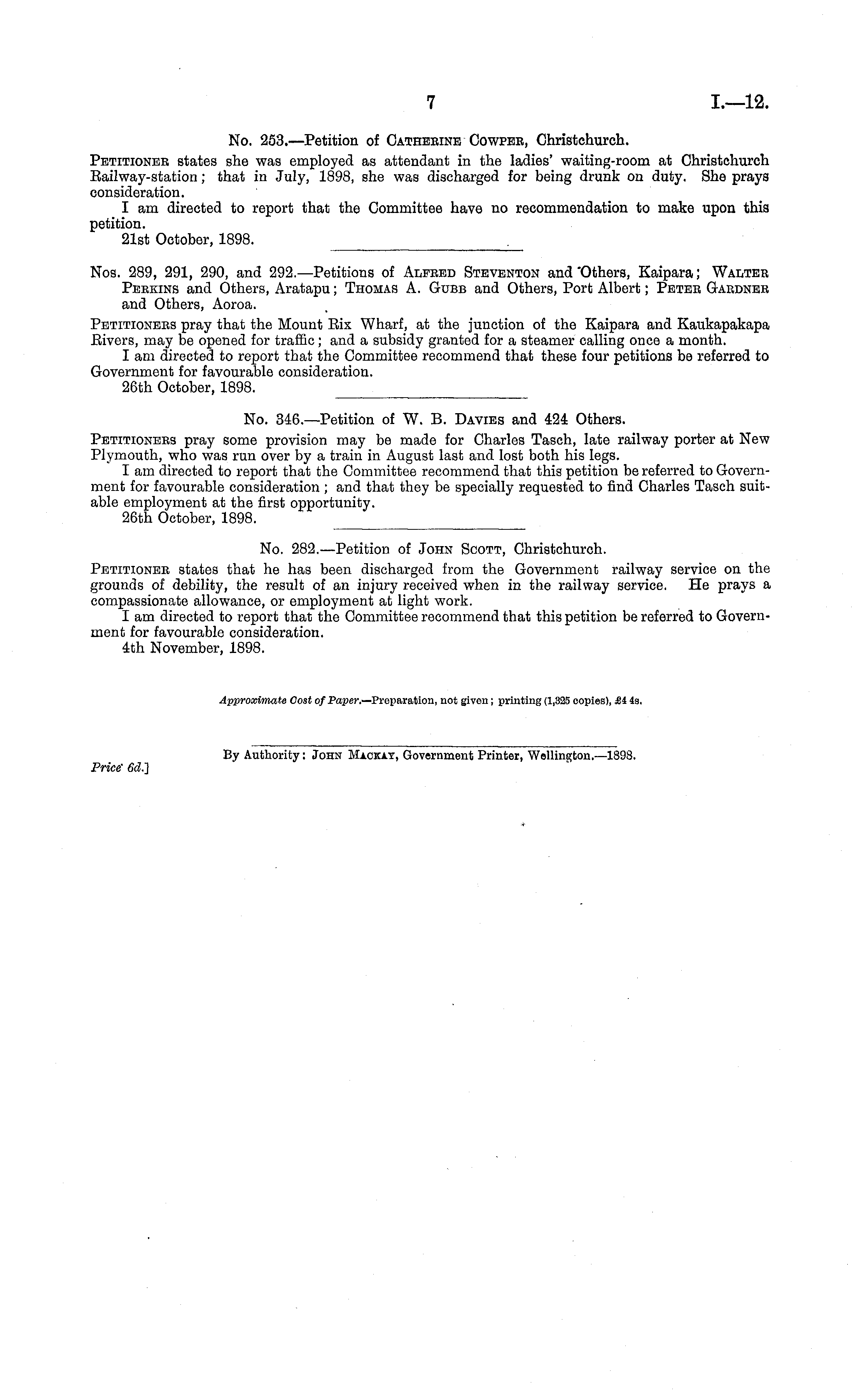 No. 253.—Petition of Catherine Cowper, Christchurch. Petitionee states she was employed as attendant in the ladies' waiting-room at Christchurch Eailway-station; that in July, 1898, she was discharged for being drunk on duty. She prays consideration. I am directed to report that the Committee have no recommendation to make upon this petition. 21st October, 1898.