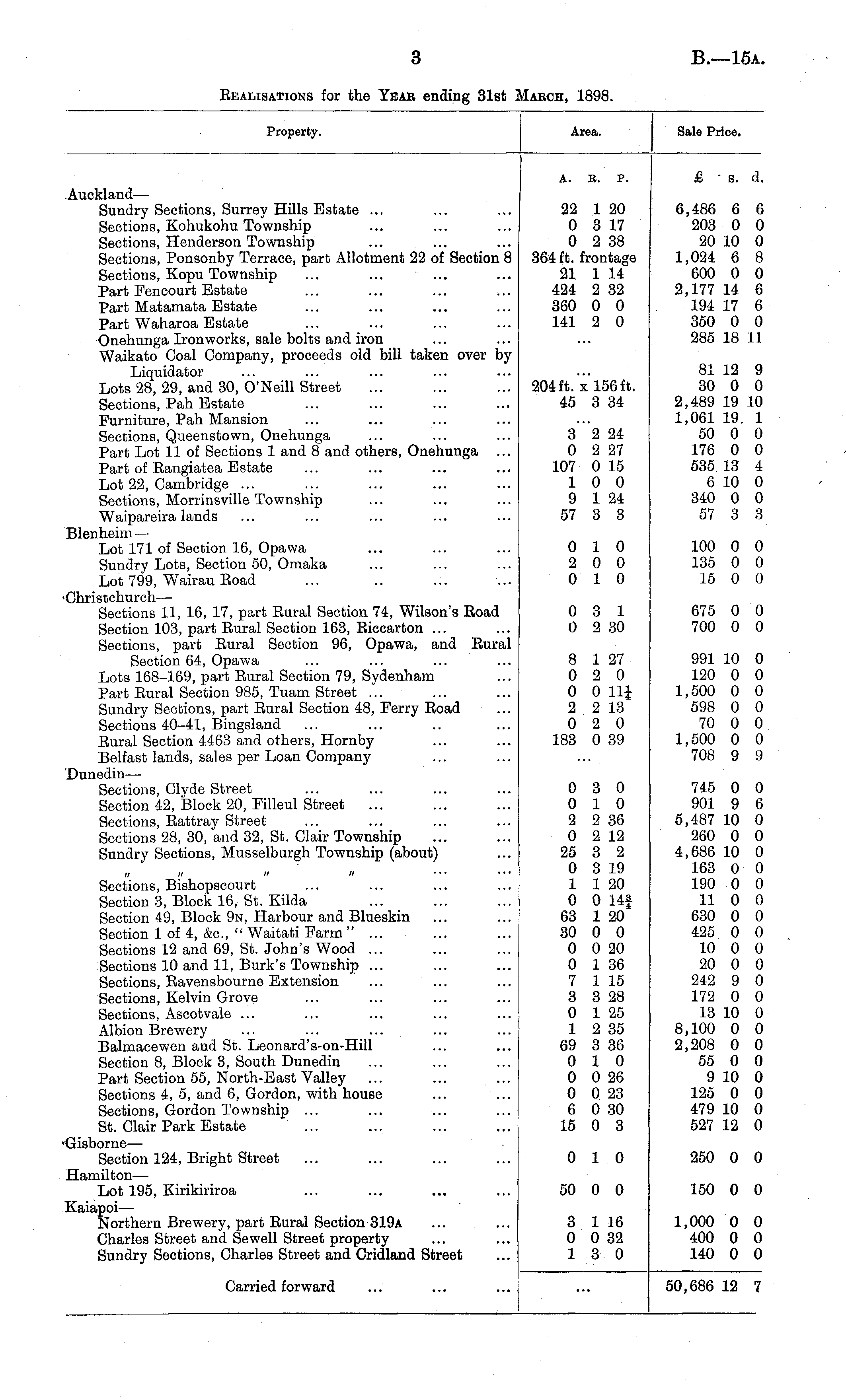 Property. Area. Sale Price. A. B. P. £ s. d. Auckland — Sundry Sections, Surrey Hills Estate ... Section s, Kohukohu Township Sections, Henderson Township Sections, Ponsonby Terrace, part Allotment 22 of Section 8 Sections, Kopu Township ... ... ... Part Fen court Estate Part Matamata Estate Part Waharoa Estate Onehunga Ironworks, sale bolts and iron Waikato Coal Company, proceeds old bill taken over by Liquidator Lots 28, 29, and 30, O'Neill Street Sections, Pah Estate Furniture, Pah Mansion Sections, Queenstown, Onehunga Part Lot 11 of Sections 1 and 8 and others, Onehunga Part of Bangiatea Estate Lot 22, Cambridge ... Sections, Morrinsville Township Waipareira lands Blenheim— Lot 171 of Section 16, Opawa Sundry Lots, Section 50, Omaka Lot 799, Wairau Eoad 'Christchurch — Sections 11, 16, 17, part Eural Section 74, Wilson's Eoad Section 103, part Eural Section 163, Eiccarton ... Sections, part Bural Section 96, Opawa, and Eural Section 64, Opawa Lots 168-169, part Bural Section 79, Sydenham Part Bural Section 985, Tuam Street ... Sundry Sections, part Eural Section 48, Ferry Eoad Sections 40-41, Bingsland Eural Section 4463 and others, Hornby Belfast lands, sales per Loan Company Dunedin — Sections, Clyde Street Section 42, Block 20, Filleul Street ... Sections, Battray Street Sections 28, 30, and 32, St. Clair Township Sundry Sections, Musselburgh Township (about) 22 1 20 0 3 17 0 2 38 364 ft. frontage 21 1 14 424 2 32 360 0 0 141 2 0 204 ft. x 156 ft. 45 3 34 3 2 24 0 2 27 107 0 15 10 0 9 1 24 57 3 3 6,486 6 6 203 0 0 20 10 0 1,024 6 8 600 0 0 2,177 14 6 194 17 6 350 0 0 285 18 11 81 12 9 30 0 0 2,489 19 10 1,061 19 1 50 0 0 176 0 0 535 13 4 6 10 0 340 0 0 57 3 3 0 10 2 0 0 0 10 100 0 0 135 0 0 15 0 0 0 3 1 0 2 30 675 0 0 700 0 0 8 1 27 0 2 0 0 0 Hi 2 2 13 0 2 0 183 0 39 991 10 0 120 0 0 1,500 0 0 598 0 0 70 0 0 1,500 0 0 708 9 9 „ ,/ n if Sections, Bishopscourt Section 3, Block 16, St. Kilda Section 49, Block 9n, Harbour and Blueskin Section 1 of 4, &c, " Waitati Farm " ... Sections 12 and 69, St. John's Wood ... Sections 10 and 11, Burk's Township ... Sections, Bavensbourne Extension Sections, Kelvin Grove Sections, Ascotvale ... Albion Brewery Balmacewen and St. Leonard's-on-Hill Section 8, Block 3, South Dunedin Part Section 55, North-East Valley Sections 4, 5, and 6, Gordon, with house ... ... Sections, Gordon Township ... St. Clair Park Estate 0 3 0 0 10 2 2 36 0 2 12 25 3 2 0 3 19 1 1 20 0 0 14f 63 1 20 30 0 0 0 0 20 0 1 36 7 1 15 3 3 28 0 1 25 1 2 35 69 3 36 0 10 0 0 26 0 0 23 6 0 30 15 0 3 745 0 0 901 9 6 5,487 10 0 260 0 0 4,686 10 0 163 0 0 190 0 0 11 0 0 630 0 0 425 0 0 10 0 0 20 0 0 242 9 0 172 0 0 13 10 0 8,100 0 0 2,208 0 0 55 0 0 9 10 0 125 0 0 479 10 0 527 12 0 'Gisborne — Section 124, Bright Street Hamilton — Lot 195, Kirikiriroa Kaiapoi— Northern Brewery, part Eural Section 319a Charles Street and Sewell Street property Sundry Sections, Charles Street and Cridland Street 0 10 50 0 0 250 0 0 150 0 0 3 1 16 0 0 32 1 3 0 1,000 0 0 400 0 0 140 0 0 Carried forward 50,686 12 7