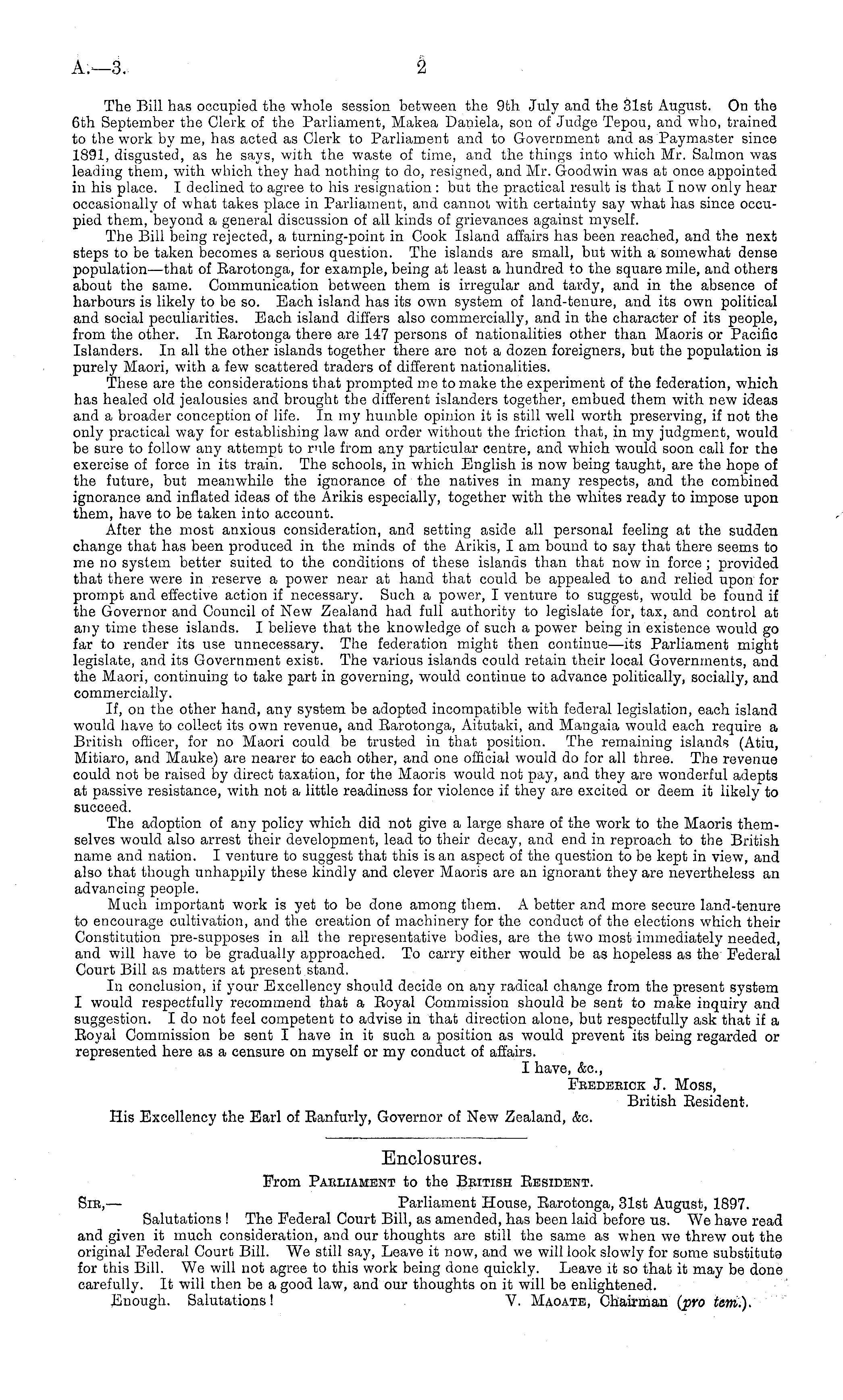 Enclosures. From Parliament to the British Eesident. Sic, — Parliament House, Earotonga, 31st August, 1897. Salutations ! The Federal Court Bill, as amended, has been laid before us. We have read and given it much consideration, and our thoughts are still the same as when we threw out the original Federal Court Bill. We still say, Leave it now, and we will look slowly for some substitute for this Bill. We will not agree to this work being done quickly. Leave it so that it may be done carefully. It will then be a good law, and our thoughts on it will be enlightened. Enough. Salutations! V. Maoatb, Chairman (pro tet)i.).