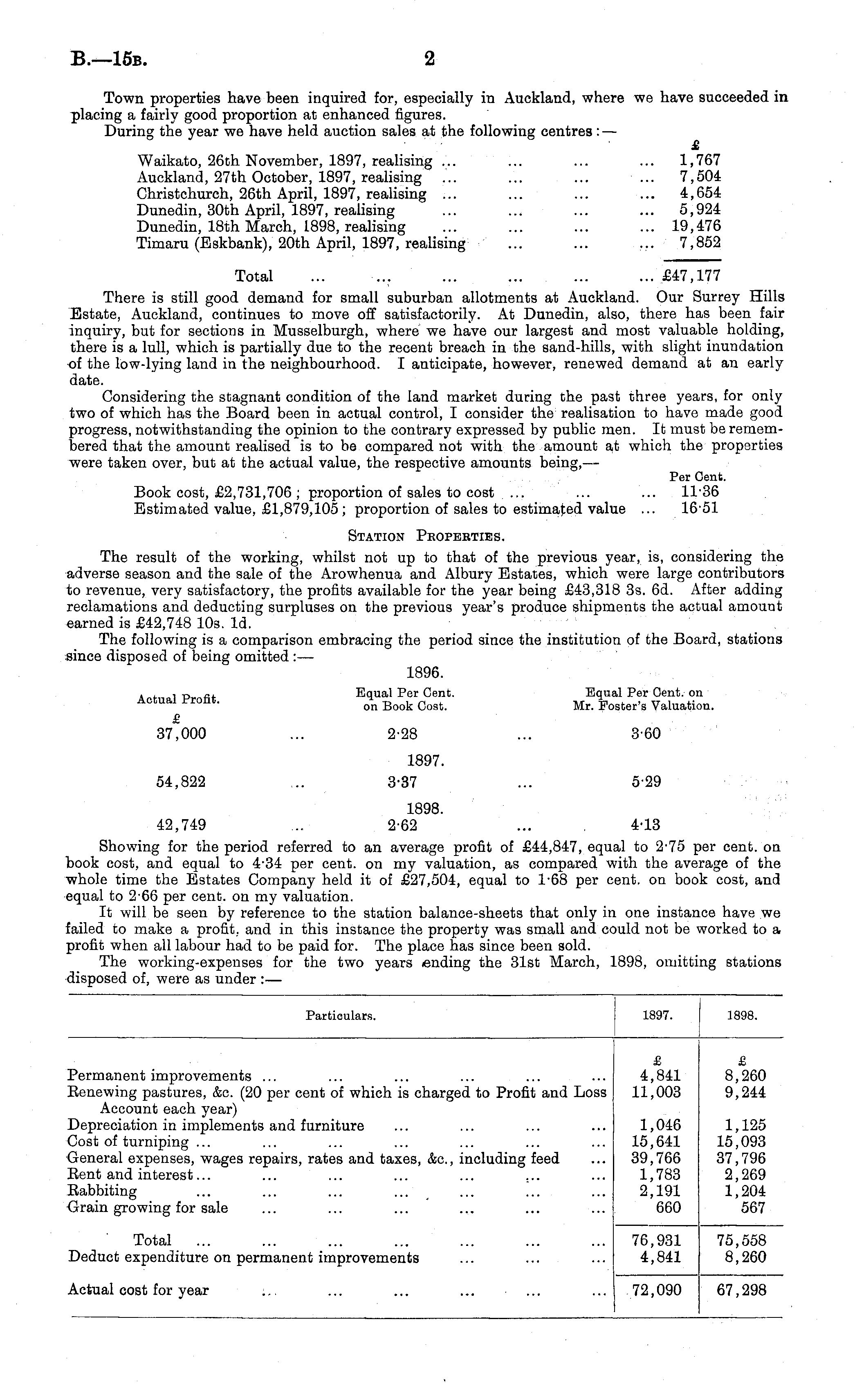 Town properties have been inquired for, especially in Auckland, where we have succeeded in placing a fairly good proportion at enhanced figures. During the year we have held auction sales at the following centres : — £ Waikato, 26th November, 1897, realising ... ... ... ... 1,767 Auckland, 27th October, 1897, realising ... ... ... ... 7,504 Christchurch, 26th April, 1897, realising ... ... ... ... 4,654 Dunedin, 30th April, 1897, realising ... ... ... ... 5,924 Dunedin, 18th March, 1898, realising ... ... ... ... 19,476 Timaru (Eskbank), 20th April, 1897, realising ... ... ... 7,852 Total ... ... £47,177 There is still good demand for small suburban allotments at Auckland. Our Surrey Hills Estate, Auckland, continues to move off satisfactorily. At Dunedin, also, there has been fair inquiry, but for sections in Musselburgh, where we have our largest and most valuable holding, there is a lull, which is partially due to the recent breach in the sand-hills, with slight inundation of the low-lying land in the neighbourhood. I anticipate, however, renewed demand at an early date. Considering the stagnant condition of the land market during the past three years, for only two of which has the Board been in actual control, I consider the realisation to have made good progress, notwithstanding the opinion to the contrary expressed by public men. It must be remembered that the amount realised is to be compared not with the amount at which the properties were taken over, but at the actual value, the respective amounts being,— Per Cent. Book cost, £2,731,706 ; proportion of sales to cost ... ... ... 1T36 Estimated value, £1,879,105; proportion of sales to estimated value ... 1651 Station Peopebties. The result of the working, whilst not up to that of the previous year, is, considering the adverse season and the sale of the Arowhenua and Albury Estates, which were large contributors to revenue, very satisfactory, the profits available for the year being £43,318 3s. 6d. After adding reclamations and deducting surpluses on the previous year's produce shipments the actual amount earned is £42,748 10s. Id. The following is a comparison embracing the period since the institution of the Board, stations since disposed of being omitted : — 1896. . . i p fi t Equal Per Cent. Equal Per Cent, on Actual rront. on Book - oat _ Mr _ Foster . g Valuation. £ 37,000 ... 2-28 ... 360 1897. 54,822 ... 3-37 ... 5-29 1898. 42,749 ... 2-62 ... 4-13 Showing for the period referred to an average profit of £44,847, equal to 275 per cent, on book cost, and equal to 4-34 per cent, on my valuation, as compared with the average of the whole time the Estates Company held it of £27,504, equal to L6B per cent, on book cost, and equal to 2-66 per cent, on my valuation. It will be seen by reference to the station balance-sheets that only in one instance have we failed to make a profit, and in this instance the property was small and could not be worked to a profit when all labour had to be paid for. The place has since been sold. The working-expenses for the two years ending the 31st March, 1898, omitting stations disposed of, were as under :—